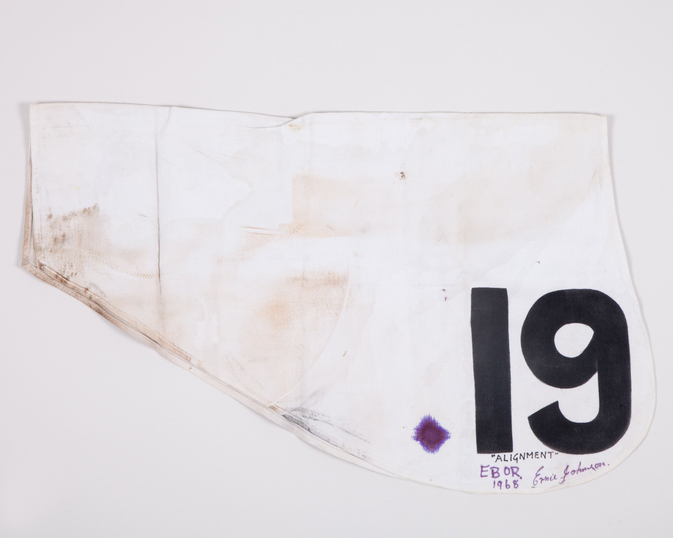 signed by the winning jockey Ernie Johnson and inscribed “ALIGNMENT”, EBOR, 1968, white cloth with black No.19
