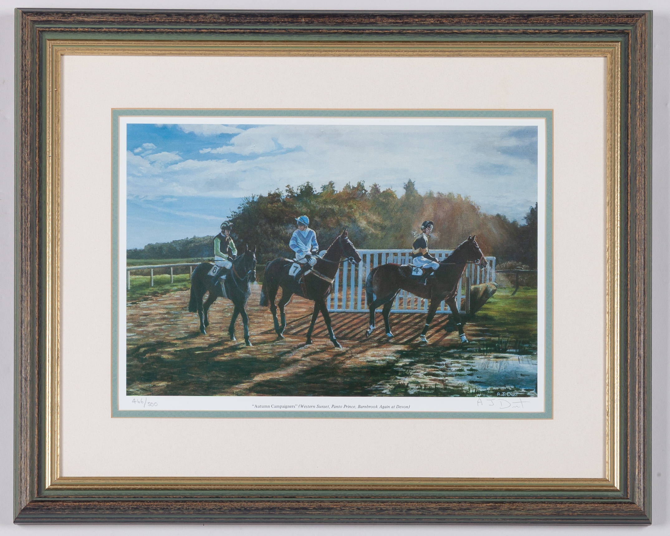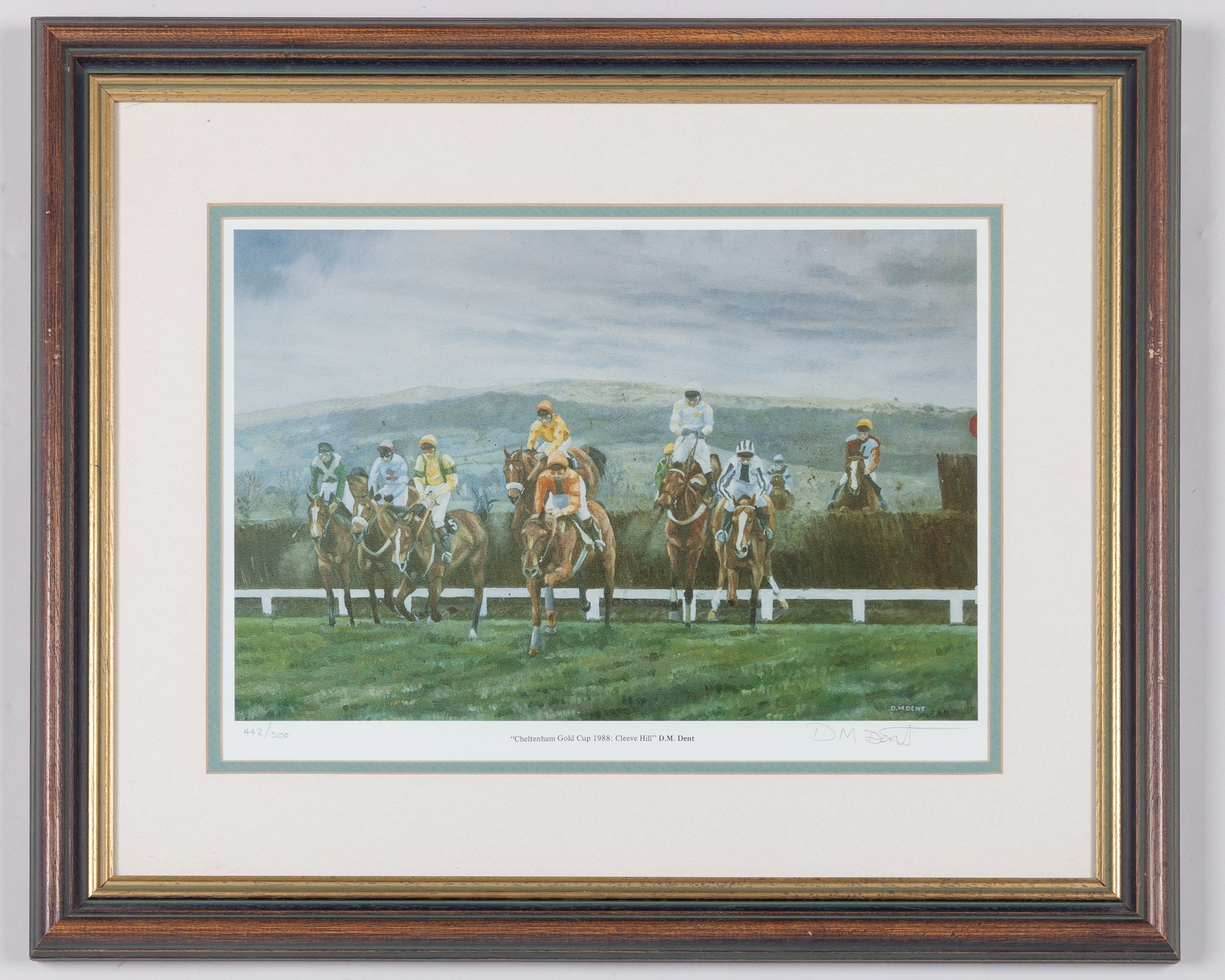 each signed by the artist brothers, two by David Dent (British, b.1959) comprising ‘Out of the Chepstow Fog’ featuring West Tip, Burrough Hill Lad and Wayward Lad, numbered 457/500, and ‘Cheltenham Gold Cup 1988, Cleeve Hill’, numbered 442/500; and an Adrian Dent (British, b.1966) titled ‘Autumn Campaigners (Western Sunset, Panto Prince, Barnbrook Again at Devon’, numbered 466/500, uniformly mounted, framed & glazed, 44 by 55cm.