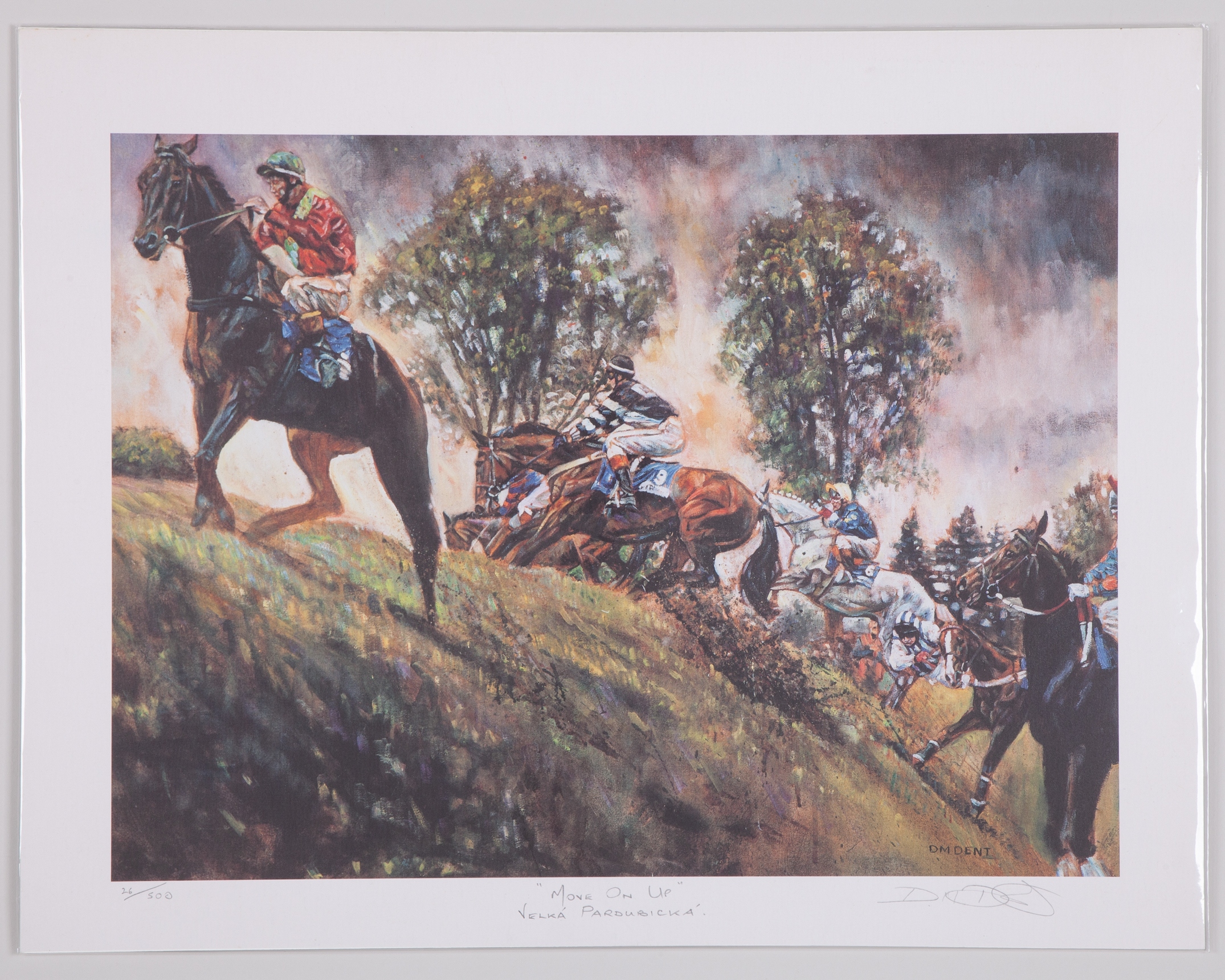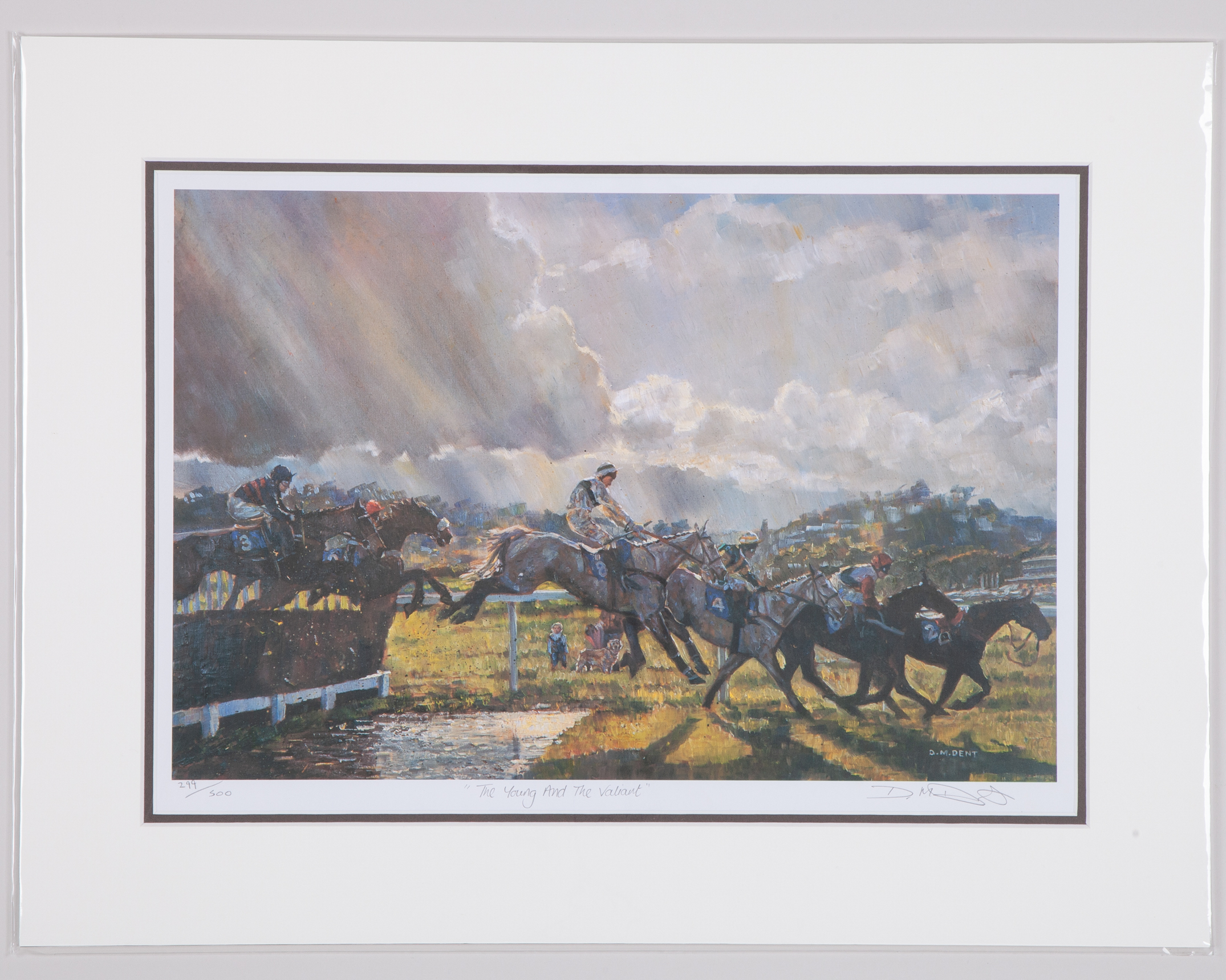 signed by the artist, the first titled; Move On Up Velka Pardubicka, 26/500, 55 by 43cm overall with the rest smaller, the second titled; Mistake at Becher's Brook: Grand National 1988, 224/500, mounted, the third titled; The Young and the Valiant, 244/500, mounted (3)