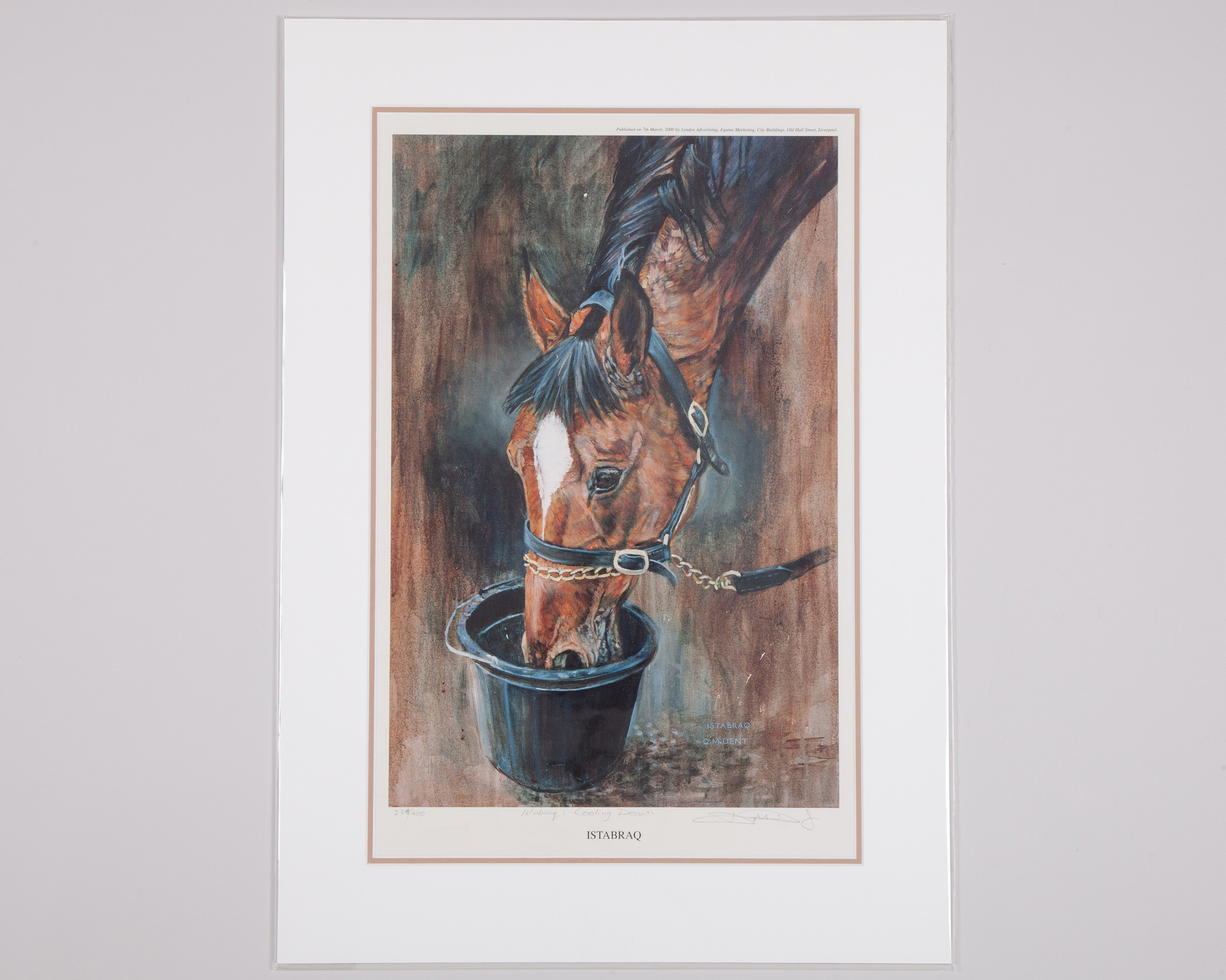 signed by the artist, the first by David Dent titled; The Irish Raider: Blitzkrieg at Ascot, AP17/20 (380), mounted, 68 by 49cm overall with the rest smaller, the second by both David and Adrian Dent titled; The Brave and The Bold The Martell Cup: Aintree, 158/380, the third by David Dent titled; Istabraq, 238/400, mounted (3)