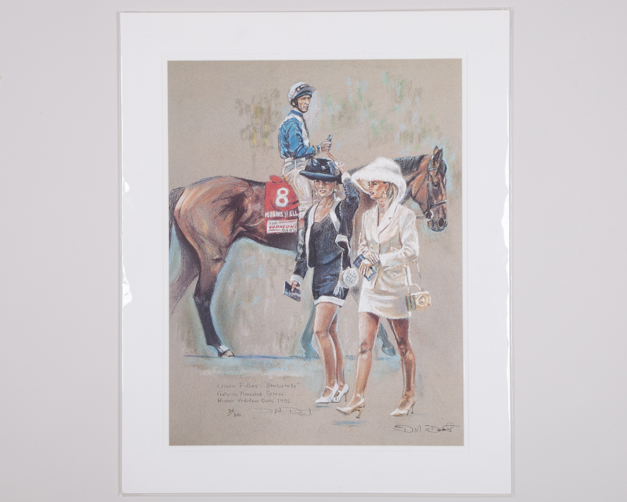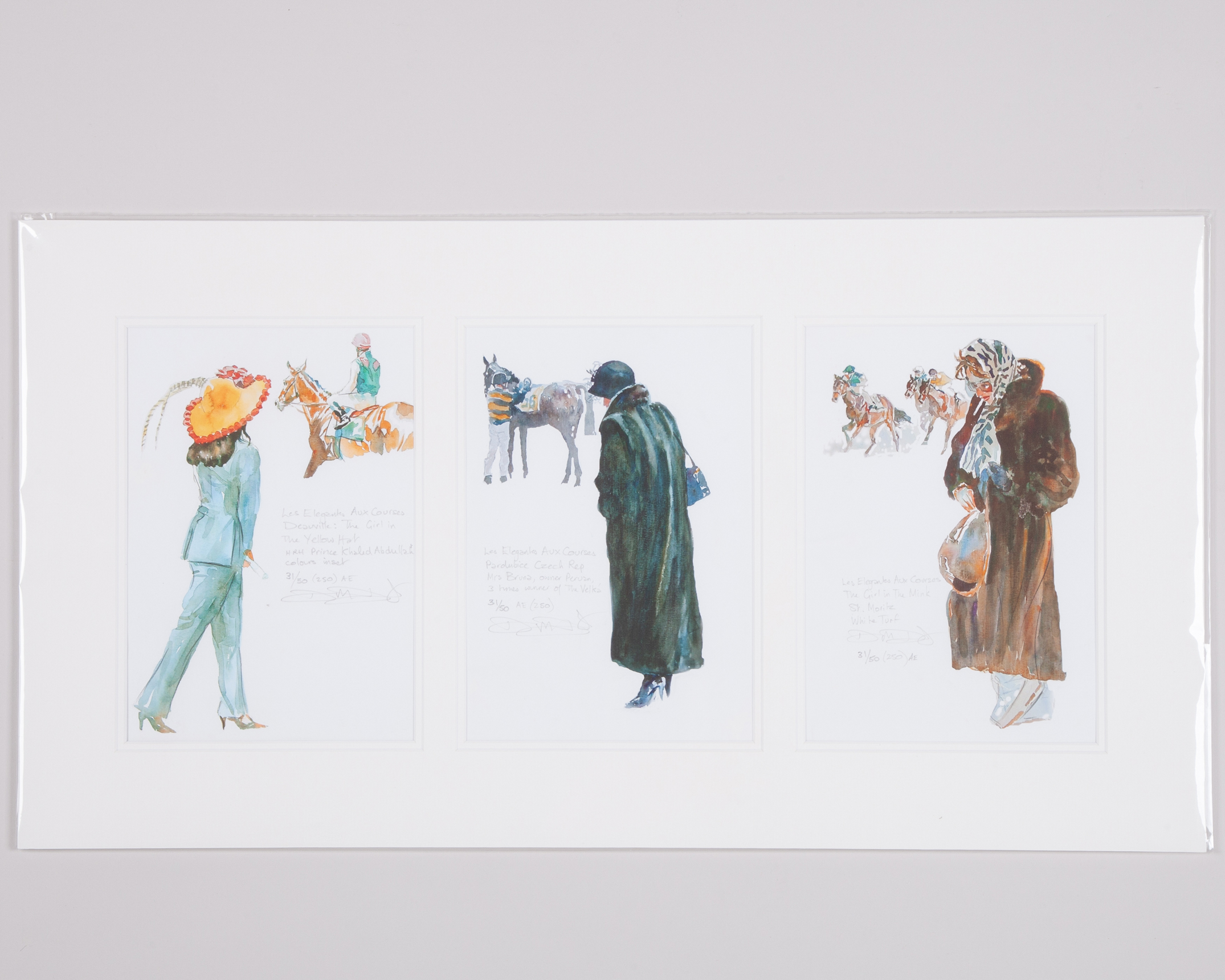 signed by the artist, the first titled; Classic Fillies: “Bombshells” Features Moonshell, Epsom Winner Vodafone Oaks 1995, 725/850, mounted 48 by 60cm overall, the second a trio of mounted prints with the following titles; Deauville: The Girl in The Yellow Hat, 31/50AE (250); Pardubice Czech Rep, 31/50AE (250); The Girl in The Mink St. Moritz, 31/50AE (250), 70 by 38cm (2)