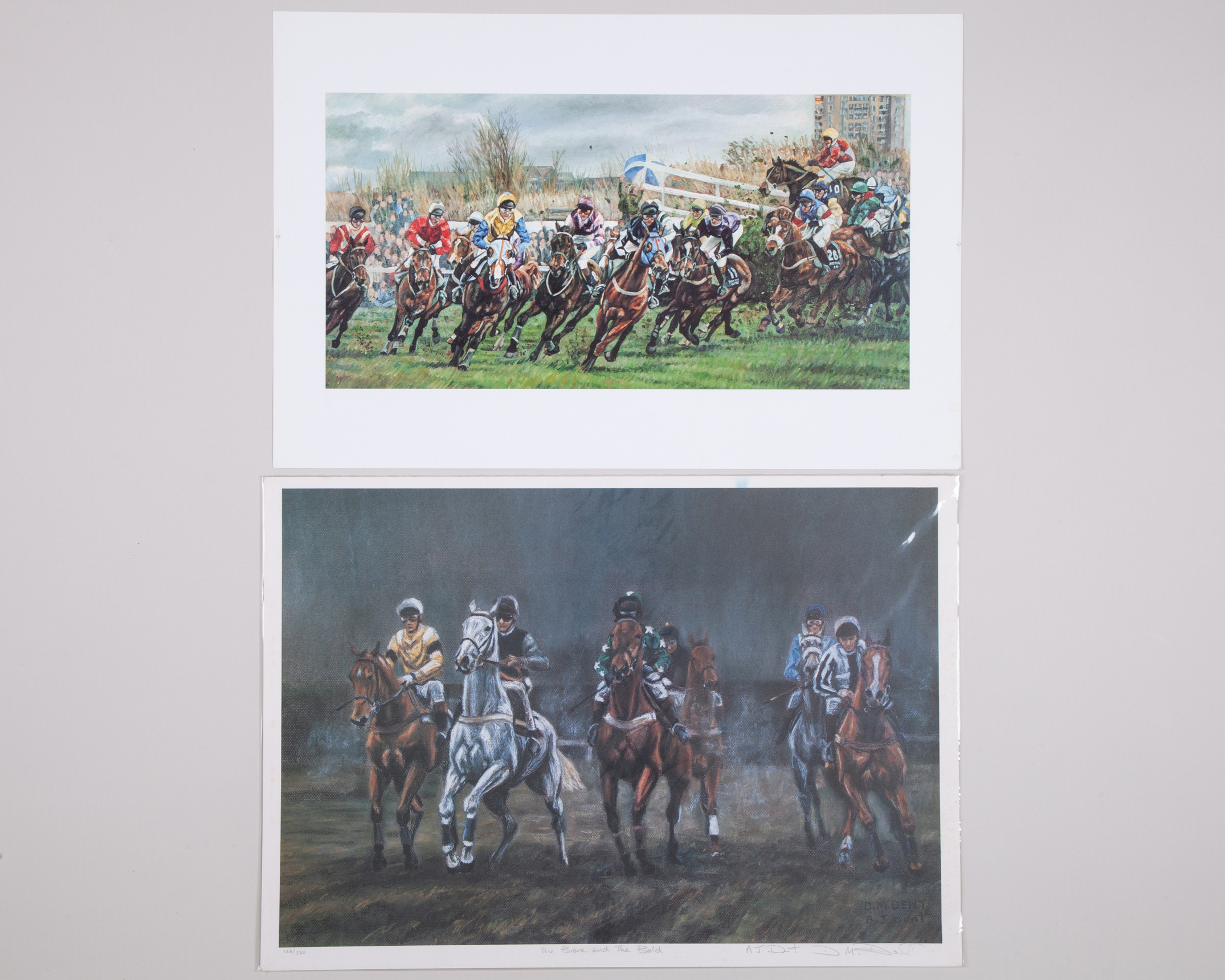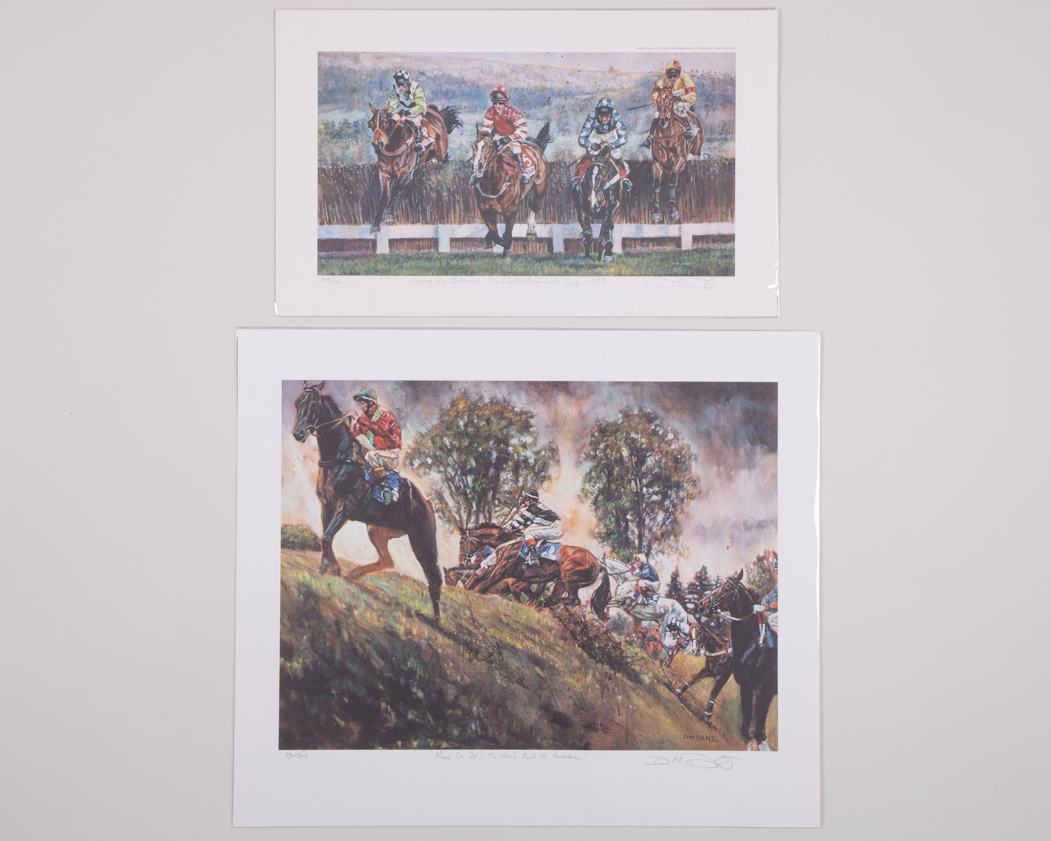 the first a collaboration between the brothers, signed and titled; The Brave and The Bold, 166/380, 65 by 45cm with the rest smaller, the second signed David Dent titled; Move on up! The Irish Bank at Pardubice, 39/500, the third signed by David Dent titled; Doing The Business: The Cheltenham Gold Cup 1999, 308/500, the forth depicting a competitive jump and turn is an unsigned work by Adrian Dent