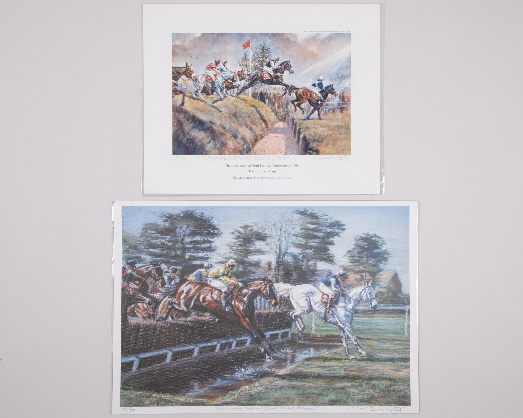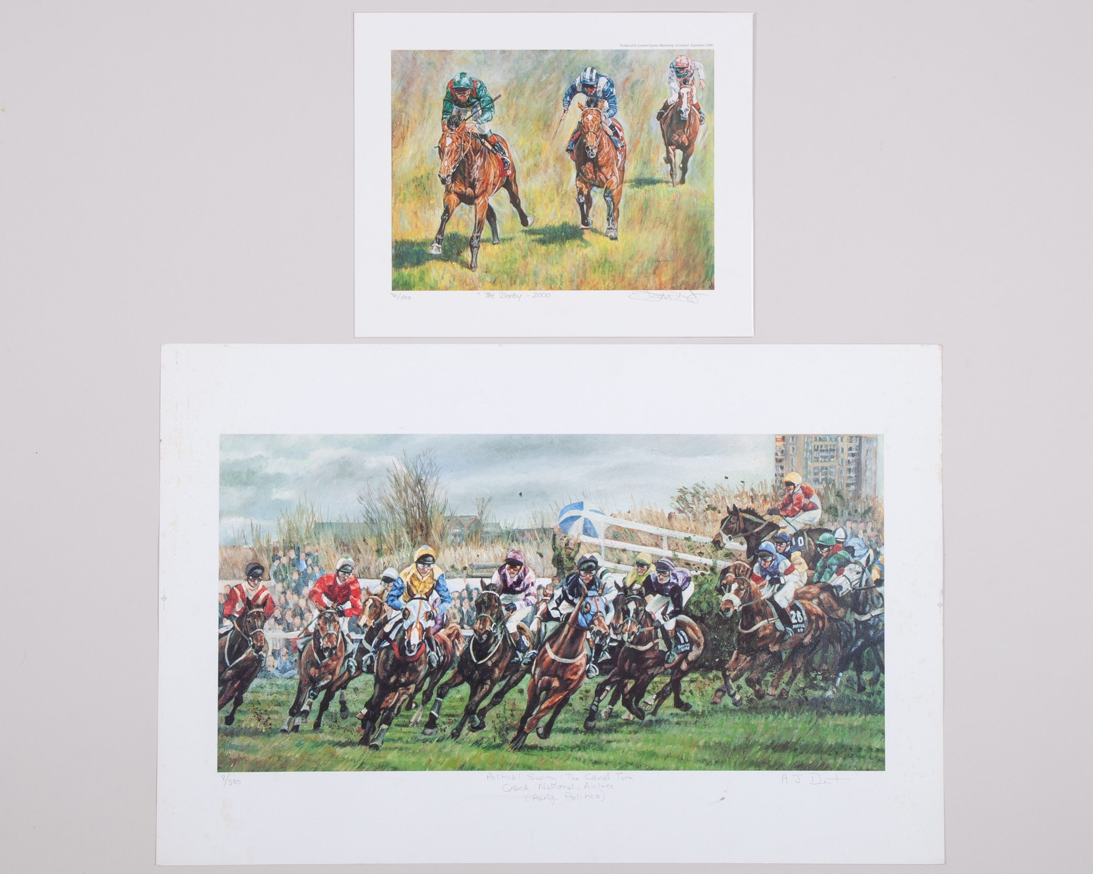 the first a collaboration by the brothers signed by Adrian and David titled; Over The Water, Sandown (Desert Orchid Whitbread), 380/380, 64 by 45cm with the rest smaller, the second signed by David titled; The Irish National Hunt Festival, Punchestown 1998, 312/750, the third signed by David titled; The Derby - 2000, 76/500, the fourth signed by Adrian titled; Political Swing: The Casual Turn Grand National, Aintree, 8/380 (4)