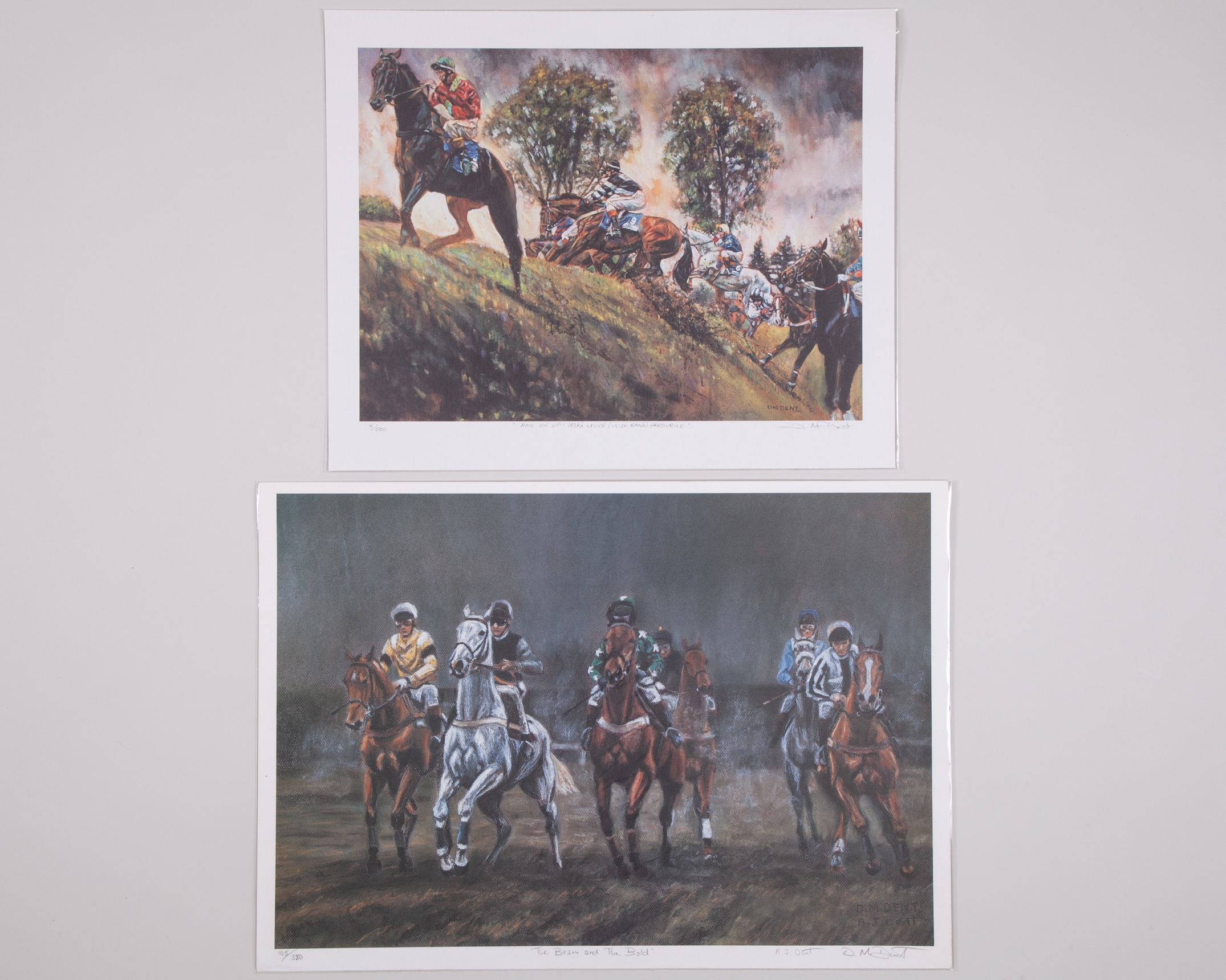 the first signed by Adrian titled; The Canal Turn: Party Politics Grand National, 298/380, the second signed by David titled; Doing The Business: The Cheltenham Gold Cup, 5/20AP (500), the third a collaboration by the brothers signed by Adrian and David titled; The Brave and The Bold, 105/380, 65 by 45cm with the rest smaller, the forth signed by David titled; Move on up! Irska Lavice (Irish Bank) Paradubice, 9/500 (4)