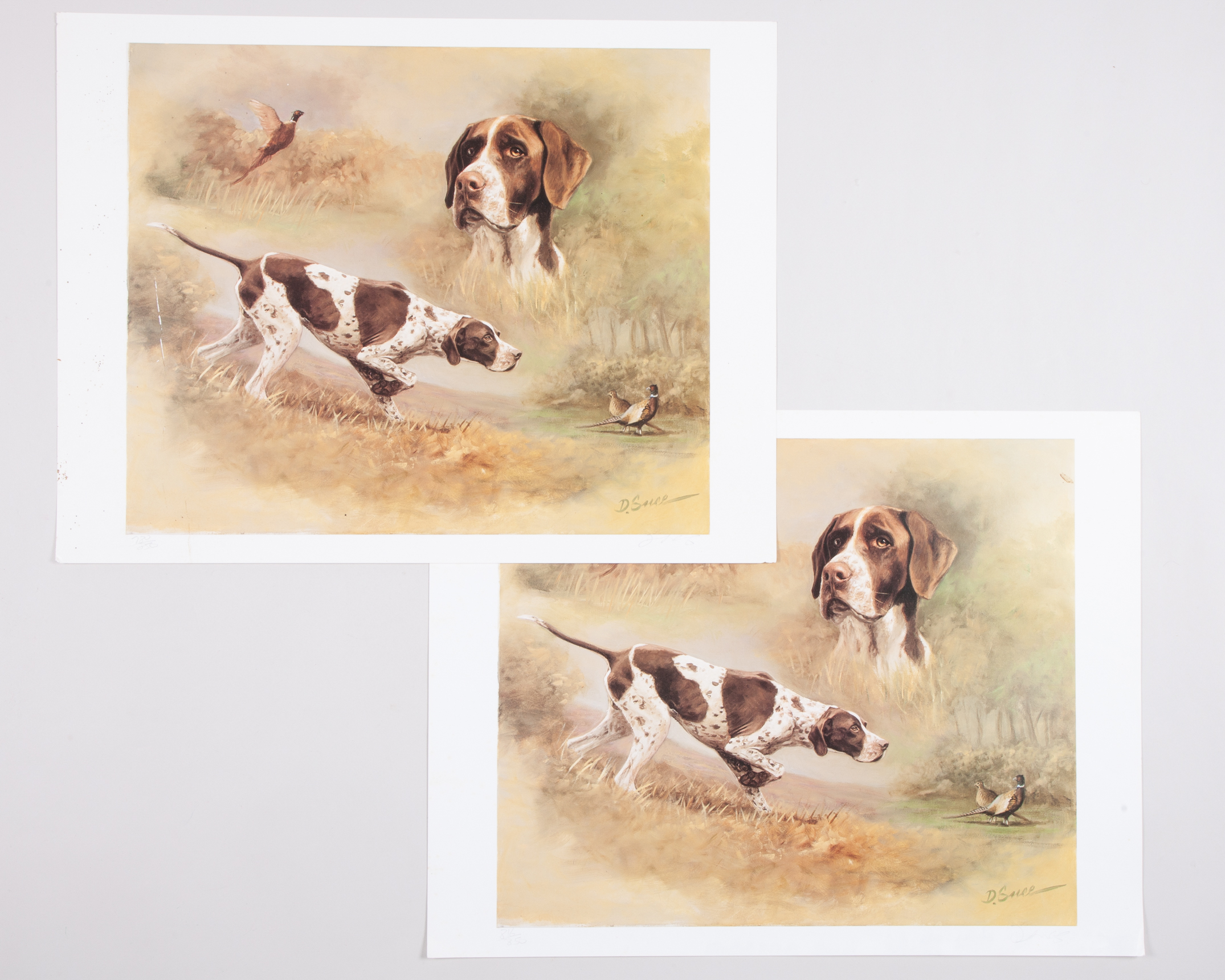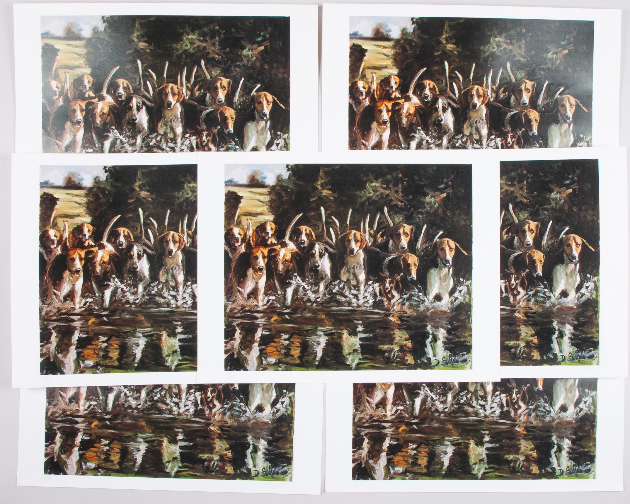 two prints from the same edition by Desmond Snee (Irish, 1957-2005) featuring retrievers and pheasants, both signed by the artist numbers 780 & 816 from the edition of 850; and seven prints from the same edition of 850 featuring foxhounds, all numbered; sold together with a Sir Alfred Munnings republish , portrait of Major T. Bouch with the Belvoir Hounds, various sizes, the largest 63 byb75cm. (10 items)