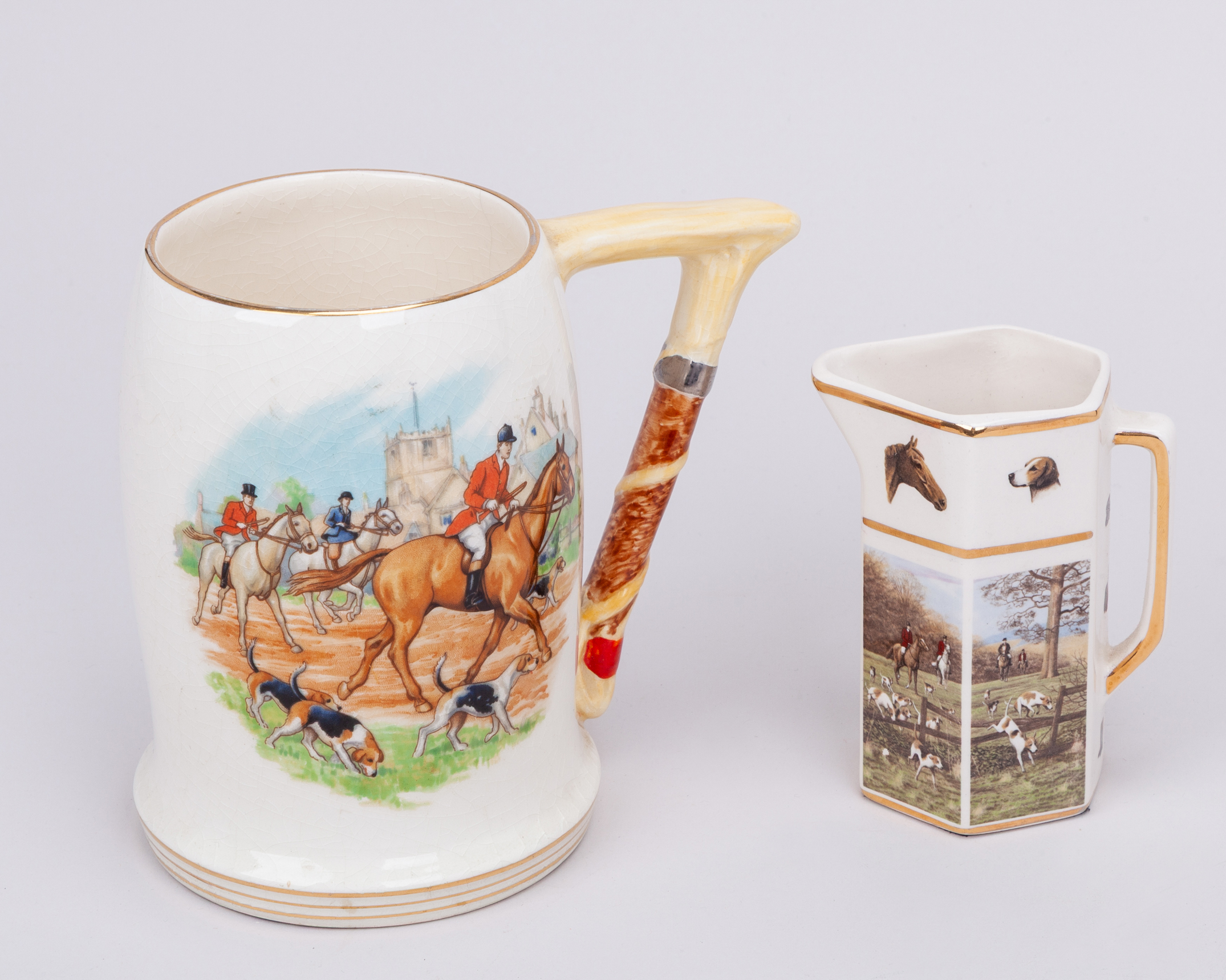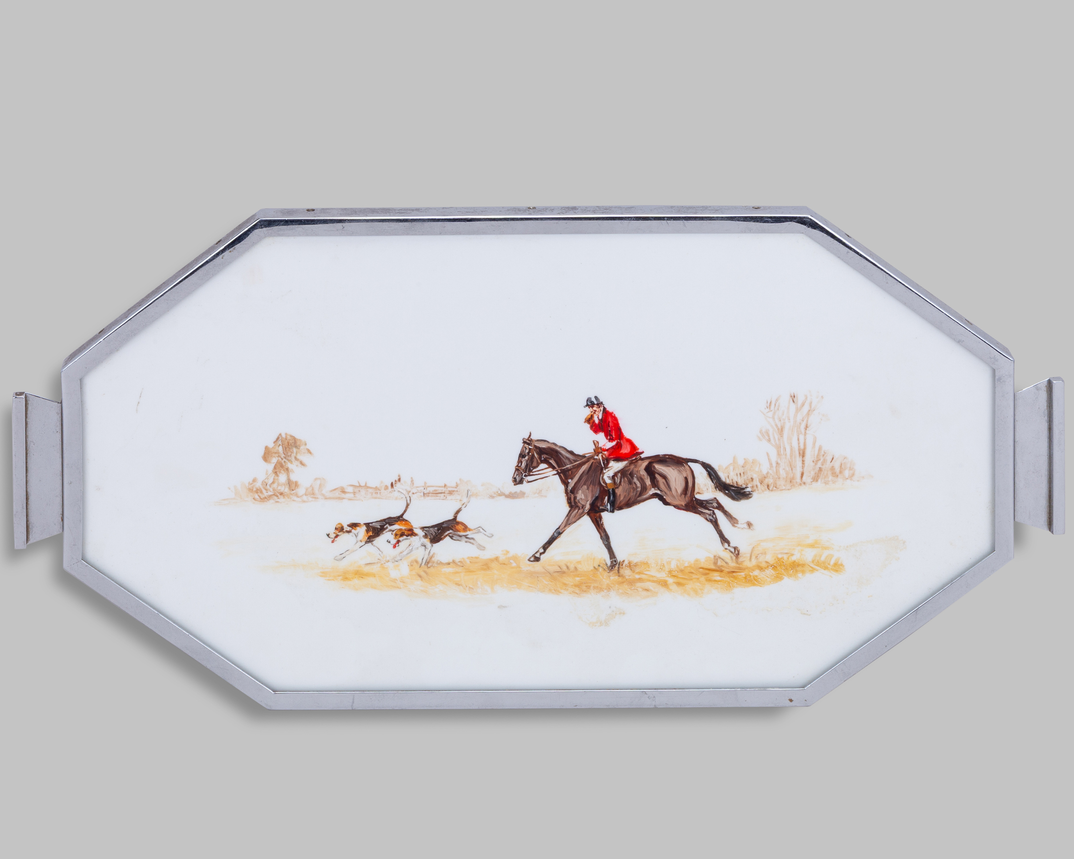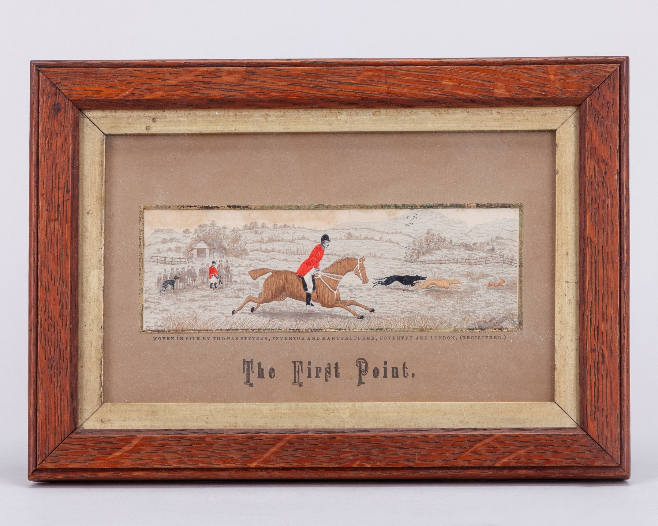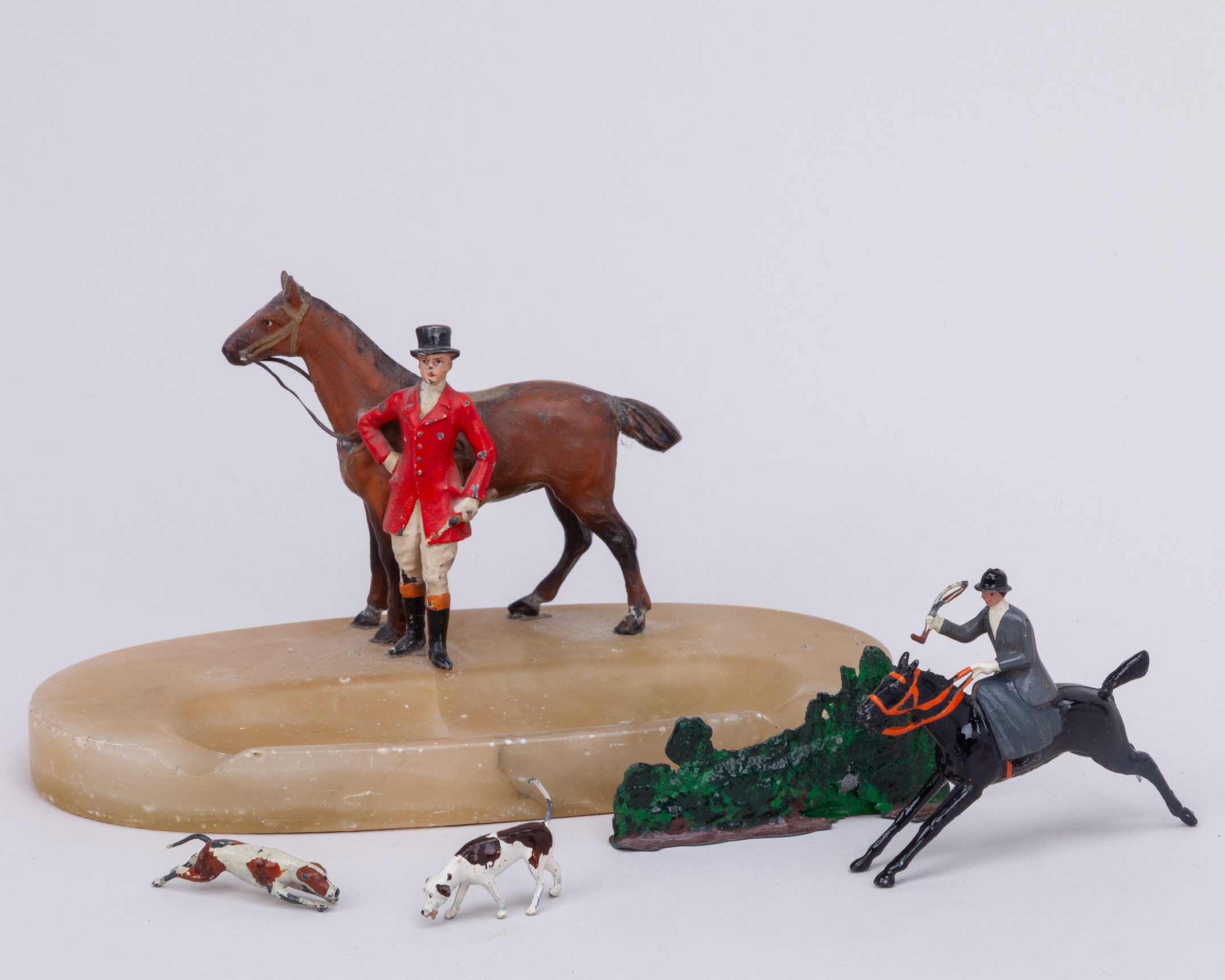 porcelain drinks tray with horse and hounds decoration, white metal frame and handles, length 54cm.; pottery jug with hunting decoration, musical box movement; china water jug by Pointers of London and Edinburgh, fox hunting scene; silk woven Stevengraph picture c.1860 titled 'The First Point, framed & glazed; marble ashtray mounted with spelter models of a huntsman and his horse; and four fox hunting themed items made by Britains, mounted huntswoman, two foxhounds and a hedging jump