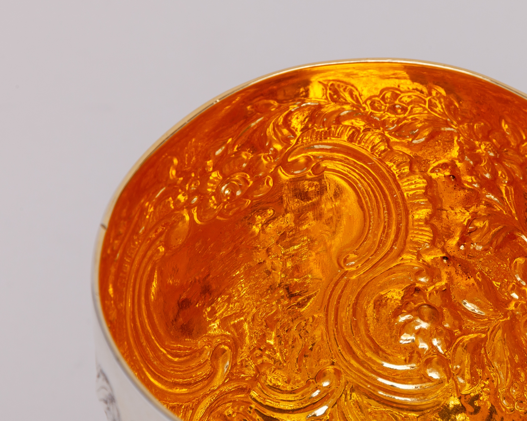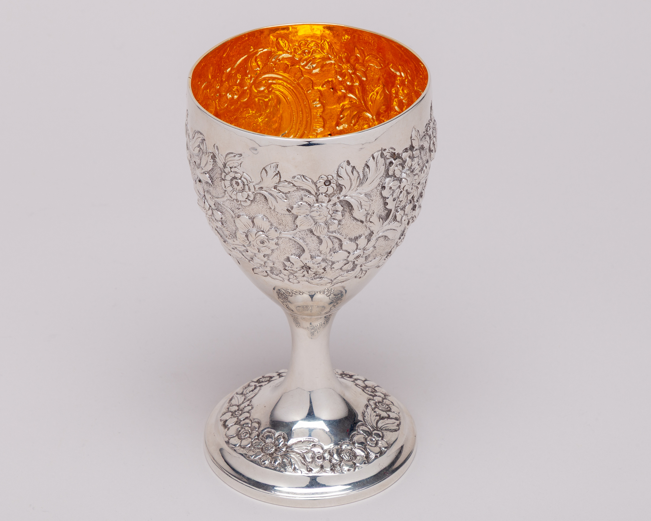 in the form of a silver goblet, gilt interior, hallmarks partially obscured by added weight to the base, inscribed CURRAGH DIVISION RACES, 1st FLAT RACE, 18th ROYAL IRISH, JULY 1st 1857, also with the winning rider's name, partially rubbed, possibly Pocklington, 16cm., weight 354gr.