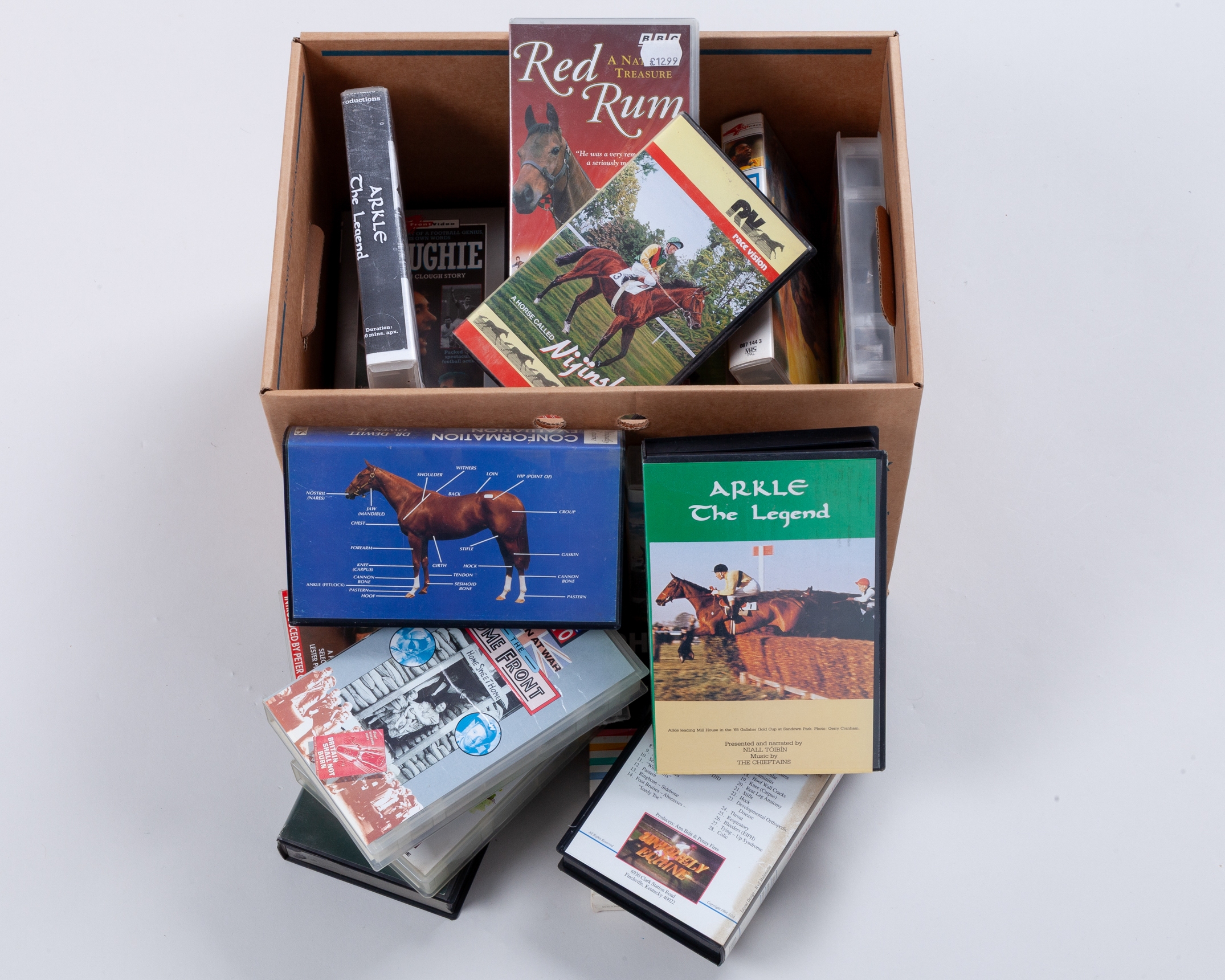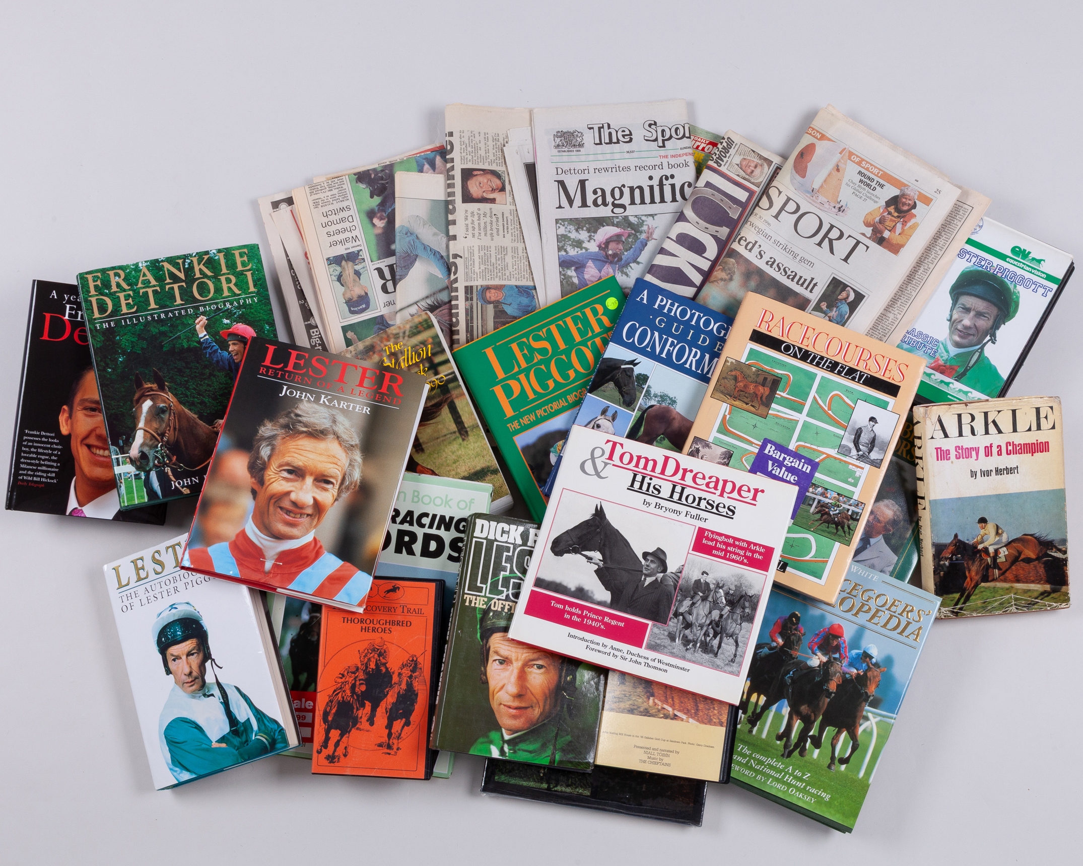 including two signed copies of Lester Piggott's autobiography (both with dedications) and the Dick Francis biography of Lester double-signed by the author and the jockey; the lot also including various souvenir newspapers for famous events in racing and a qty. of racing Videos (a qty.)