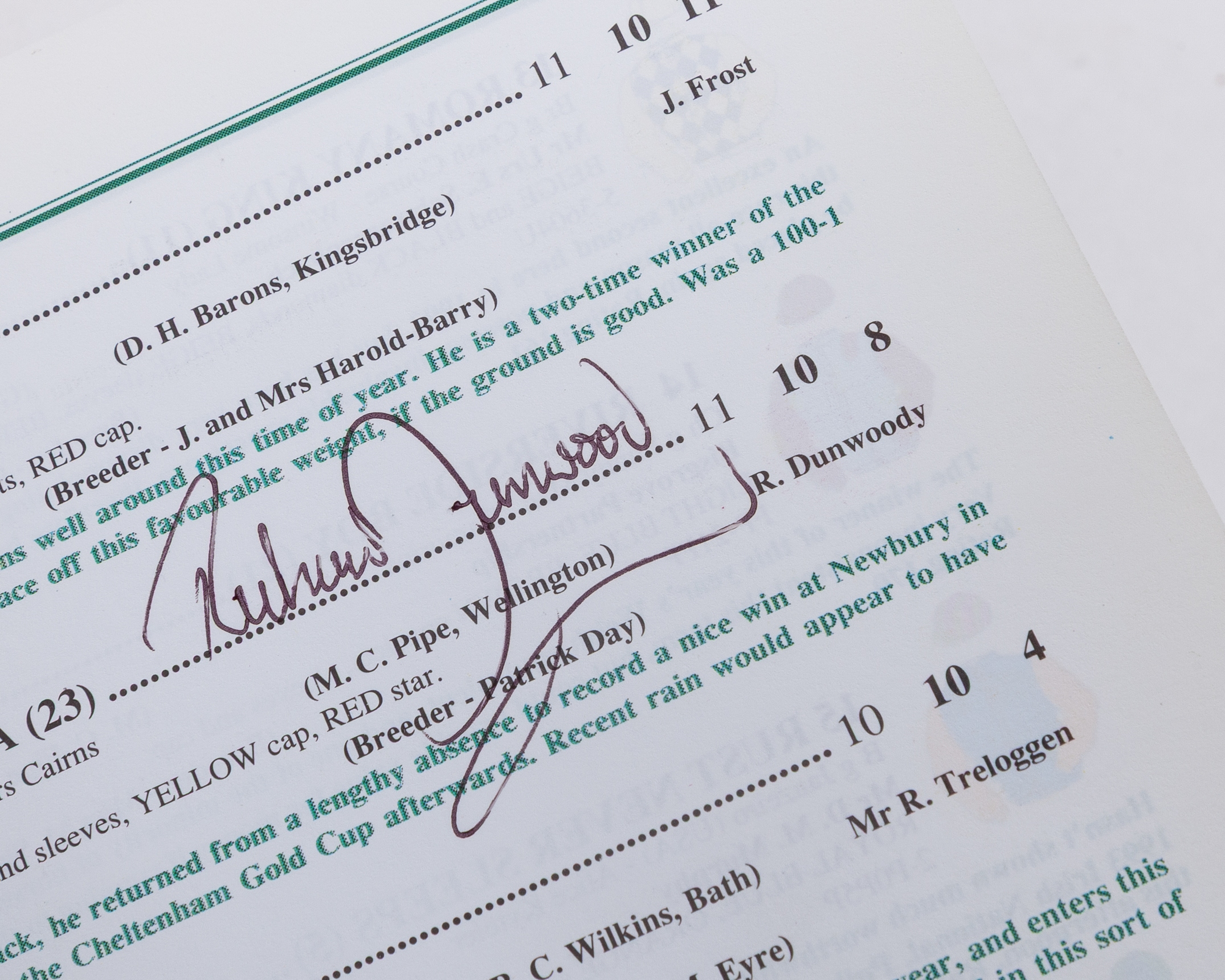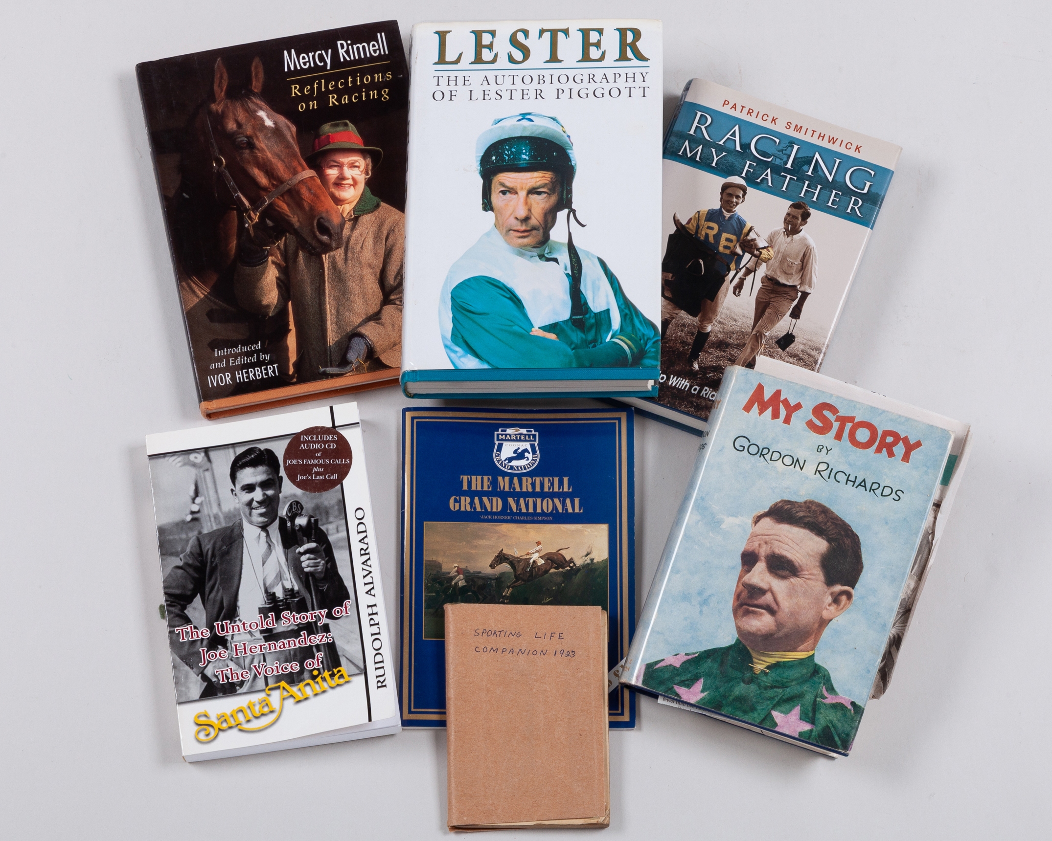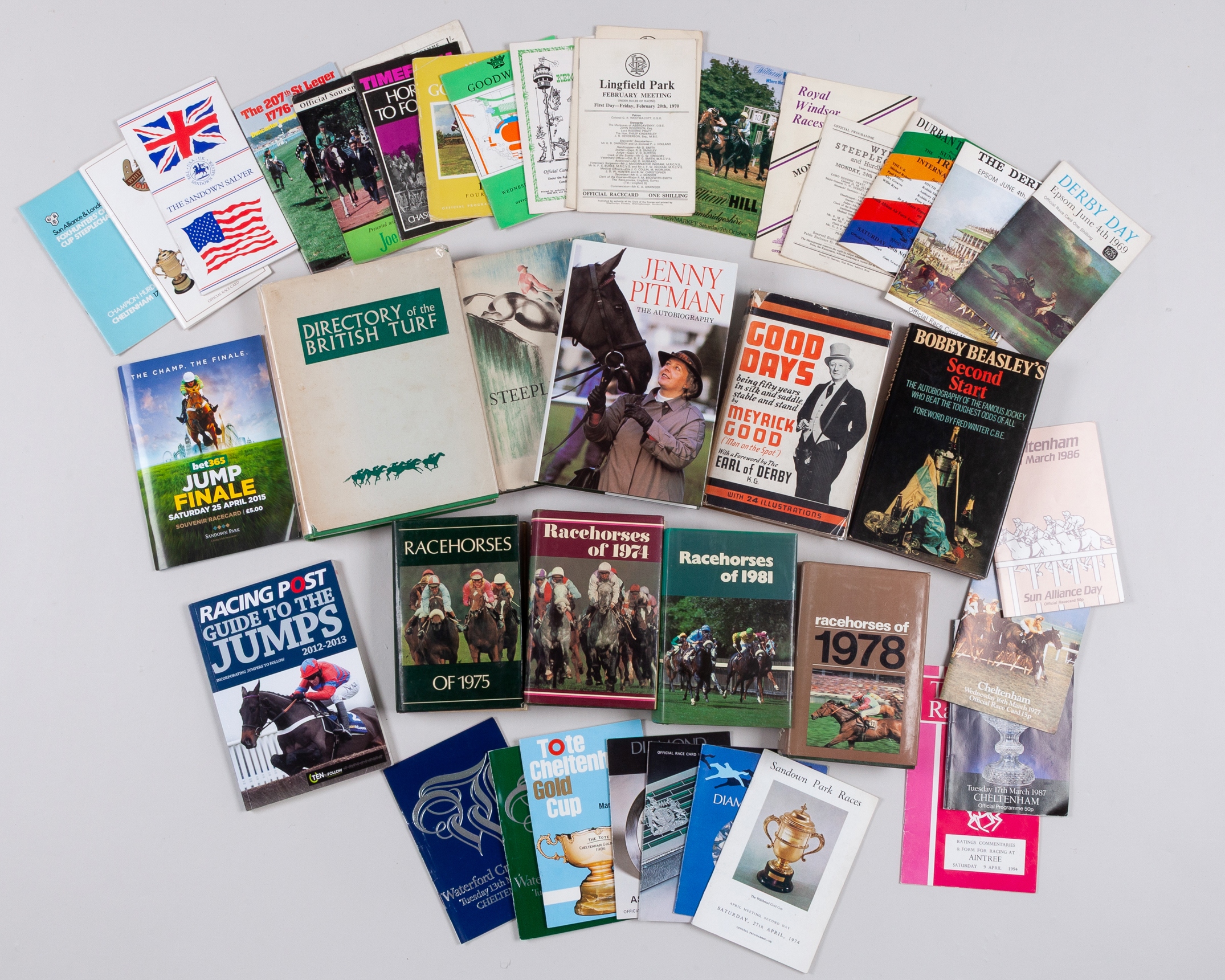 25+ horse racing programmes including 1969 and 1975 Derbys and the 1994 Grand National, a clean copy signed by Richard Dunwoody, also St Leger, Cheltenham Festival, Diamond Day at Ascot and defunct Wye; plus 20+ greyhound programmes, mostly Catford (including 4 from the 1950s) but also White City including 1974 and 1975 Greyhound Derbys, plus Harringay, Wembley and Oxford; racing books including Racehorses of … 1973/1974/1975/1978/1981, Meyrick Good, 'Good Days', Patrick Smithwick, 'Racing My Father' (inscribed to Dick Francis), Rudolf Alvarado, 'The Untold Story Of Joe Hernandez: The Voice Of Santa Anita' (signed by the author)' Lester Piggott Autobiography (signed) , Directory Of The British Turf (1960?) , Bobby Beasley: Second Start etc.; the selection of newspapers including 3 copies of Robert Sievier's 'The Winning Post' 1906/7 together with 30+ copies of The Sporting Life and The Racing Post from the 1970s onwards; the lot also including a photography exhibition poster featuring a sea of umbrellas at a very wet Epsom Derby in 1906 (a qty.)