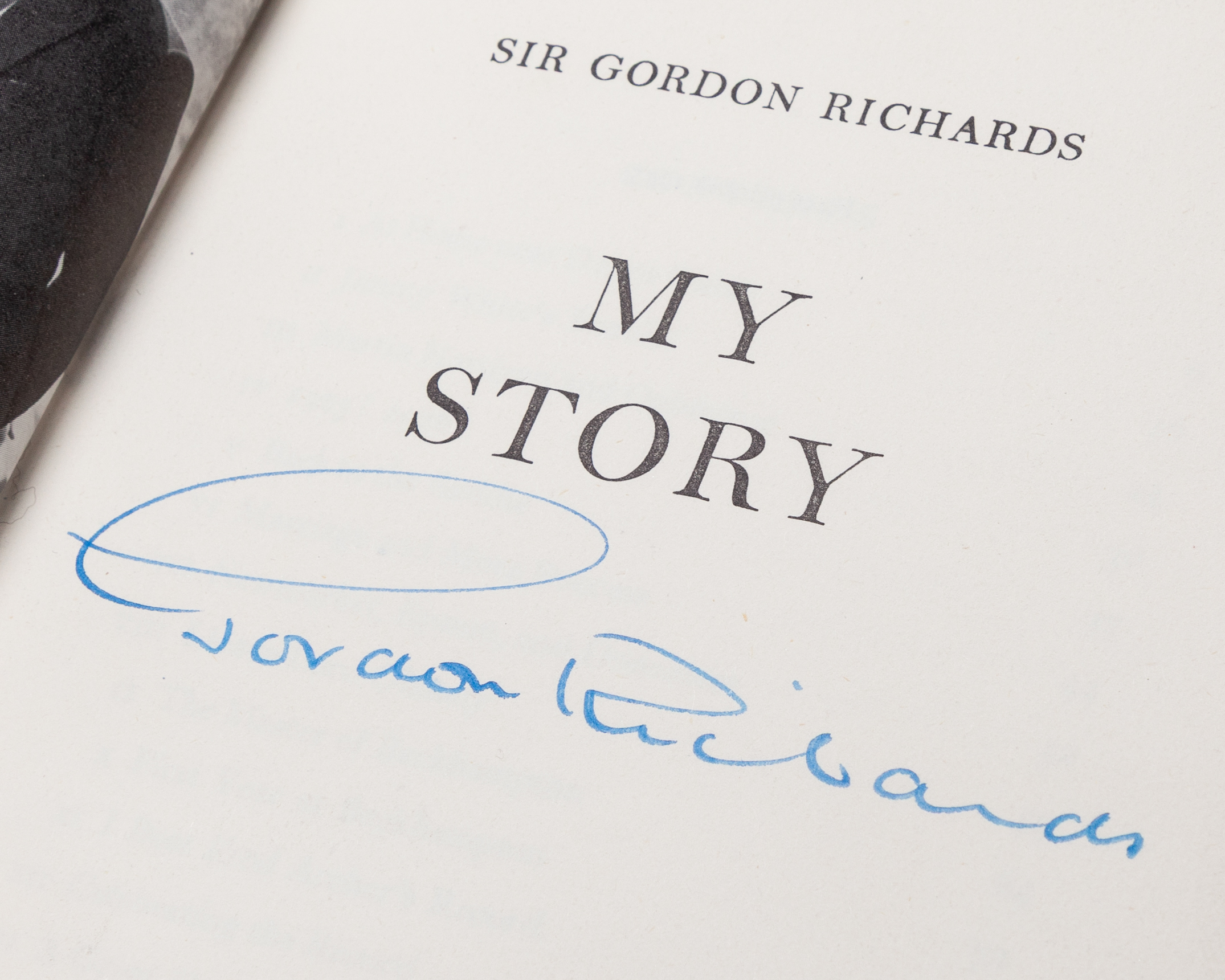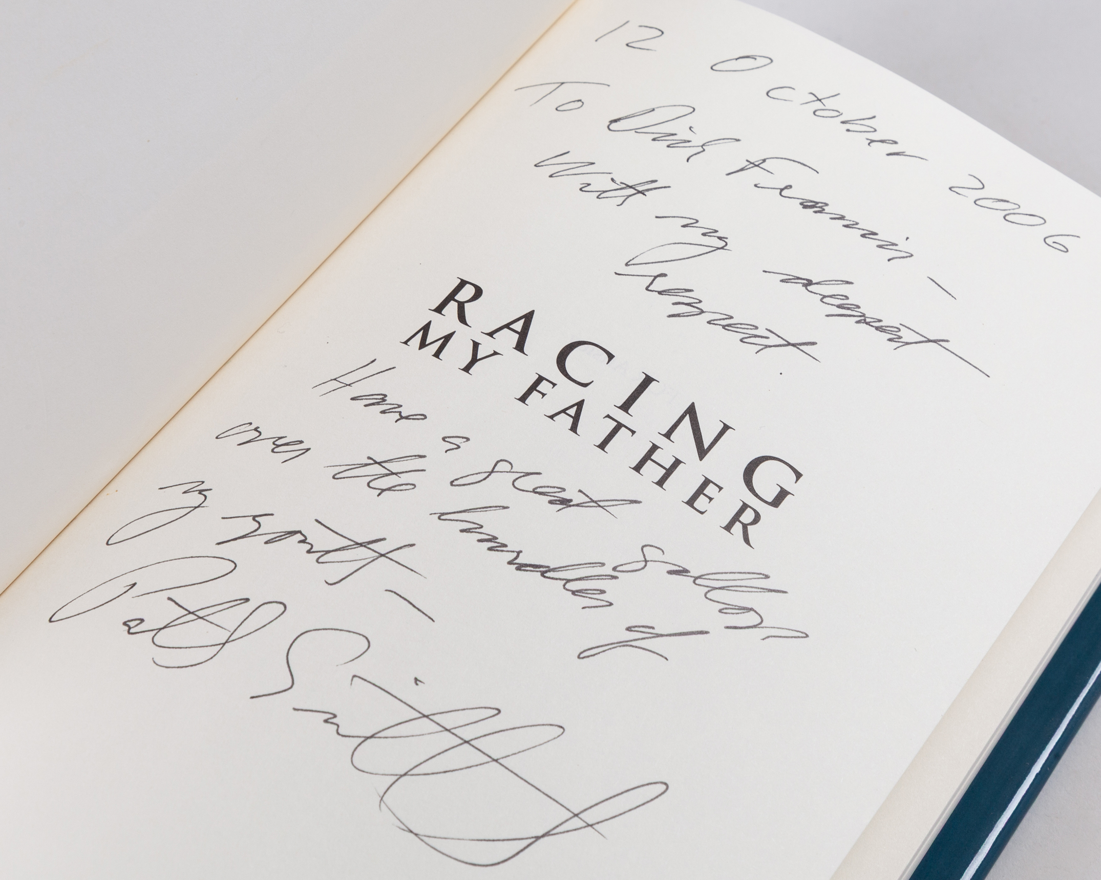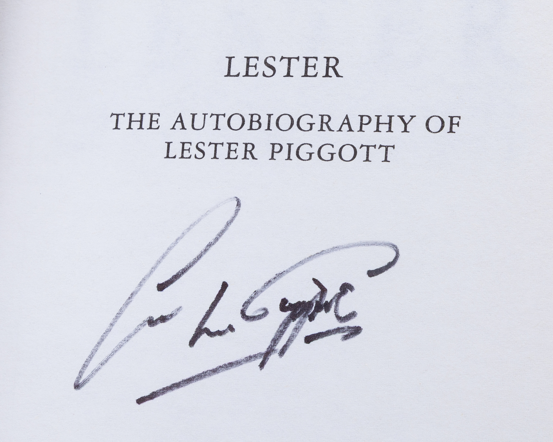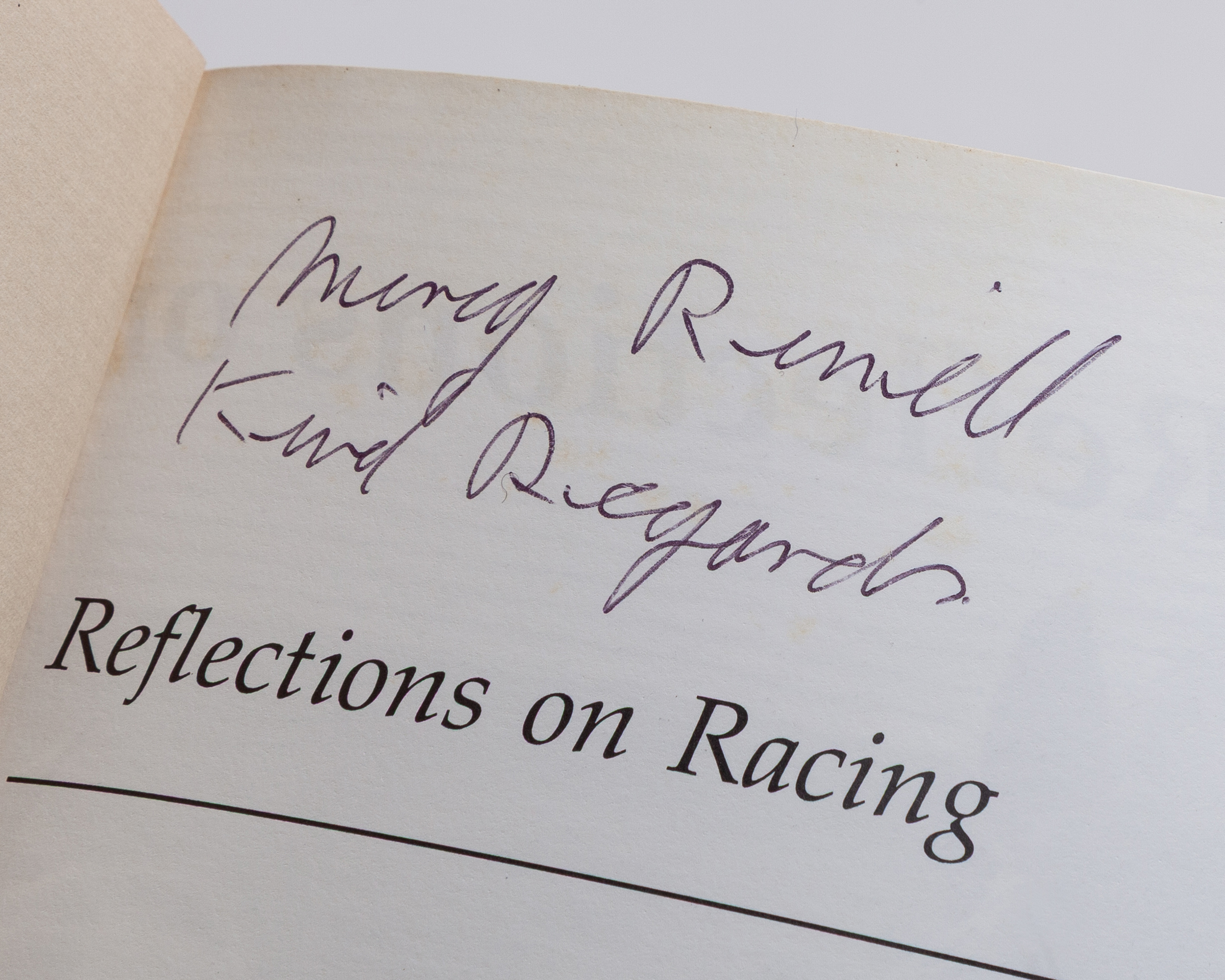 25+ horse racing programmes including 1969 and 1975 Derbys and the 1994 Grand National, a clean copy signed by Richard Dunwoody, also St Leger, Cheltenham Festival, Diamond Day at Ascot and defunct Wye; plus 20+ greyhound programmes, mostly Catford (including 4 from the 1950s) but also White City including 1974 and 1975 Greyhound Derbys, plus Harringay, Wembley and Oxford; racing books including Racehorses of … 1973/1974/1975/1978/1981, Meyrick Good, 'Good Days', Patrick Smithwick, 'Racing My Father' (inscribed to Dick Francis), Rudolf Alvarado, 'The Untold Story Of Joe Hernandez: The Voice Of Santa Anita' (signed by the author)' Lester Piggott Autobiography (signed) , Directory Of The British Turf (1960?) , Bobby Beasley: Second Start etc.; the selection of newspapers including 3 copies of Robert Sievier's 'The Winning Post' 1906/7 together with 30+ copies of The Sporting Life and The Racing Post from the 1970s onwards; the lot also including a photography exhibition poster featuring a sea of umbrellas at a very wet Epsom Derby in 1906 (a qty.)