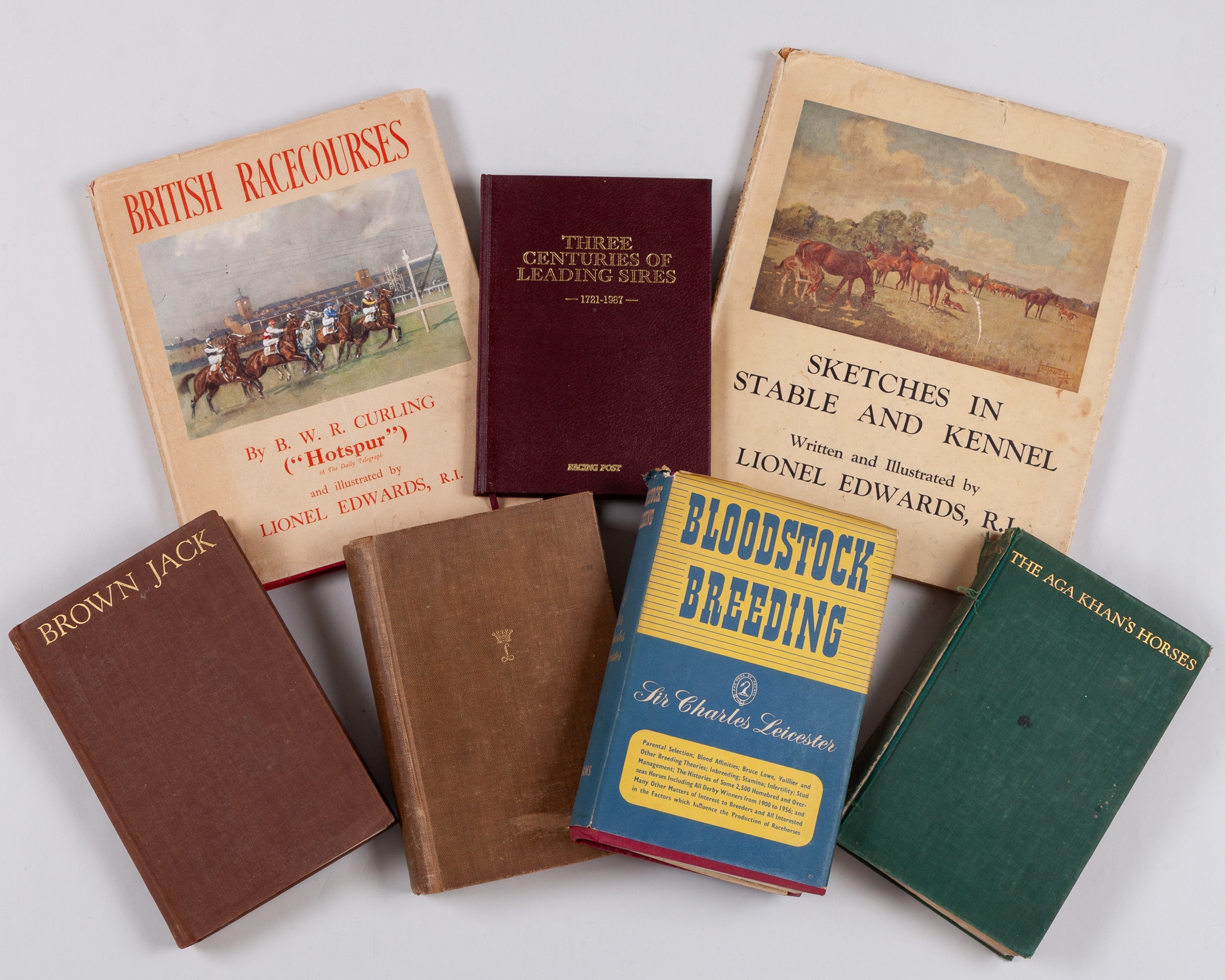 Three Centuries of Leading Sires 1721-1987, Racing Post limited edition 476/500; Sir Charles Leicester's Bloodstock breeding, with d/j, 1957; The Lonsdale Library, The Way of a Man with a Horse, poor condition; and four books illustrated by Lionel Edwards, Racecourses illustrated, Brown Jack, The Aga Khan's Horses and Sketches in Stable and Kennel