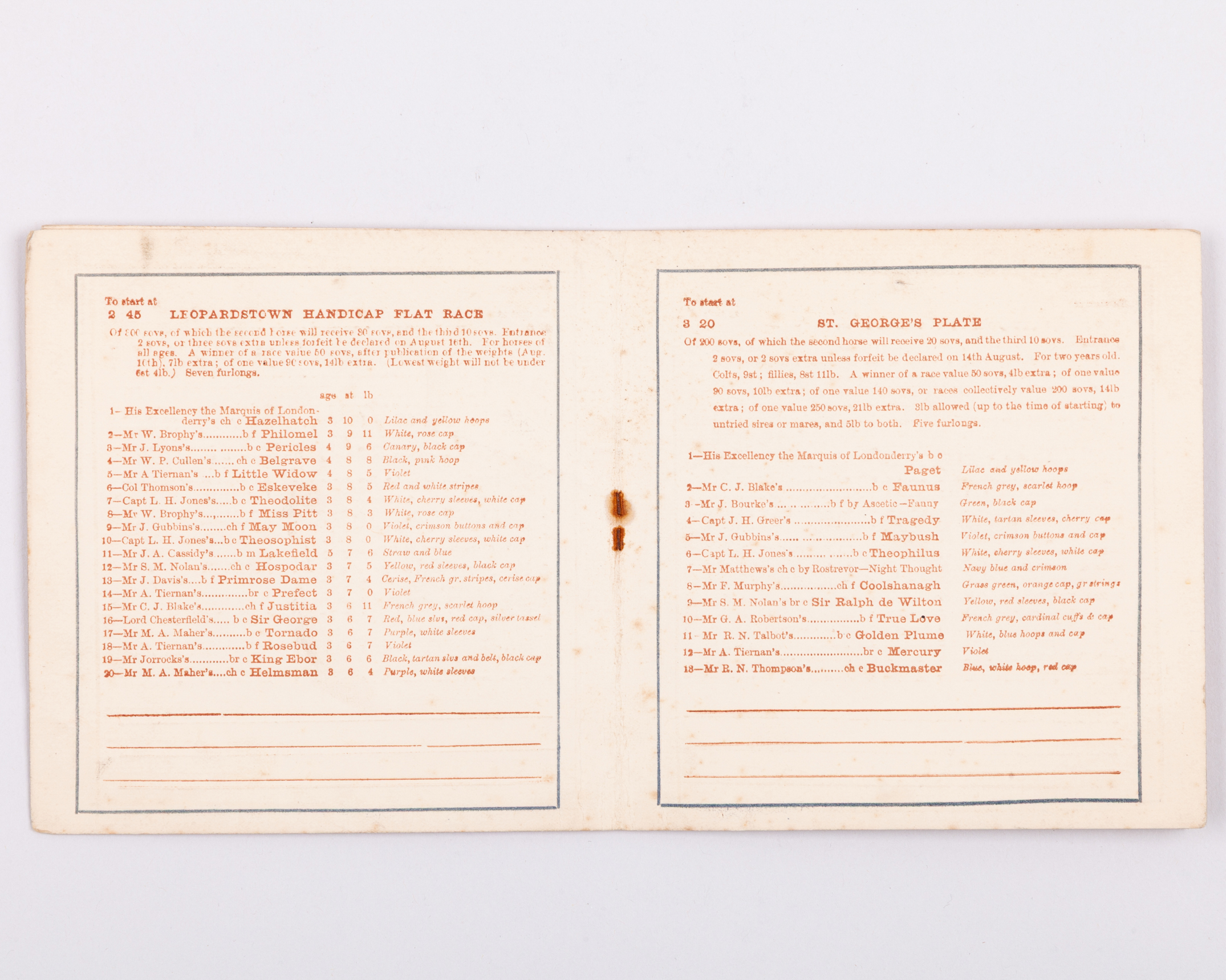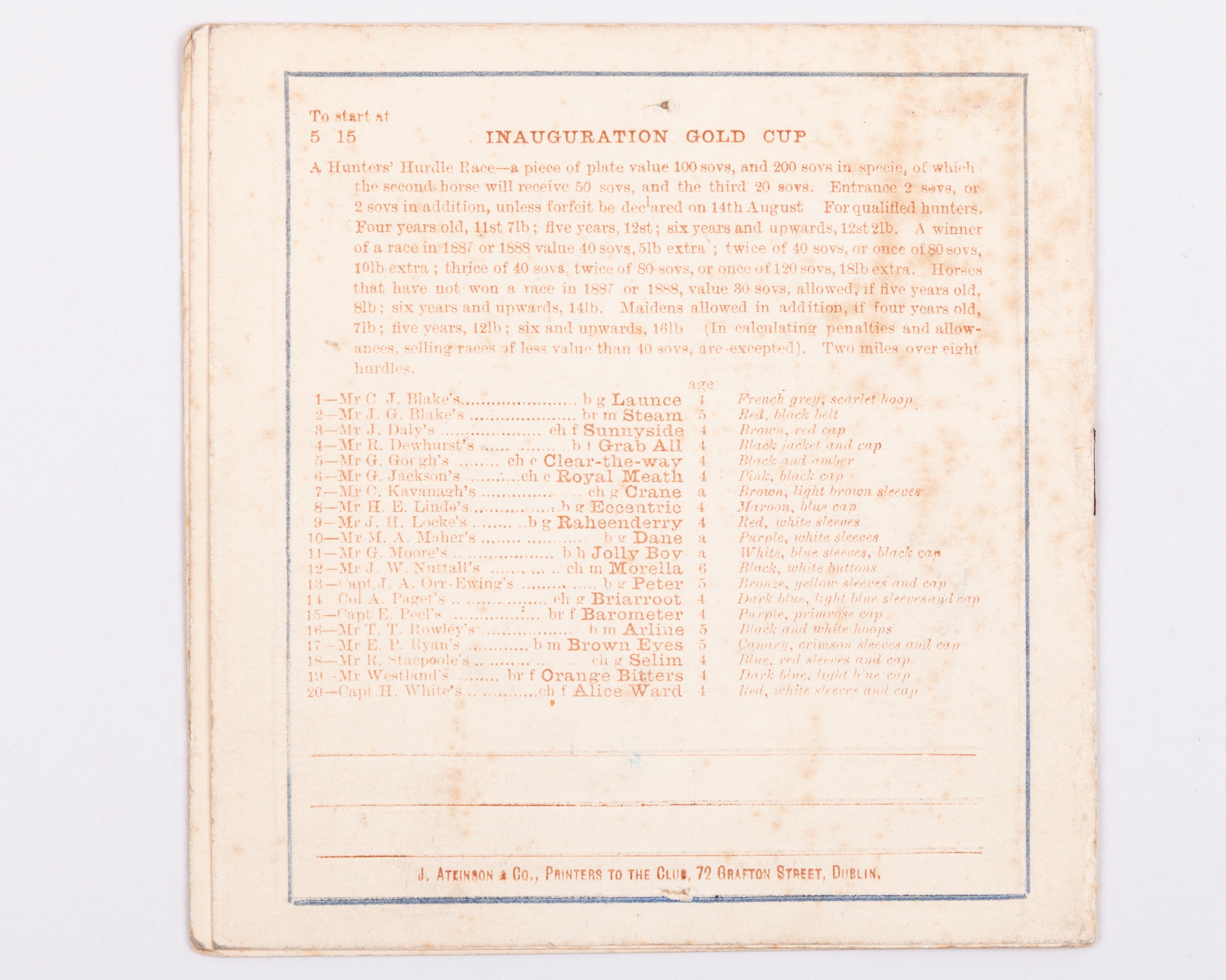7-race card, published by J. Atkinson & Co., Dublin, some light foxing, generally good