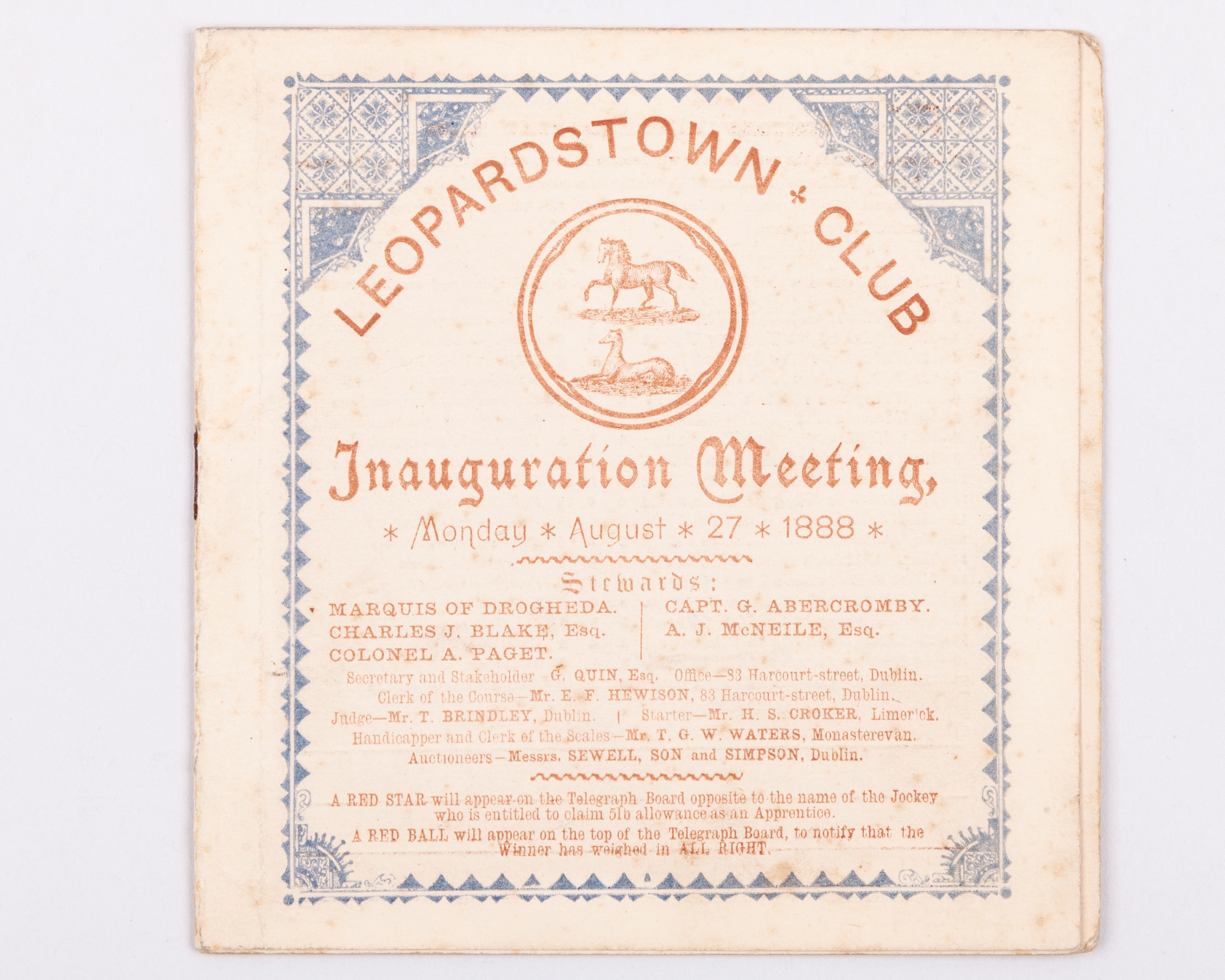 Racecard for the Inauguration Meeting at Leopardstown Racecourse 27th August 1888,
