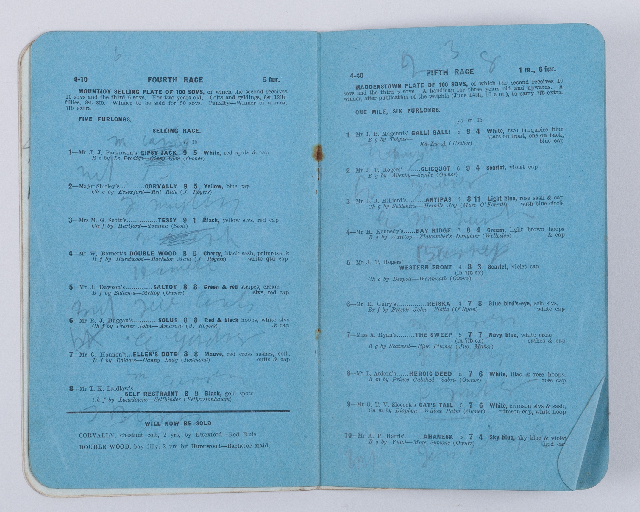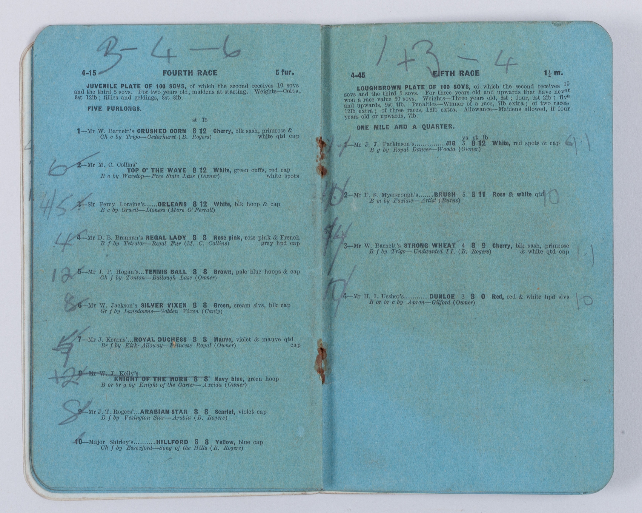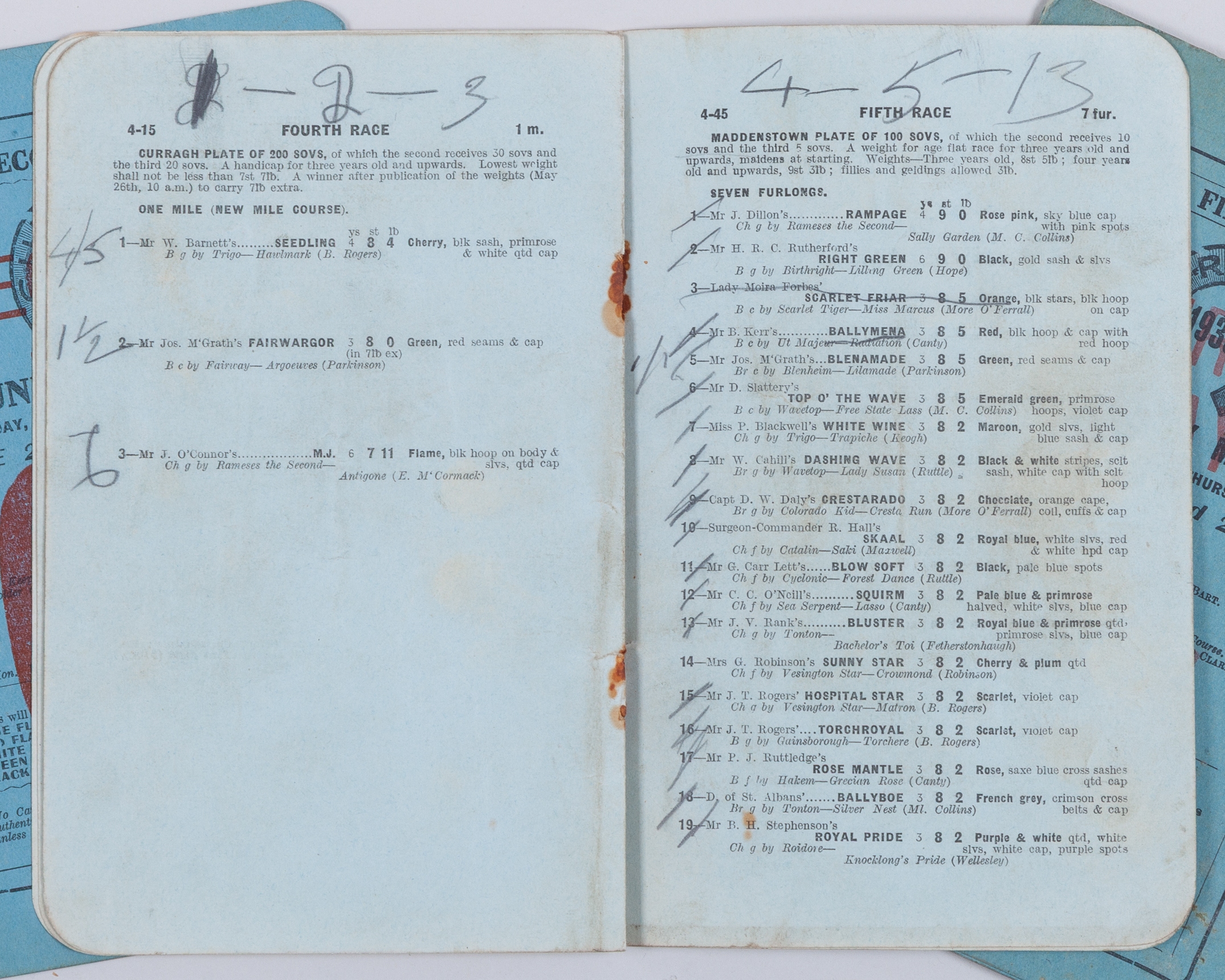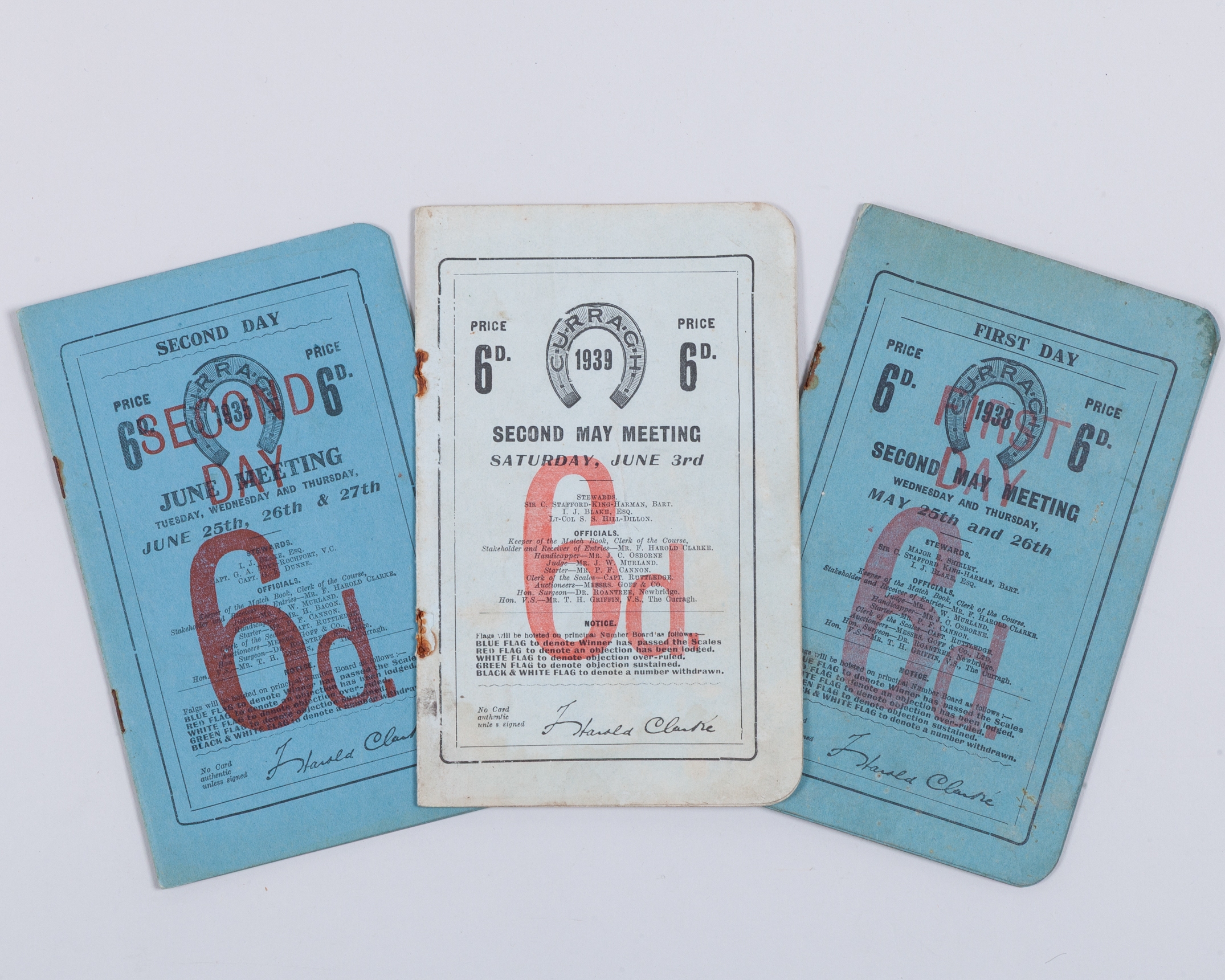 the 1935 Irish Derby at the Curragh won by Sir Victor Sassoon's Museum; and two Irish 1,000 Guineas racecards, for 1938 won by Major Dermot McCalmont's Lapel and for 1939 won by Sir Harold Gray's Serpent Star