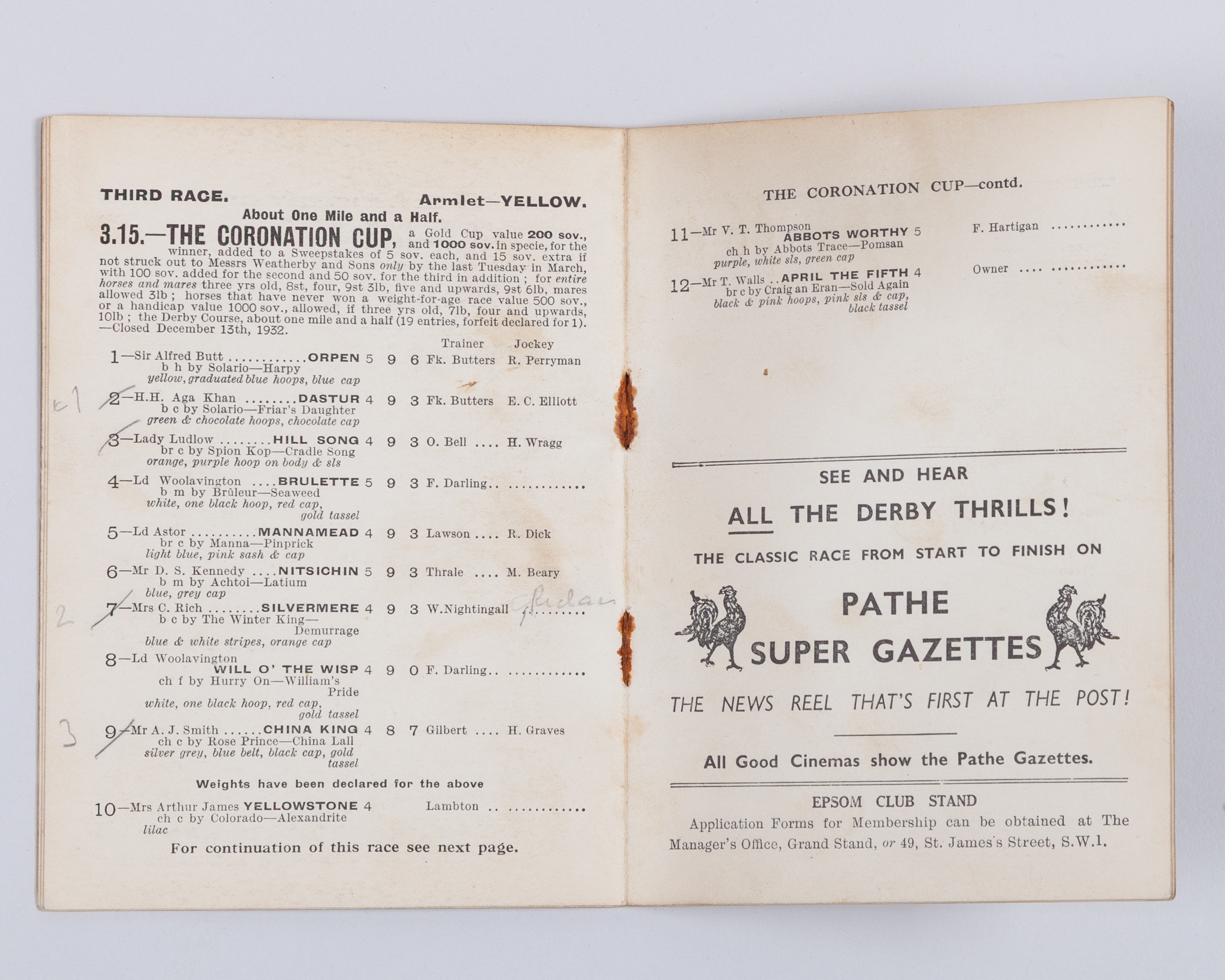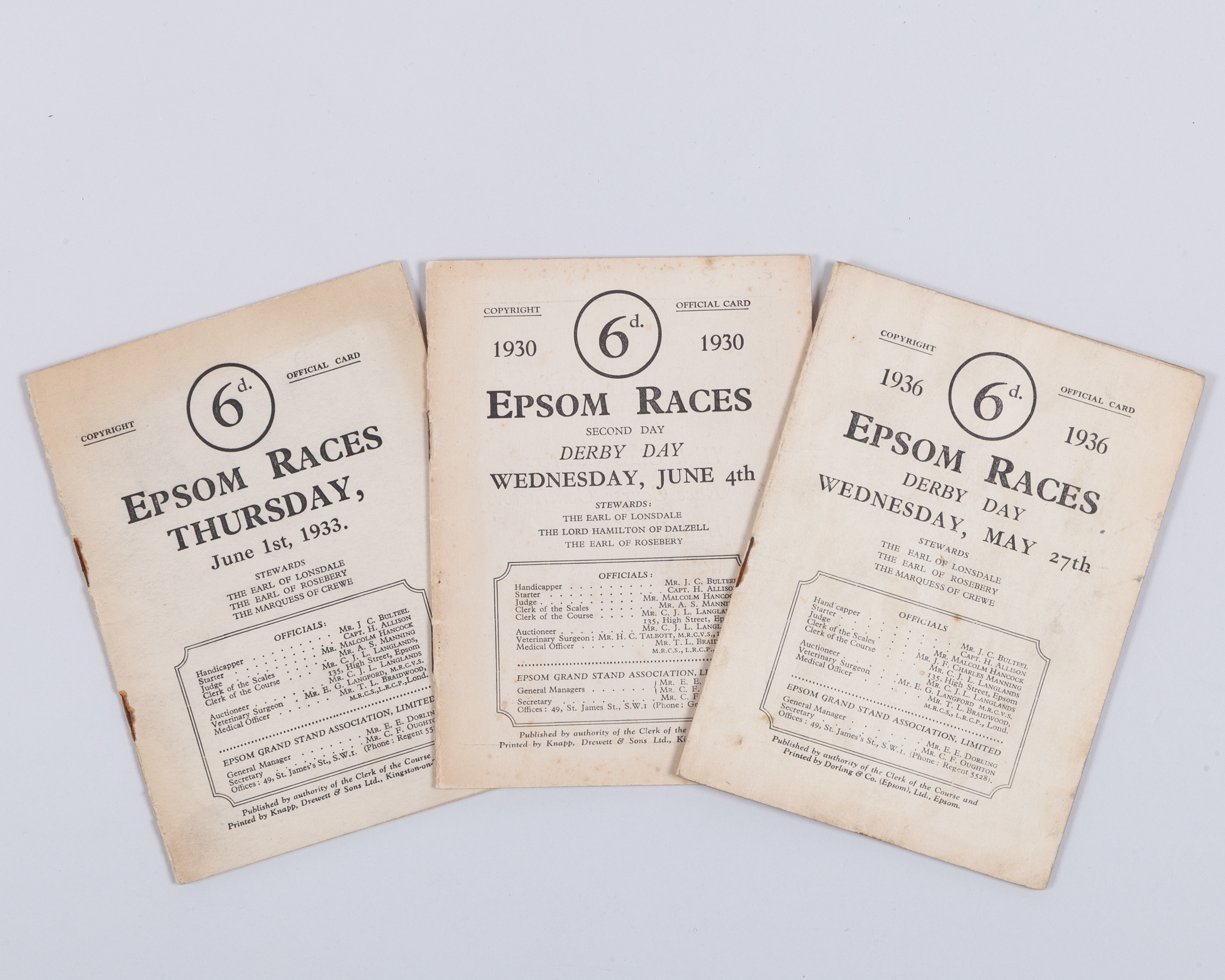 4th June 1930 won by Blenheim and 1936 won by Mahmoud; sold together with an Epsom racecard for the 1933 Coronation Cup won by H H Aga Khan's Dastur (3)