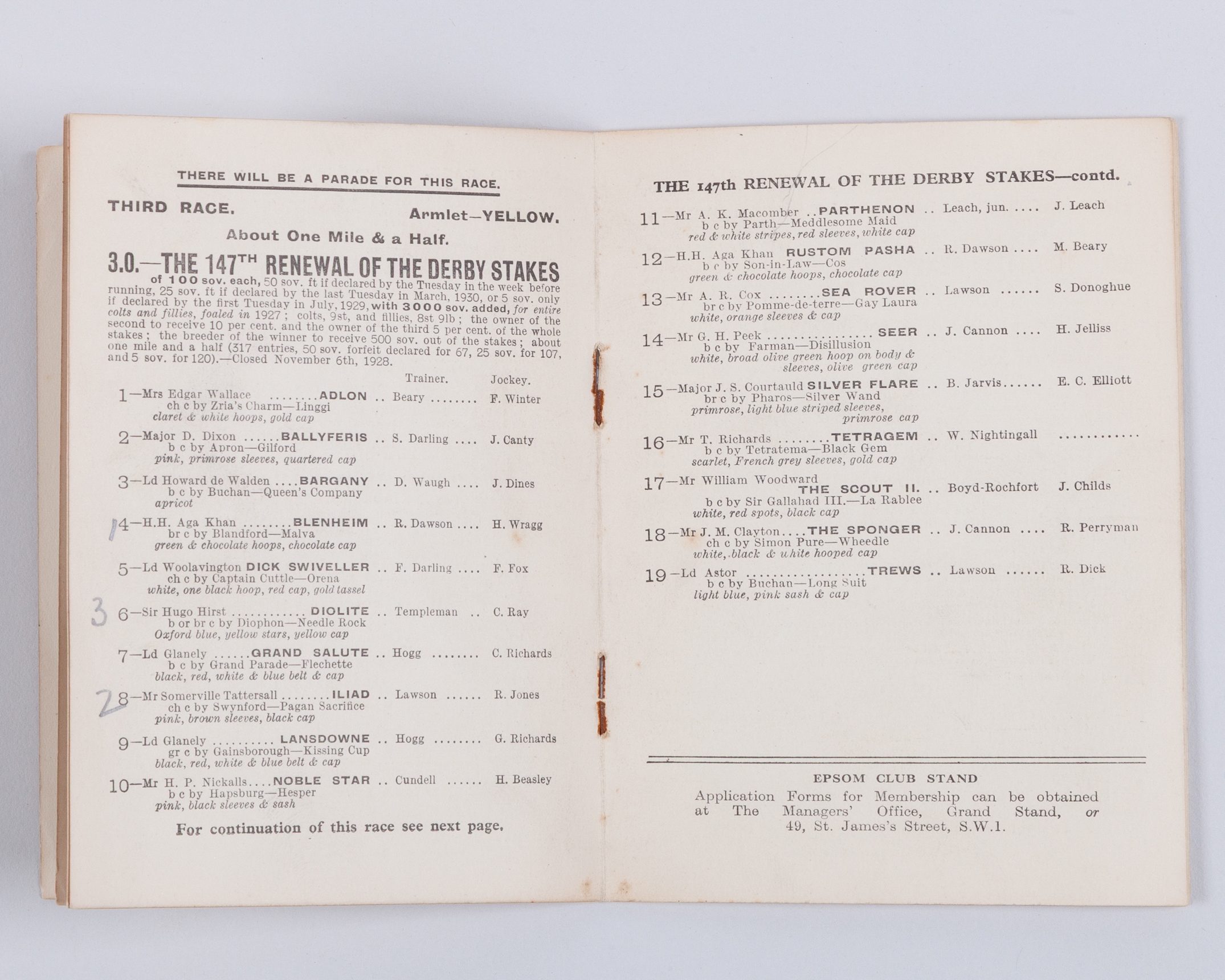 Epsom Derby racecards for 1930 and 1936 both won by H H Aga Khan racehorses
