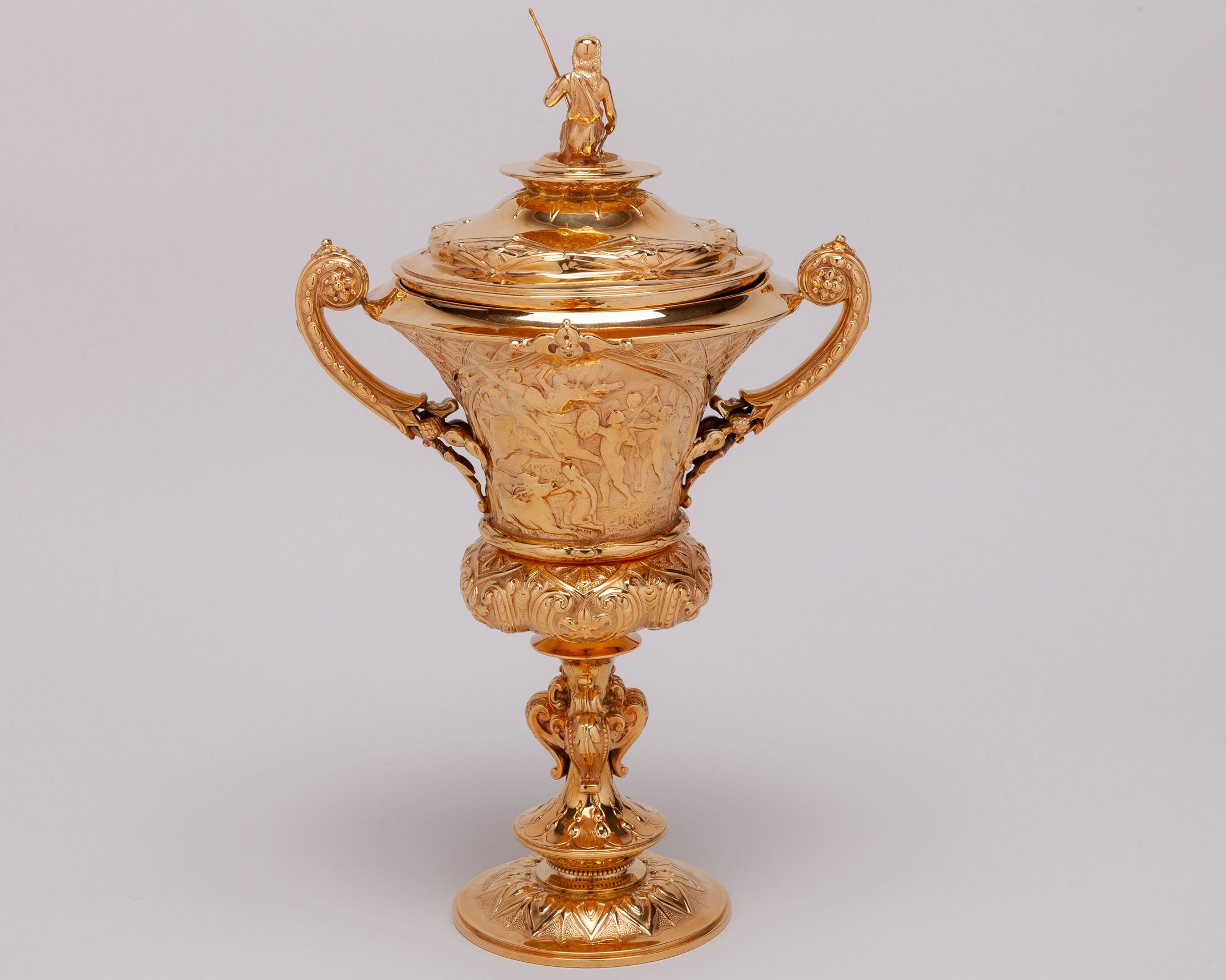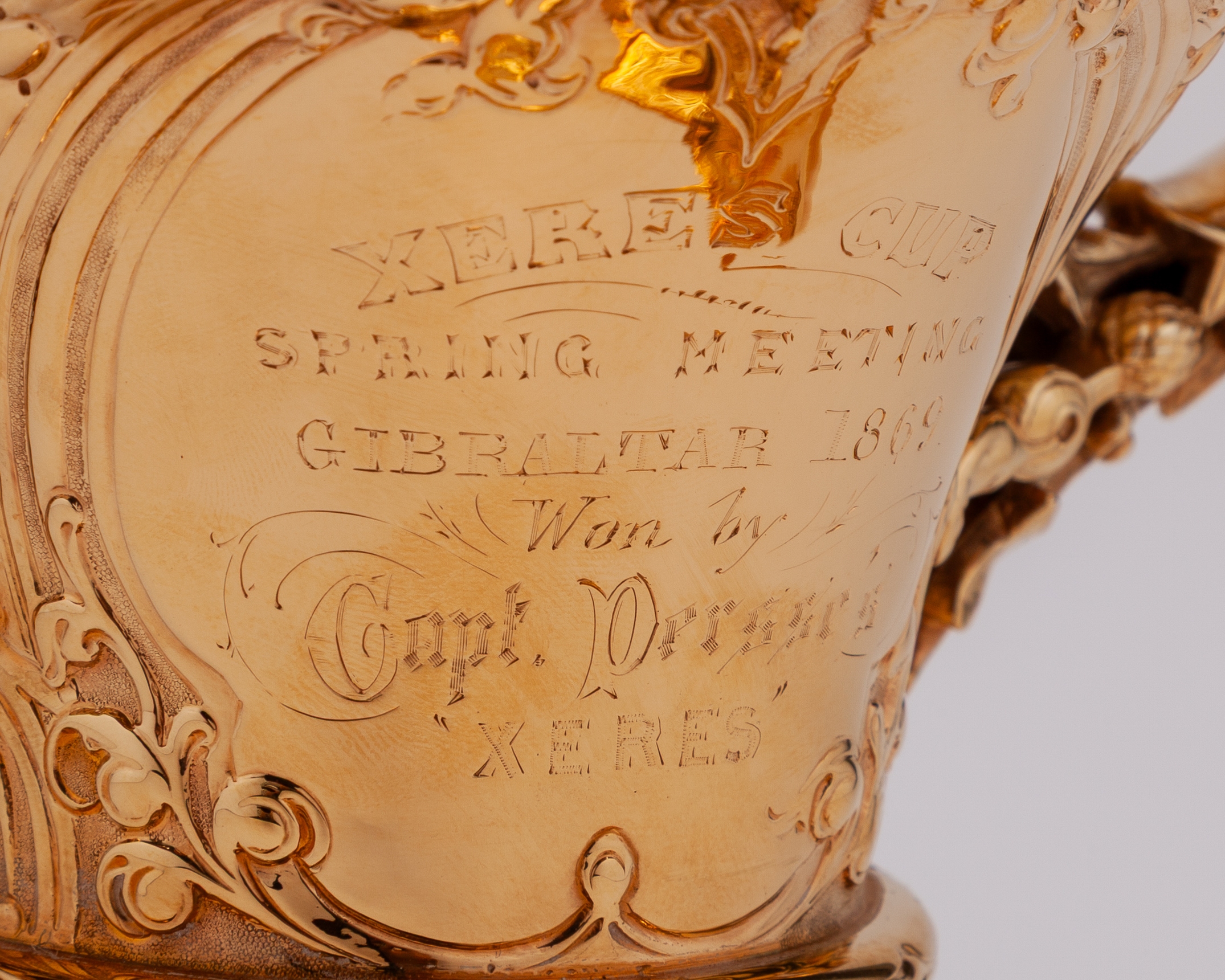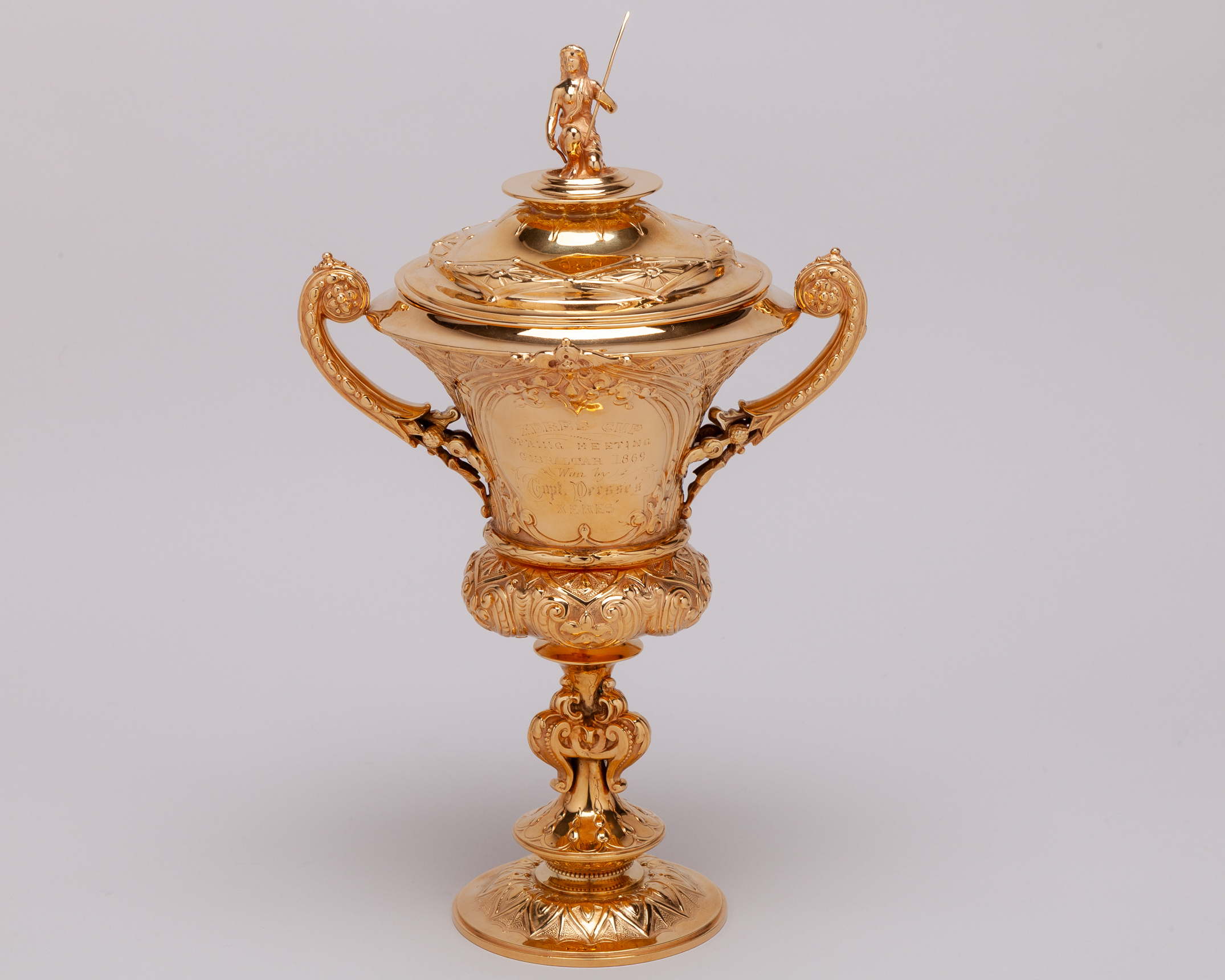 in the form of an elaborate silver-gilt two handled cup & cover, hallmarked Richards & Brown (Edward Charles Brown), London, 1868, the knop modelled as the Roman Goddess Minerva, the body inscribed XERES CUP, SPRING MEETING, GIBRALTAR 1869, WON BY CAPT. PERSSE'S ‘XERES’, height 30cm., weight 764gr.