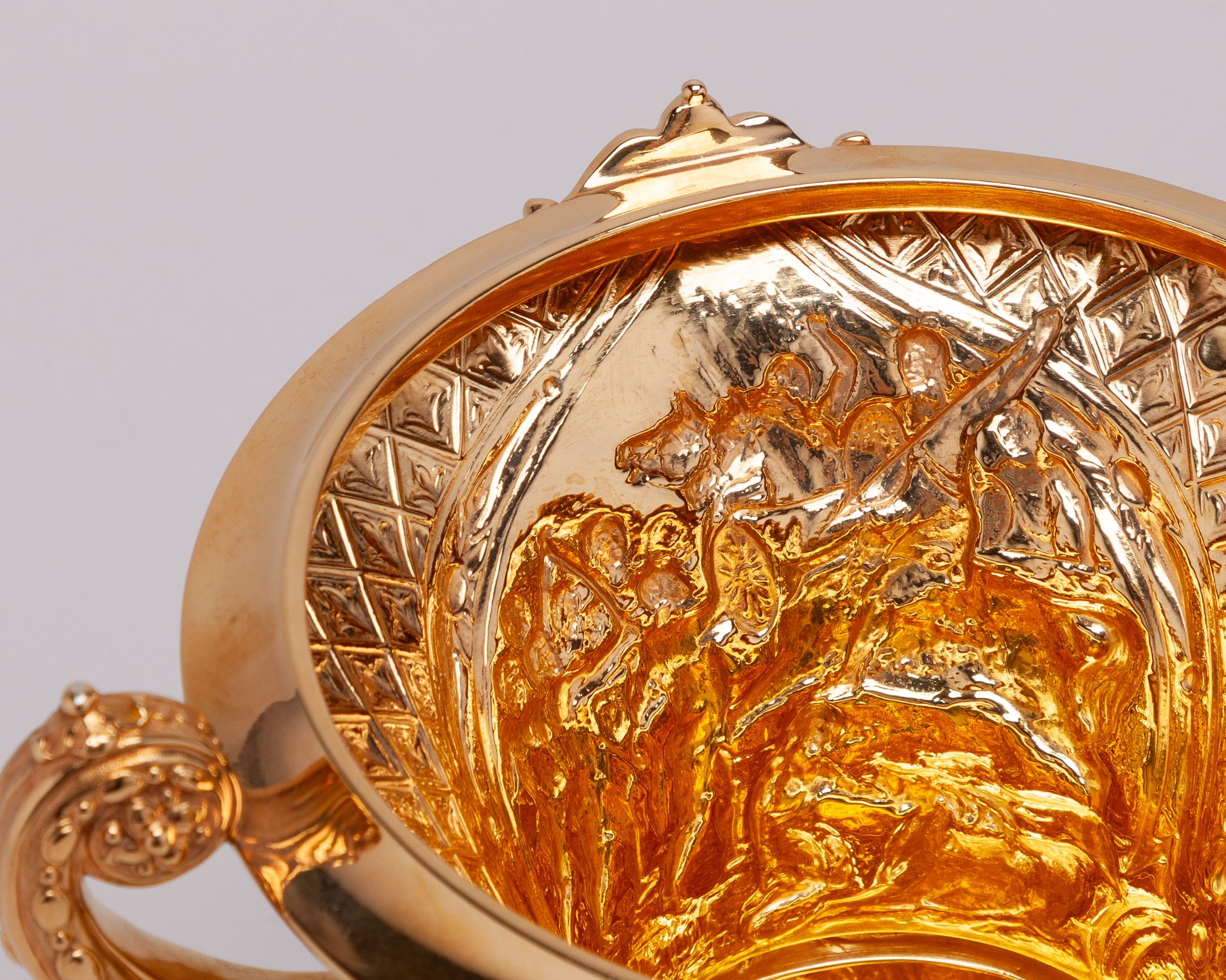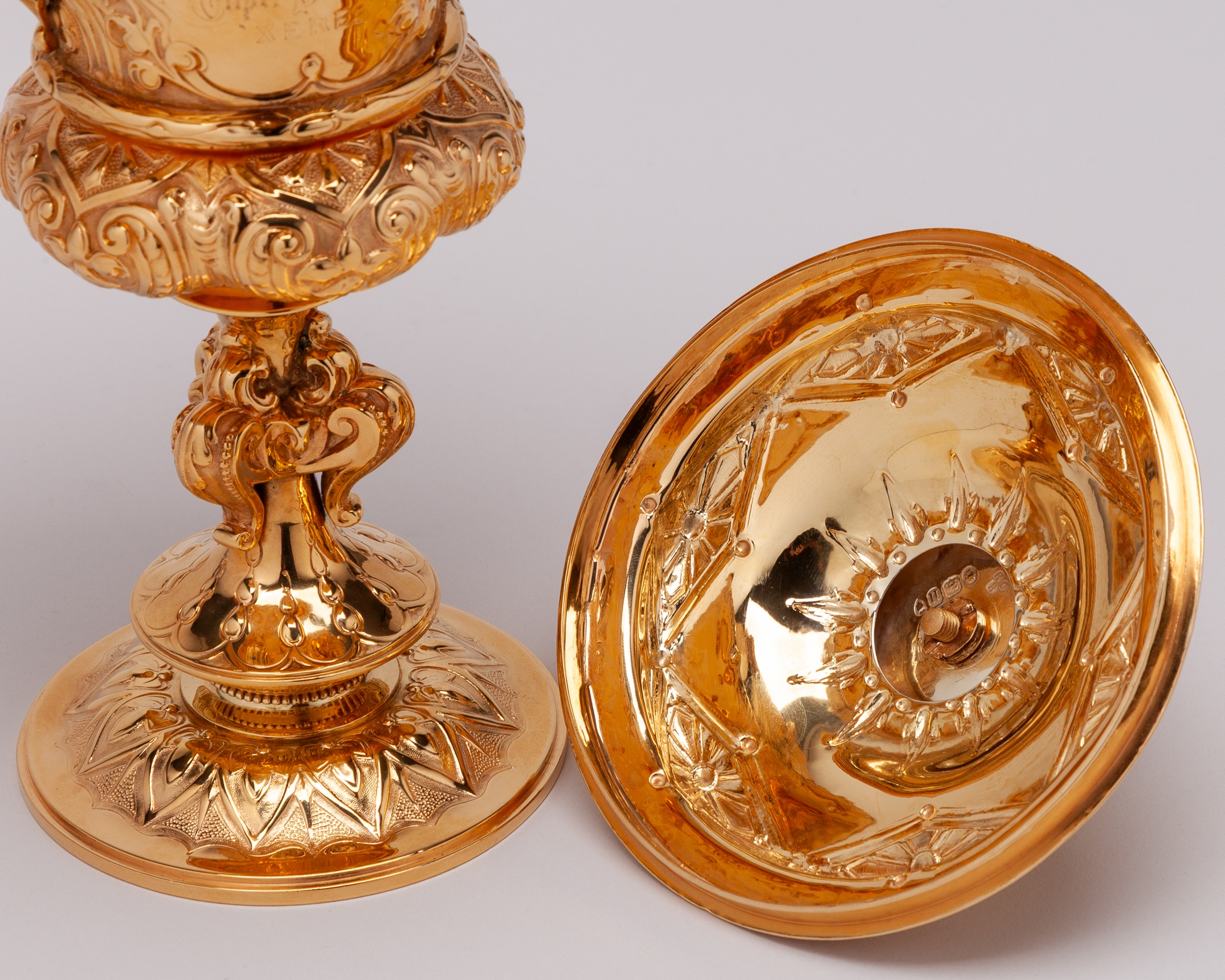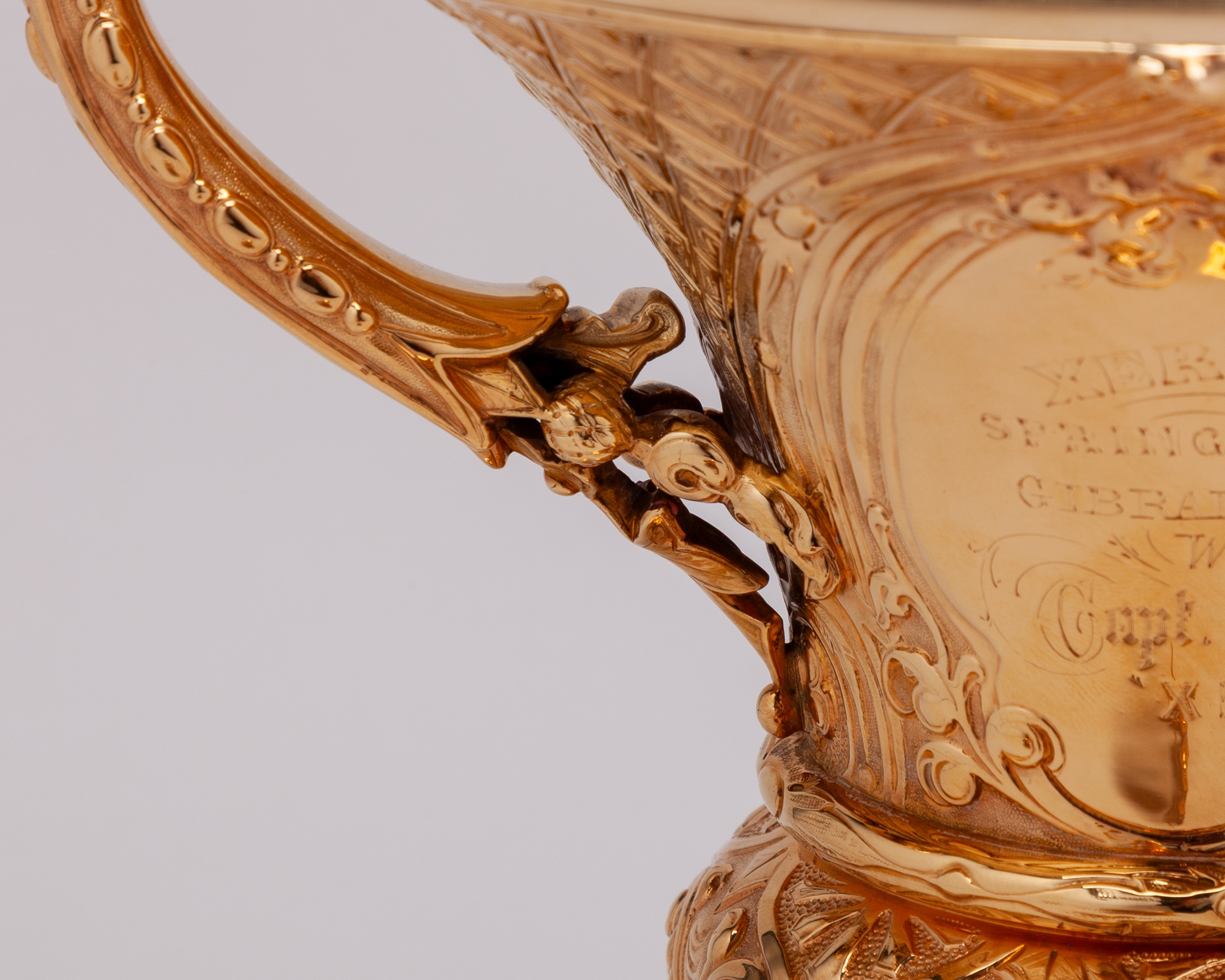 in the form of an elaborate silver-gilt two handled cup & cover, hallmarked Richards & Brown (Edward Charles Brown), London, 1868, the knop modelled as the Roman Goddess Minerva, the body inscribed XERES CUP, SPRING MEETING, GIBRALTAR 1869, WON BY CAPT. PERSSE'S ‘XERES’, height 30cm., weight 764gr.