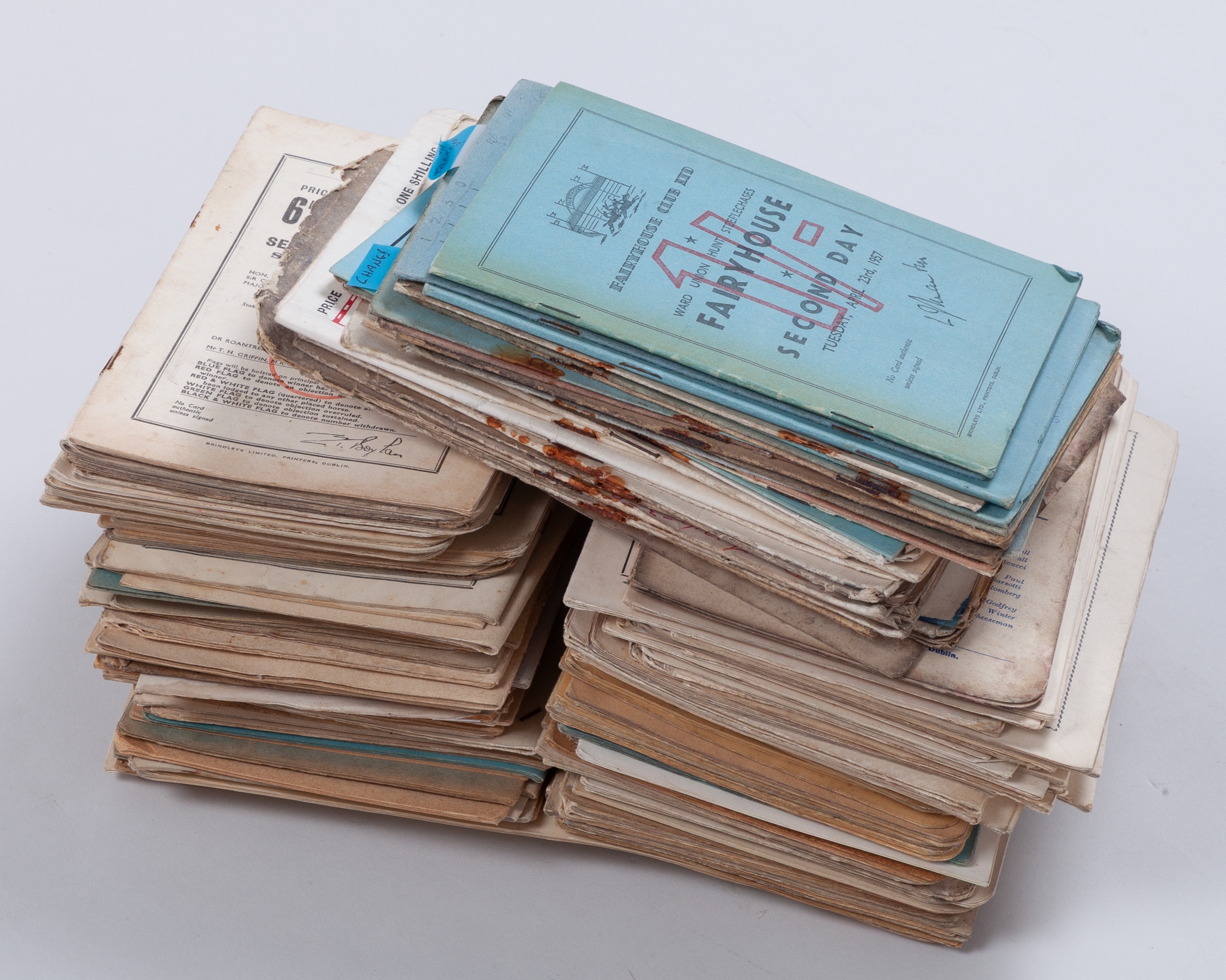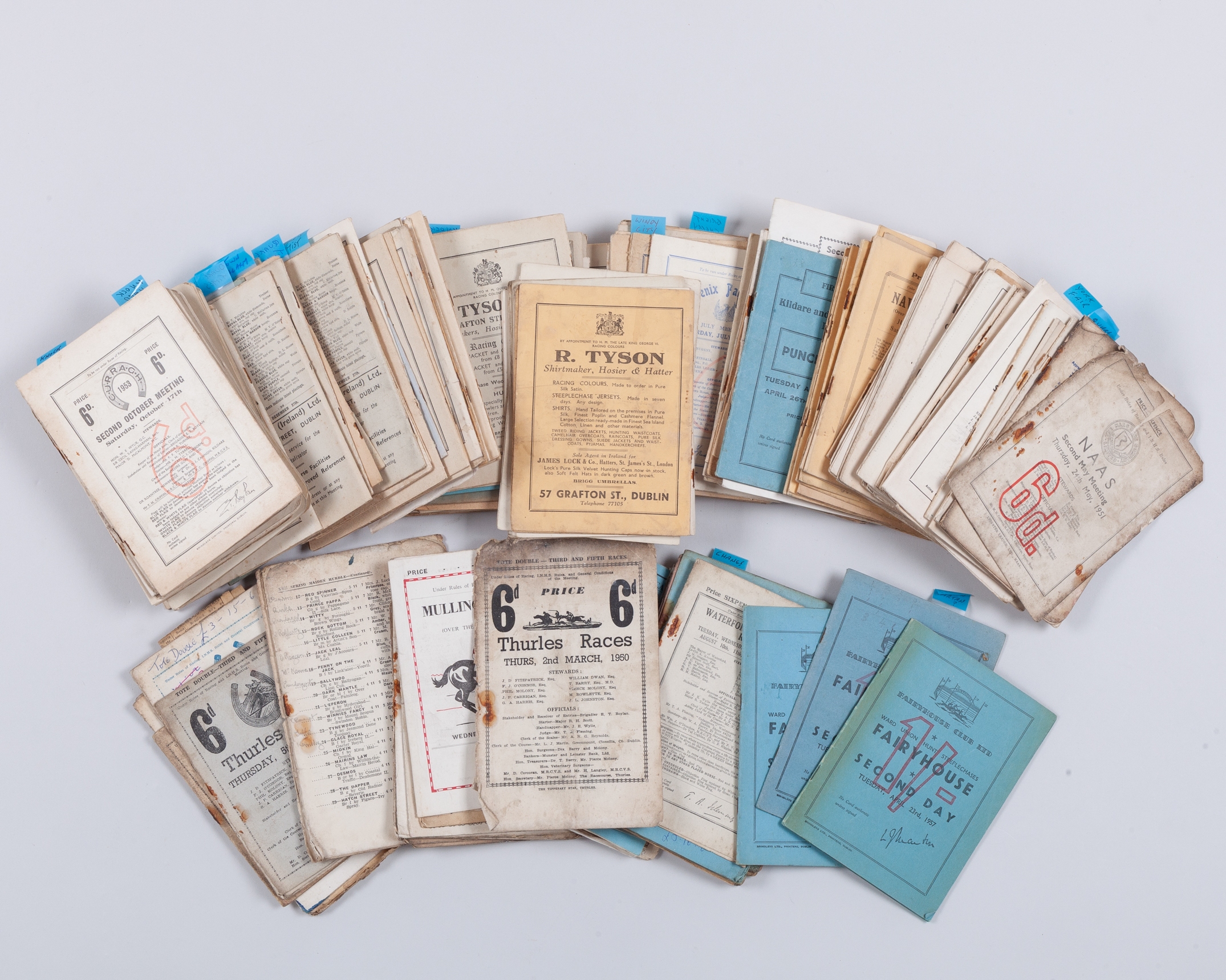 Baldoyle x 9; Bellewstown x 1; Curragh x 23; Dundalk x 1; Fairyhouse x 4; Galway x 3; Leopardstown x 43; Limerick x 3; Mulingar x 3; Naas x 21; Navan (Proudstown Park) x 15; Phoenix Park x 14; Powerstown Park (Clonmel) x 3; Punchestown x 3; Thurles x 7; Waterford & Tramore x 11; together with 6 unidentified cards; and 5 point-to-point/hunt steeplechases for South Westmeath Hunt, South County Dublin Harriers x 3 & Tara Harriers