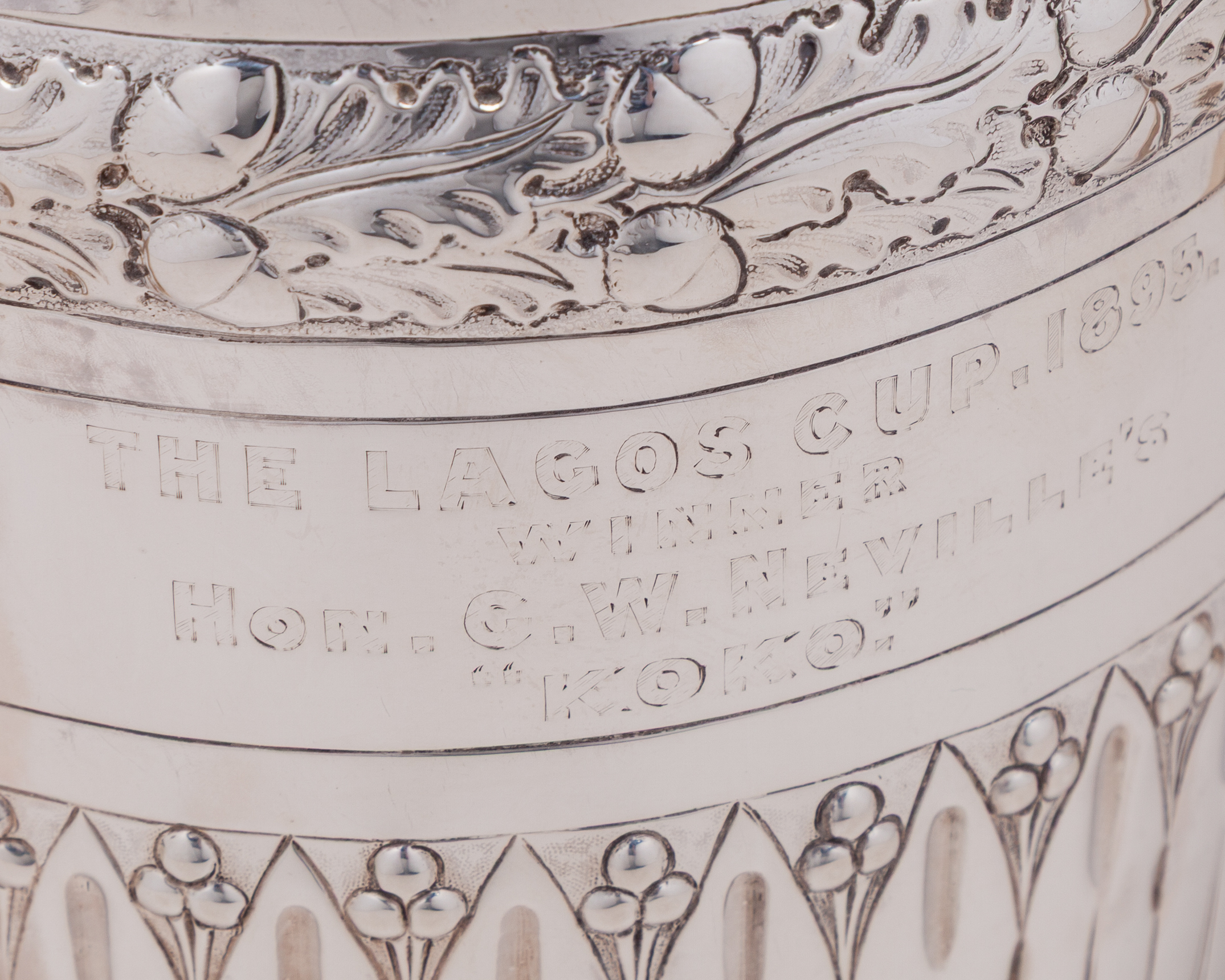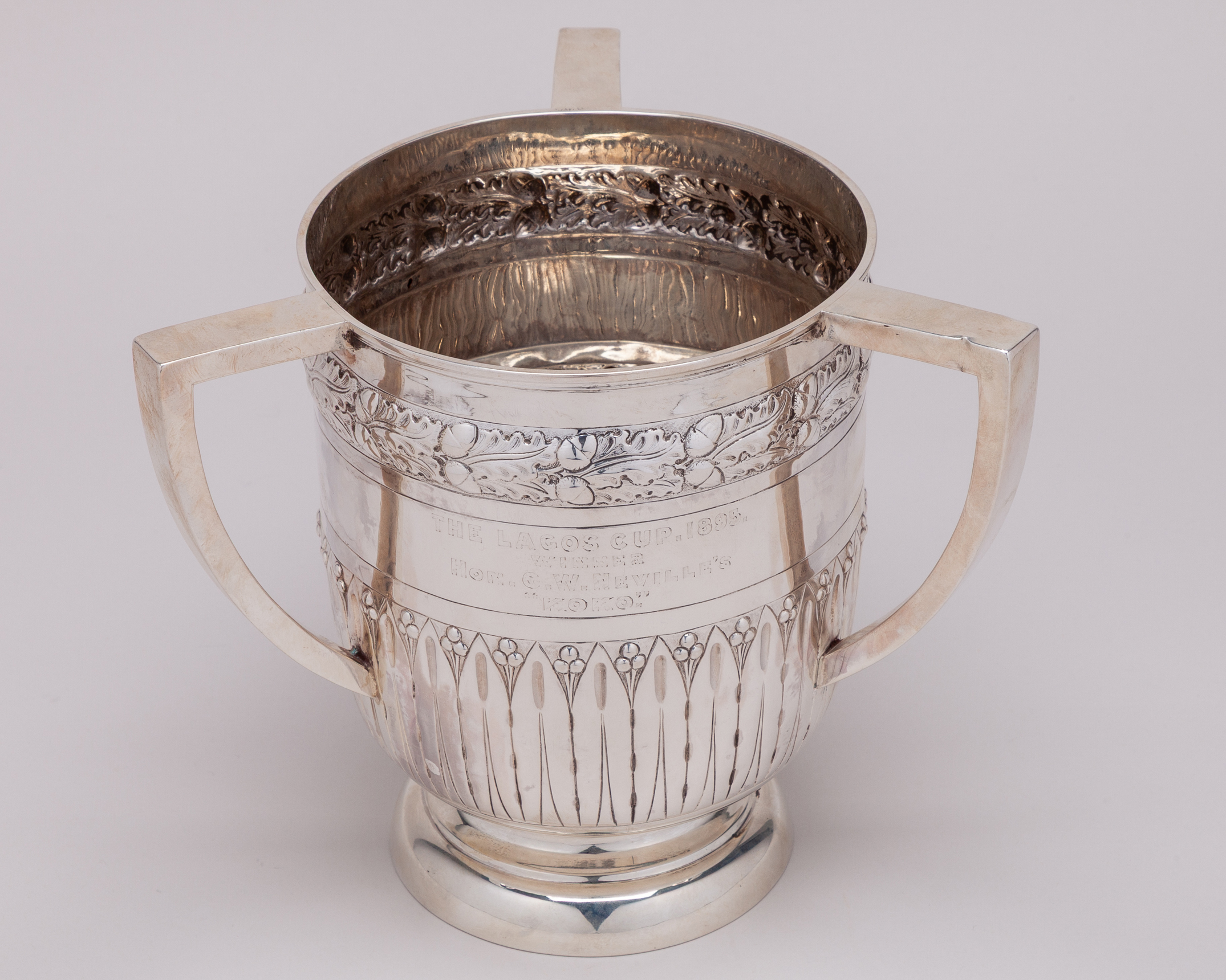 in the form of a silver loving cup, hallmarked Mappin & Webb, London, 1895, inscribed THE LAGOS CUP, 1895, WINNER, HON. G.W. NEVILLE'S “KOKO”, height 19cm., weight 871gr.