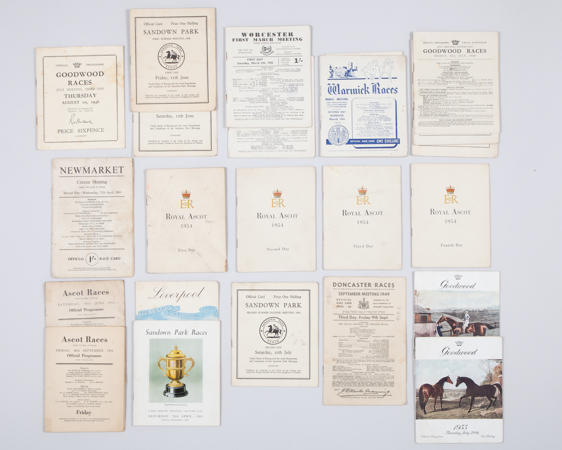 18 flat, highlights including a full set of 1954 Royal Ascot cards, 1954 Eclipse Stakes, Goodwood Cups for 1946 & 1955 and Aureole's 1954 Coronation Cup; 7 N..H., highlights including the 1959 Grand National and Arkle's 1965 Whitbread Gold Cup