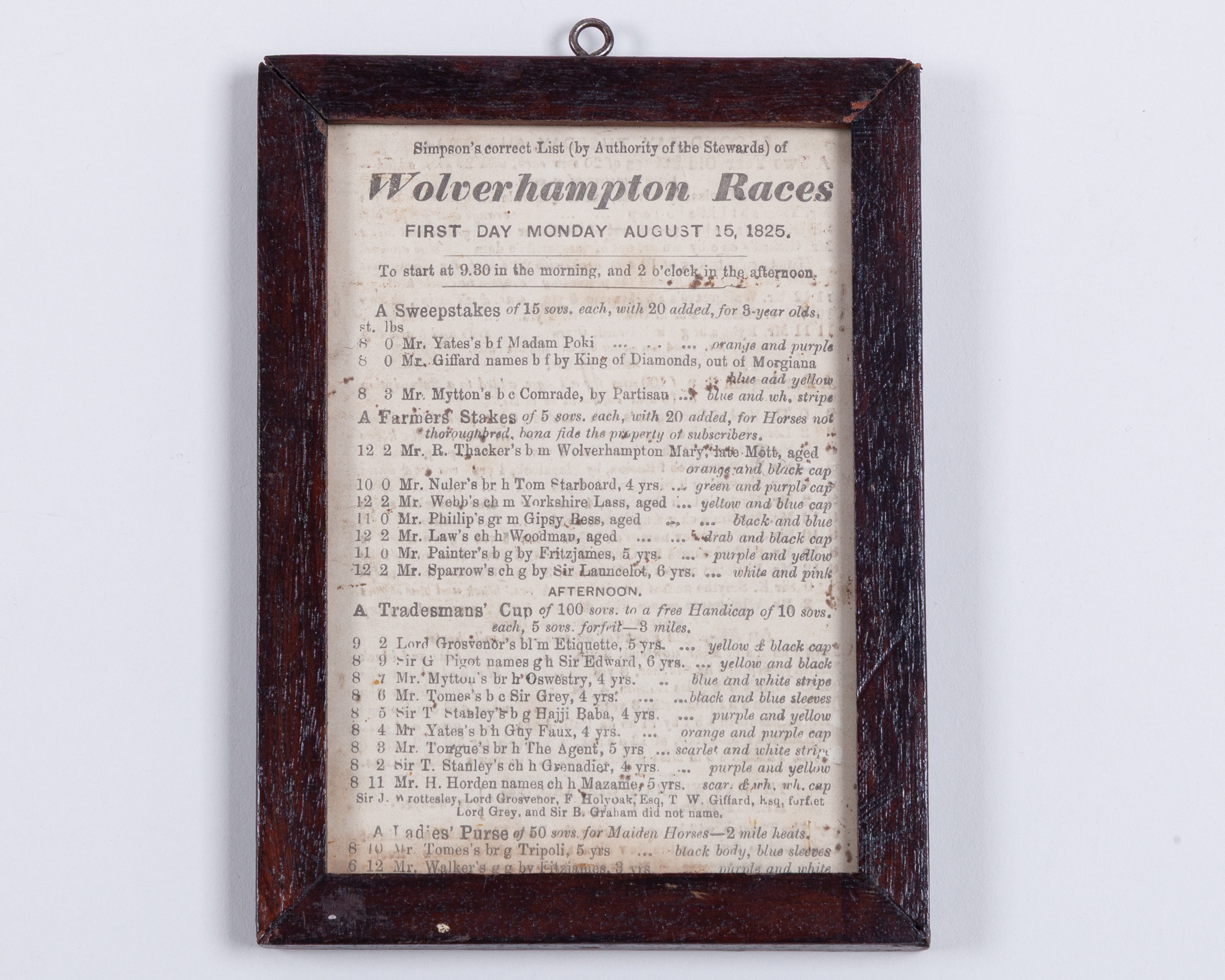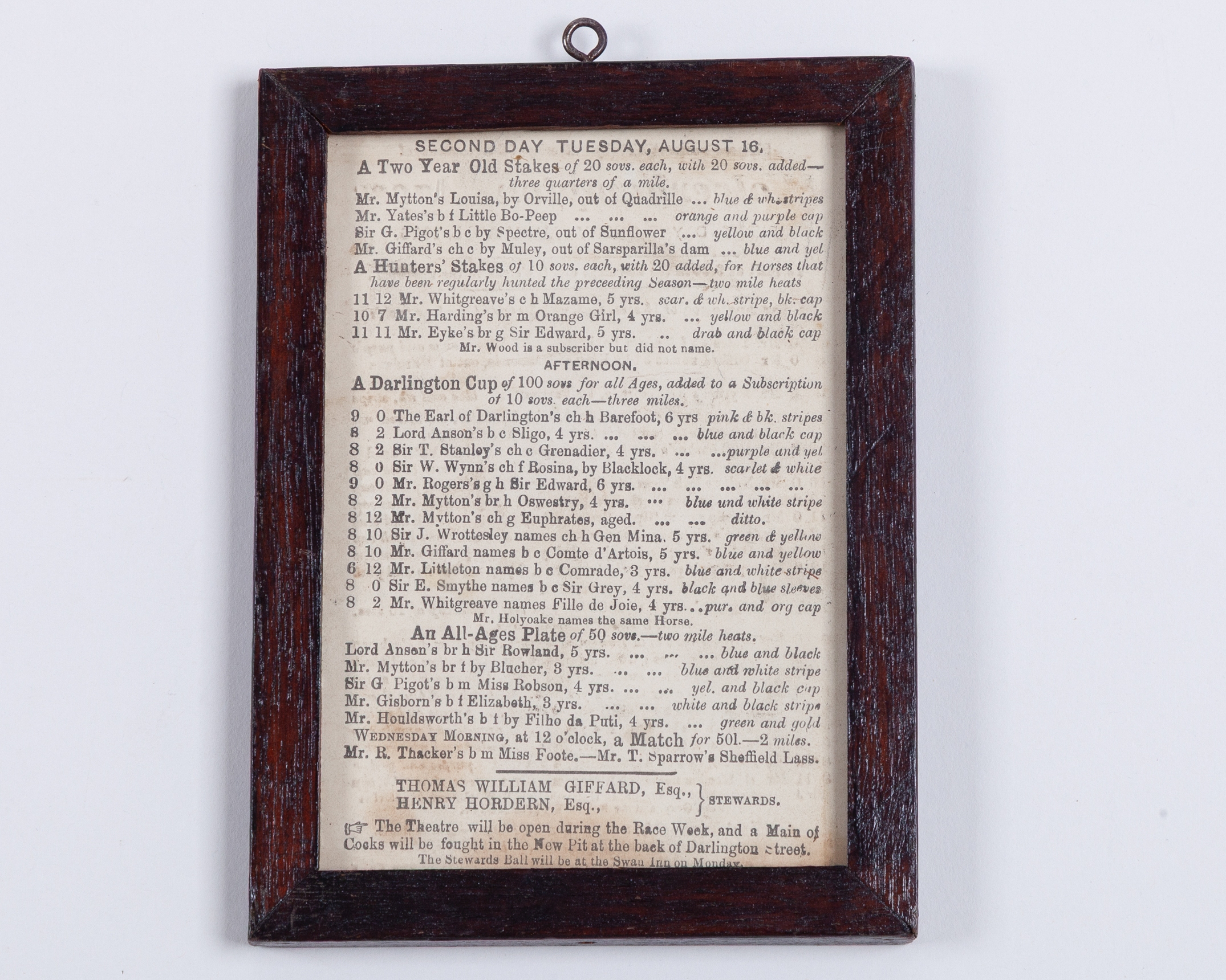 printed both sides, the first day featuring the 100 sovs. Tradesmans' Cup, the second day the 100 sovs. Darlington Cup, framed & glazed, 18 by 13cm.