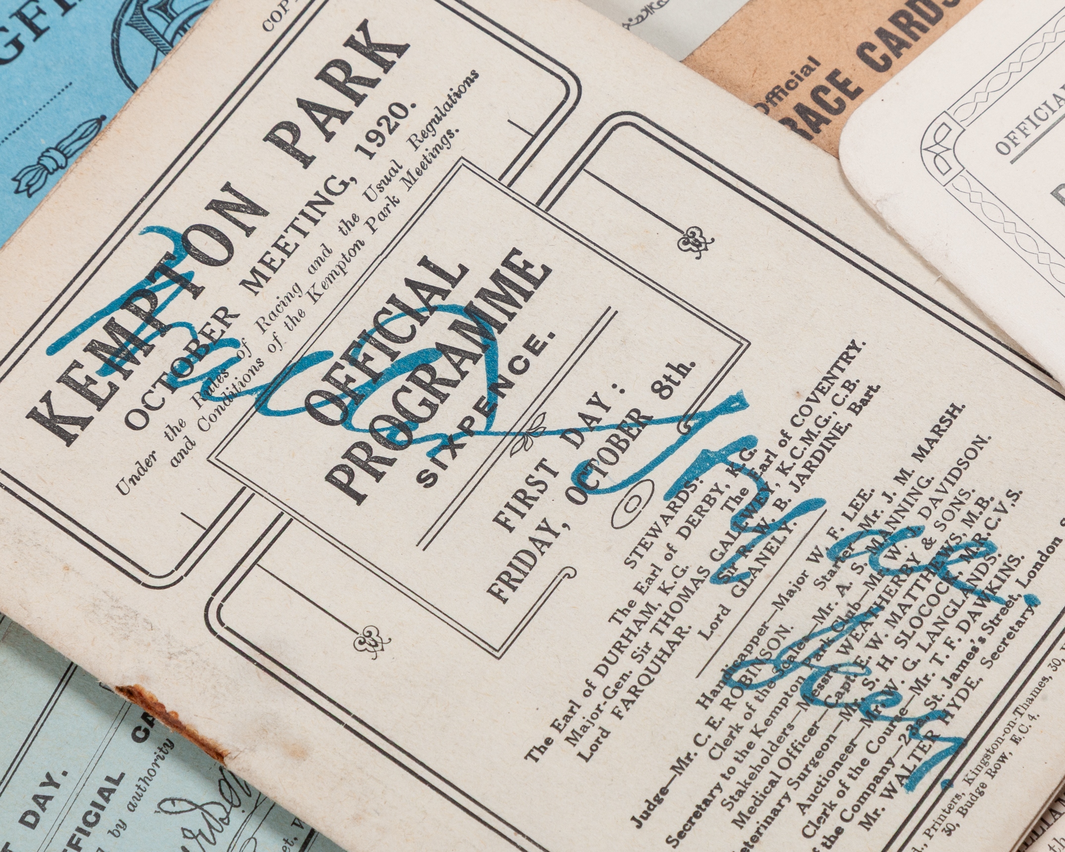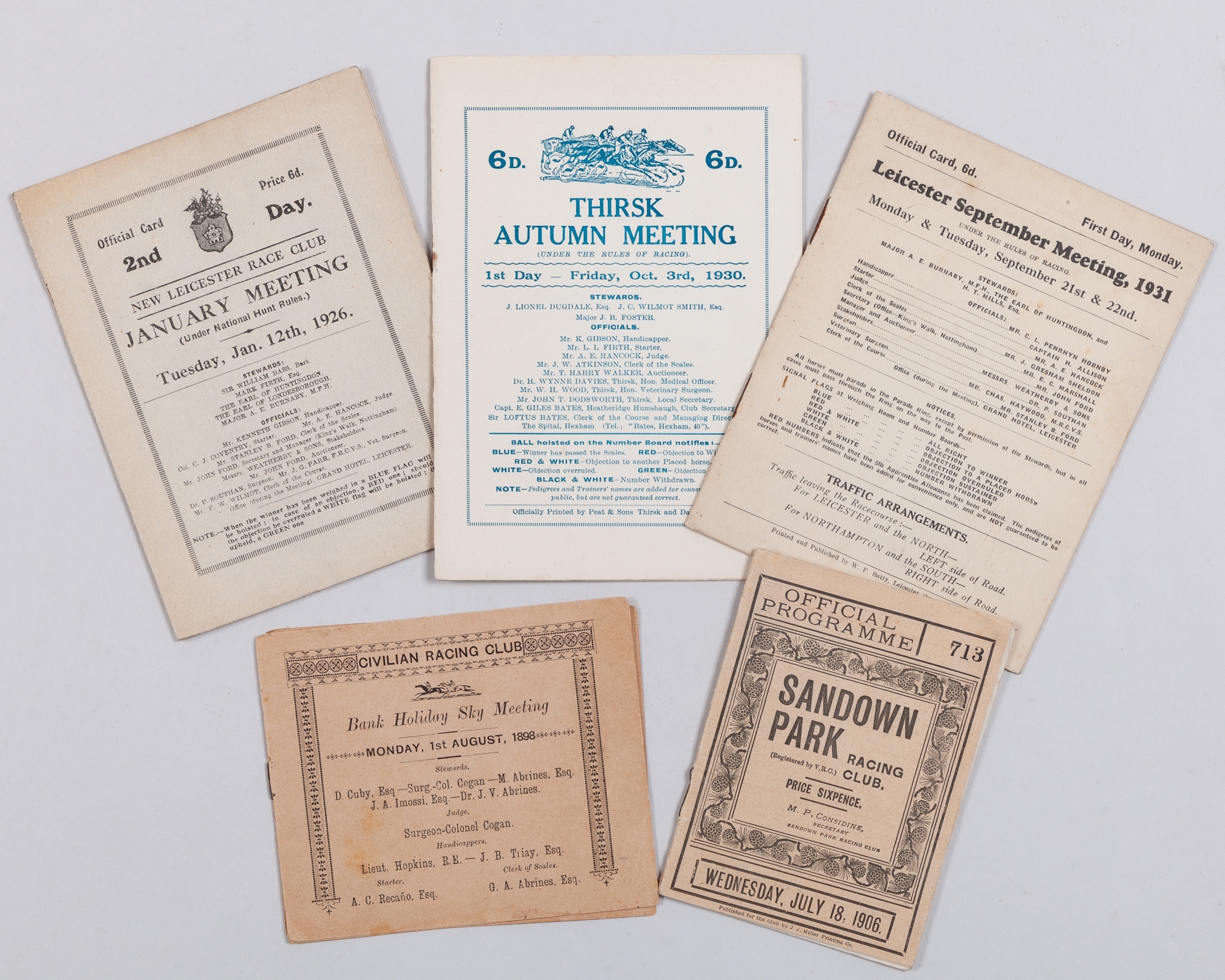 broad selection of racecourses, Royal Ascot, Bath, Beverley, Brighton, Cartmel, Catterick, Chepstow, Great Yarmouth, Kempton Park, Leicester, Lingfield Park, Newcastle, Nottingham, Pontefract, Salisbury, Sandown Park, Thirsk and Warwick, plus the defunct courses of Alexandra Palace, Hurst Park, Manchester, Northolt Park, Shirley &, Stockton also overseas at Civilian Racing Club, Gibraltar, 1898 and Baghdad Races in 1929; Hunt Meetings for Royal Caledonian & Beaufort; and a military meeting at Aldershot