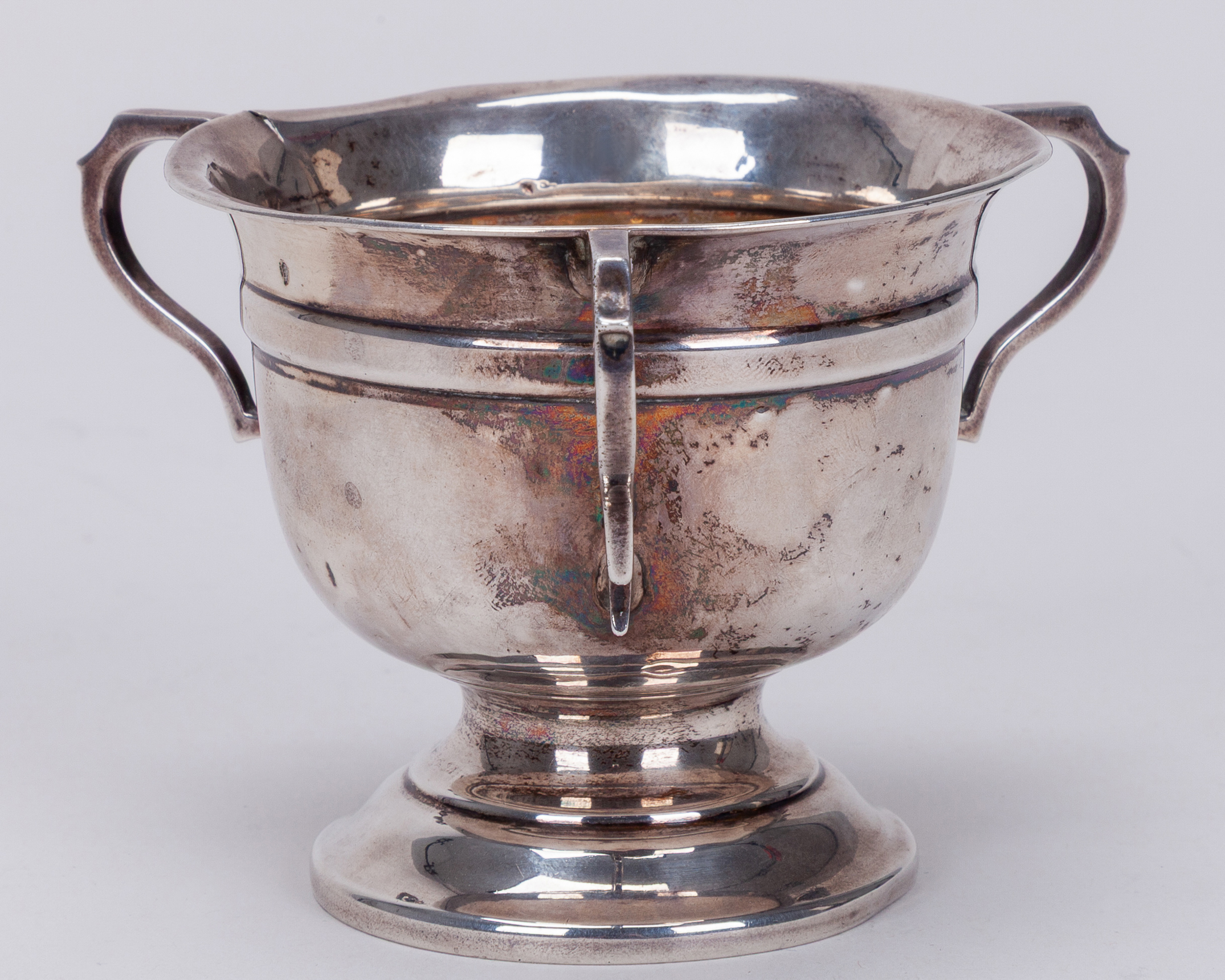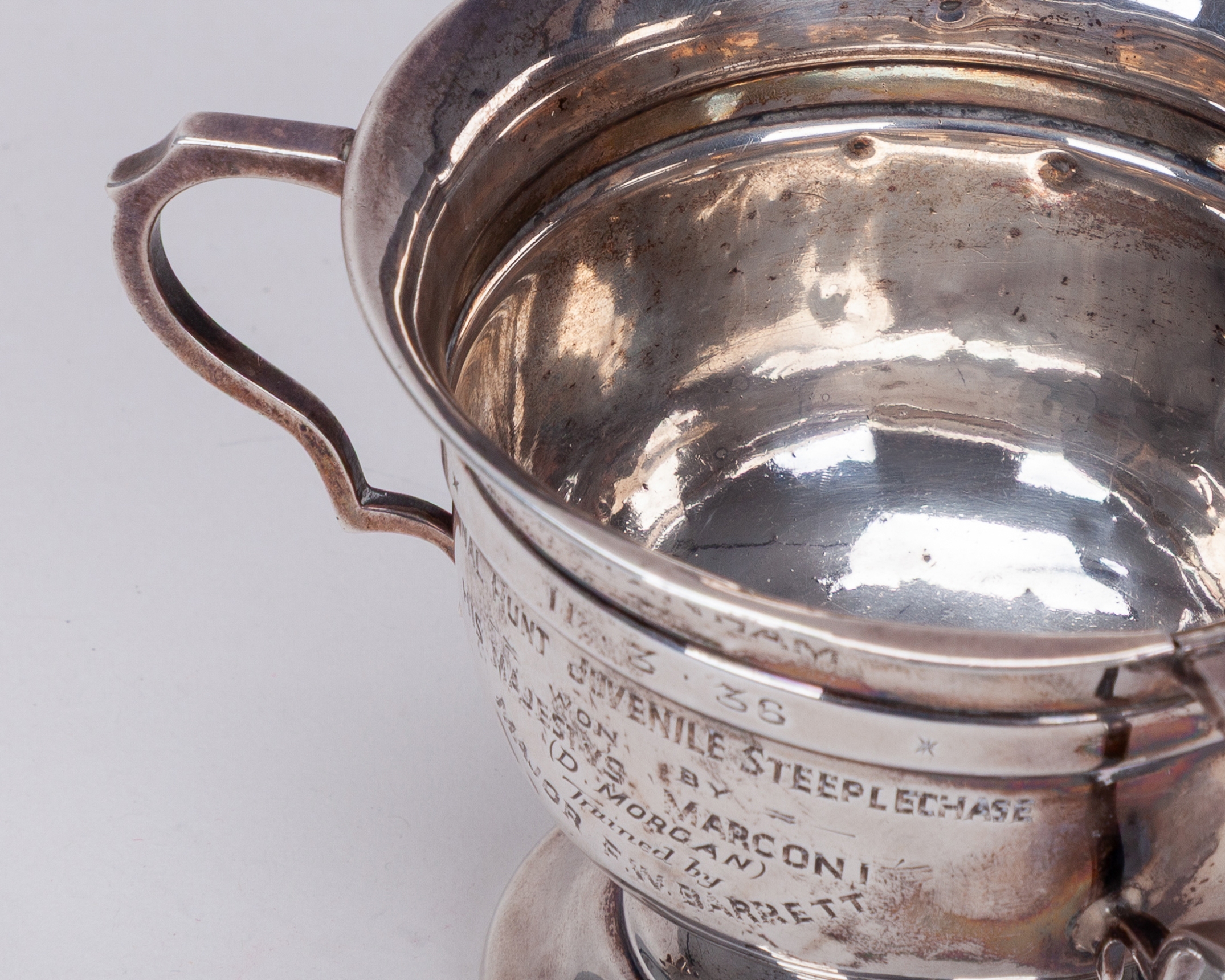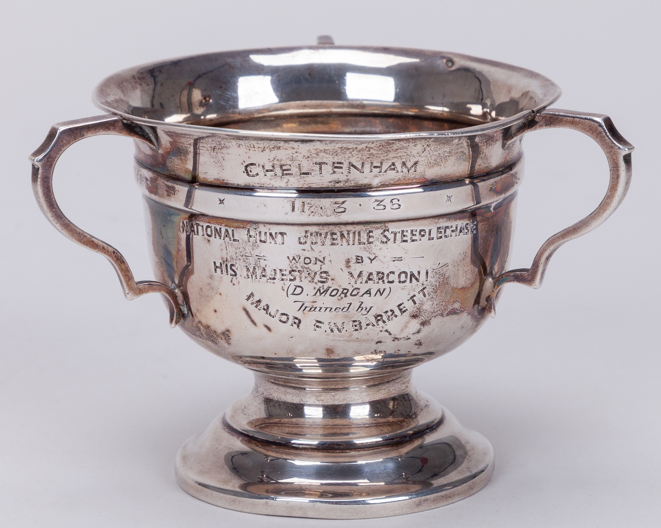 in the form of small silver loving cup, hallmarked Hamilton & Co., Sheffield, 1926, inscribed CHELTENHAM, 11.3.36, NATIONAL HUNT JUVENILE STEEPLECHASE, WON BY HIS MAJESTY'S MARCONI (D. MORGAN), TRAINED BY MAJOR F.W. BARRETT, height 7.5cm.