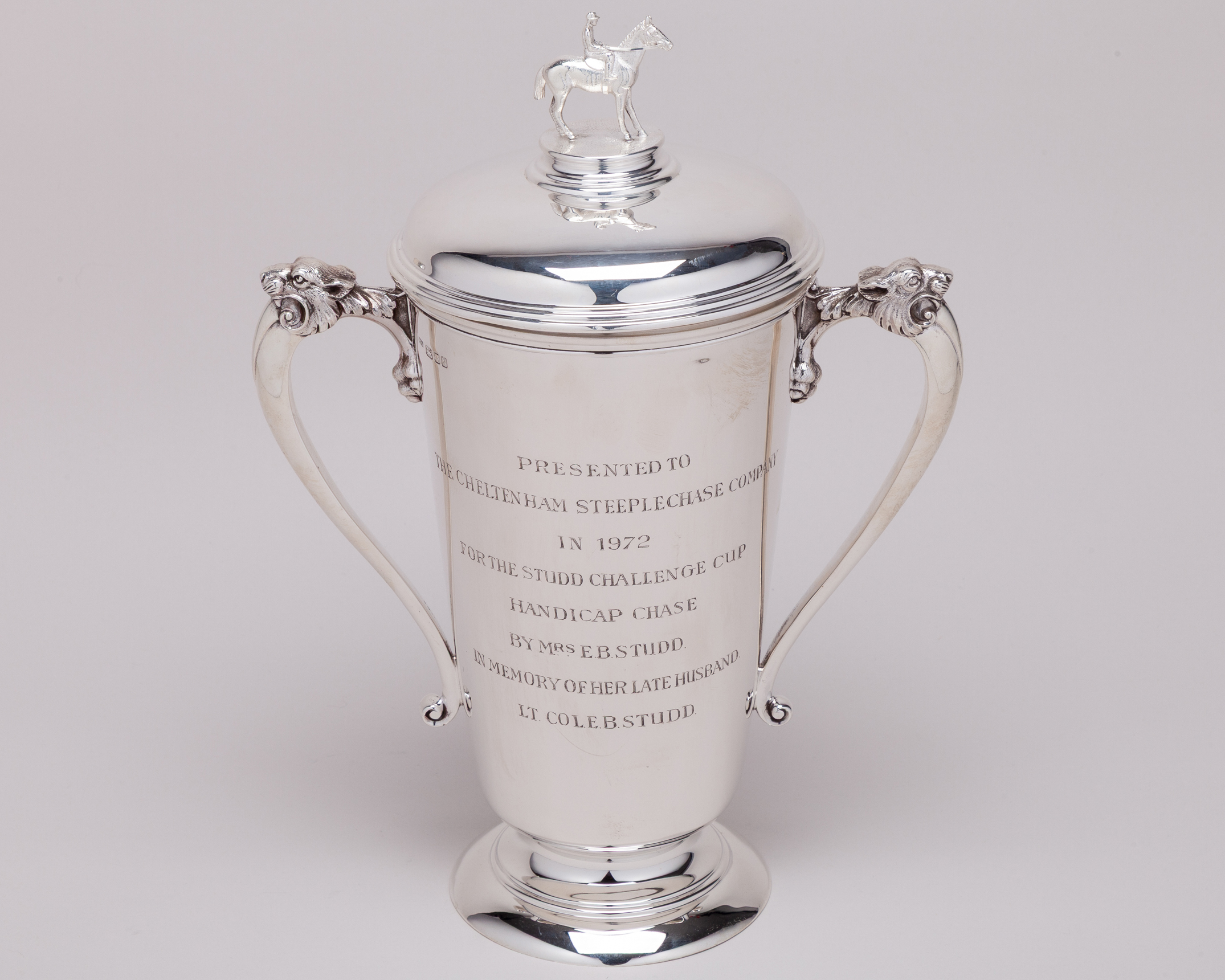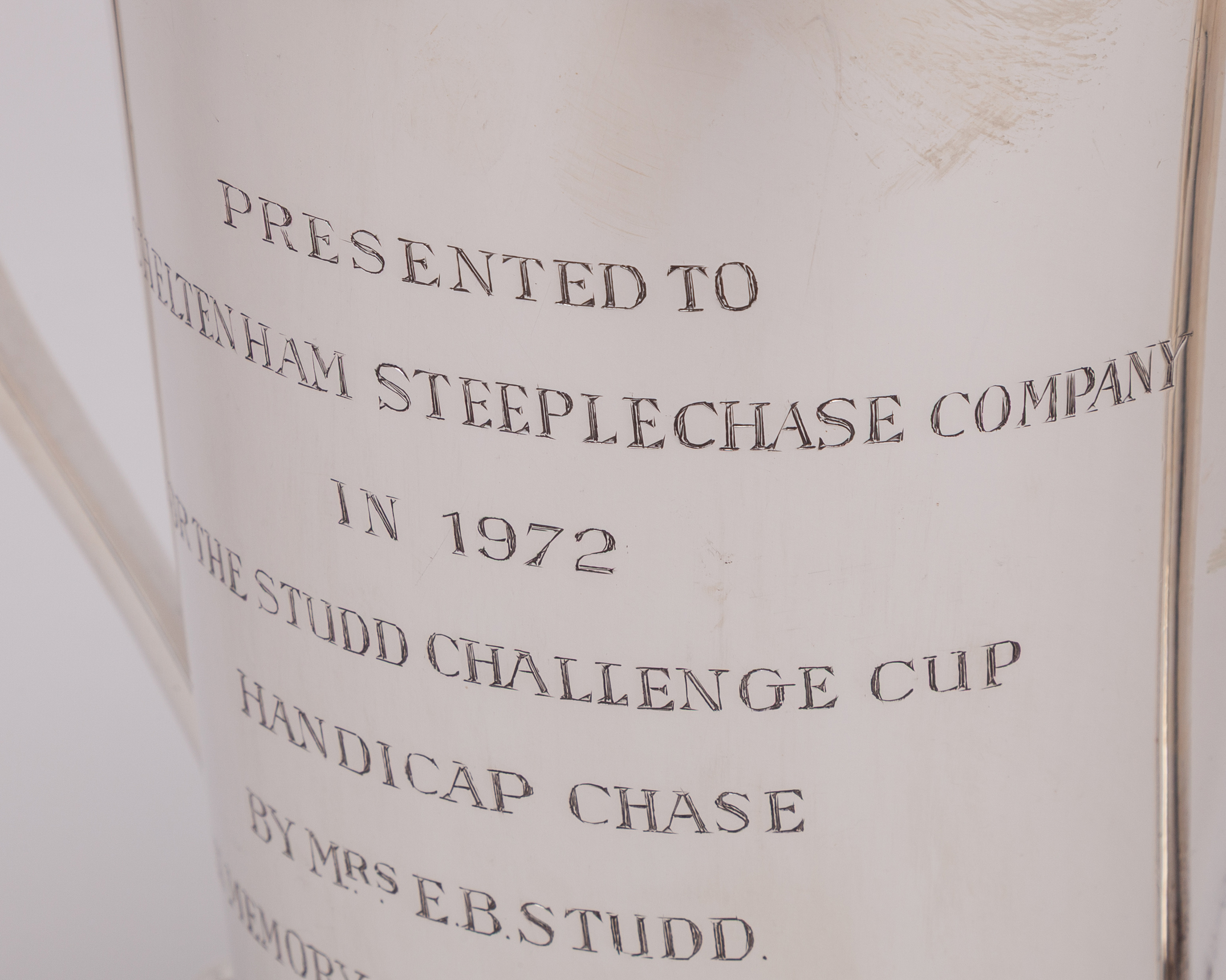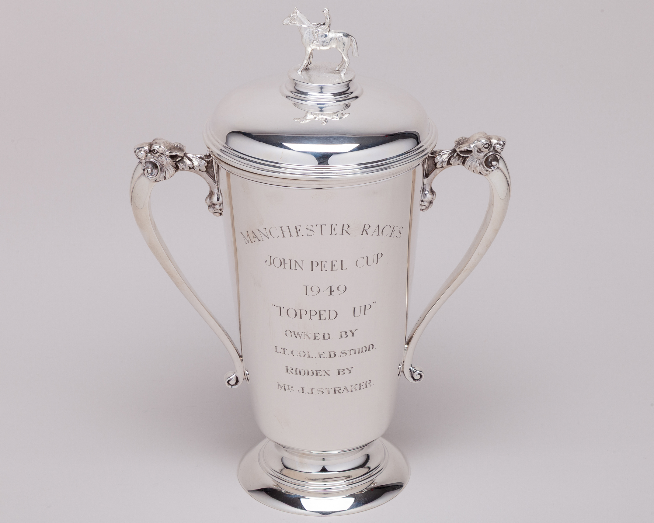 in the form of a silver two-handled trophy cup & cover, hallmarked Ollivant & Botsford, London, 1948, the cover surmounted by a model of a racehorse and jockey, the body inscribed MANCHESTER RACES, JOHN PEEL CUP, 1949, “TOPPED UP”, OWNED BY LT. COL. E.B. STUDD, RIDDEN BY Mr. J.J. STRAKER, later presented to Cheltenham Racecourse, the reverse side of the body inscribed PRESENTED TO THE CHELTENHAM STEEPLECHASE COMPANY IN 1972, FOR THE STUDD CHALLENGE CUP HANDICAP CHASE, BY Mrs. E.B. STUDD, IN MEMORY OF HER LATE HUSBAND LT. COL. E.B. STUDD, height 33cm., weight 1,295gr.