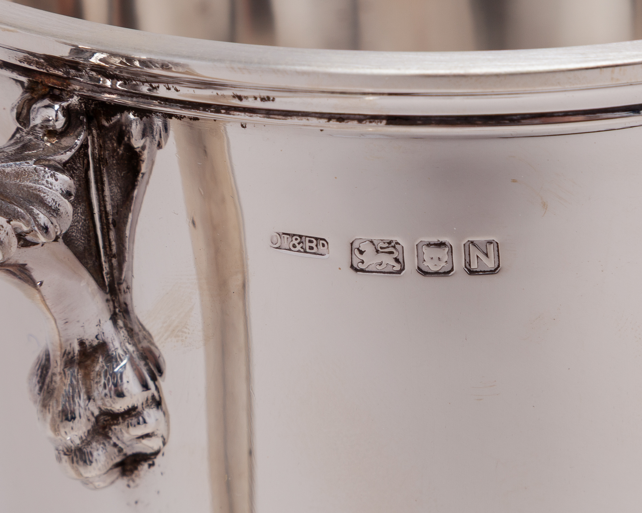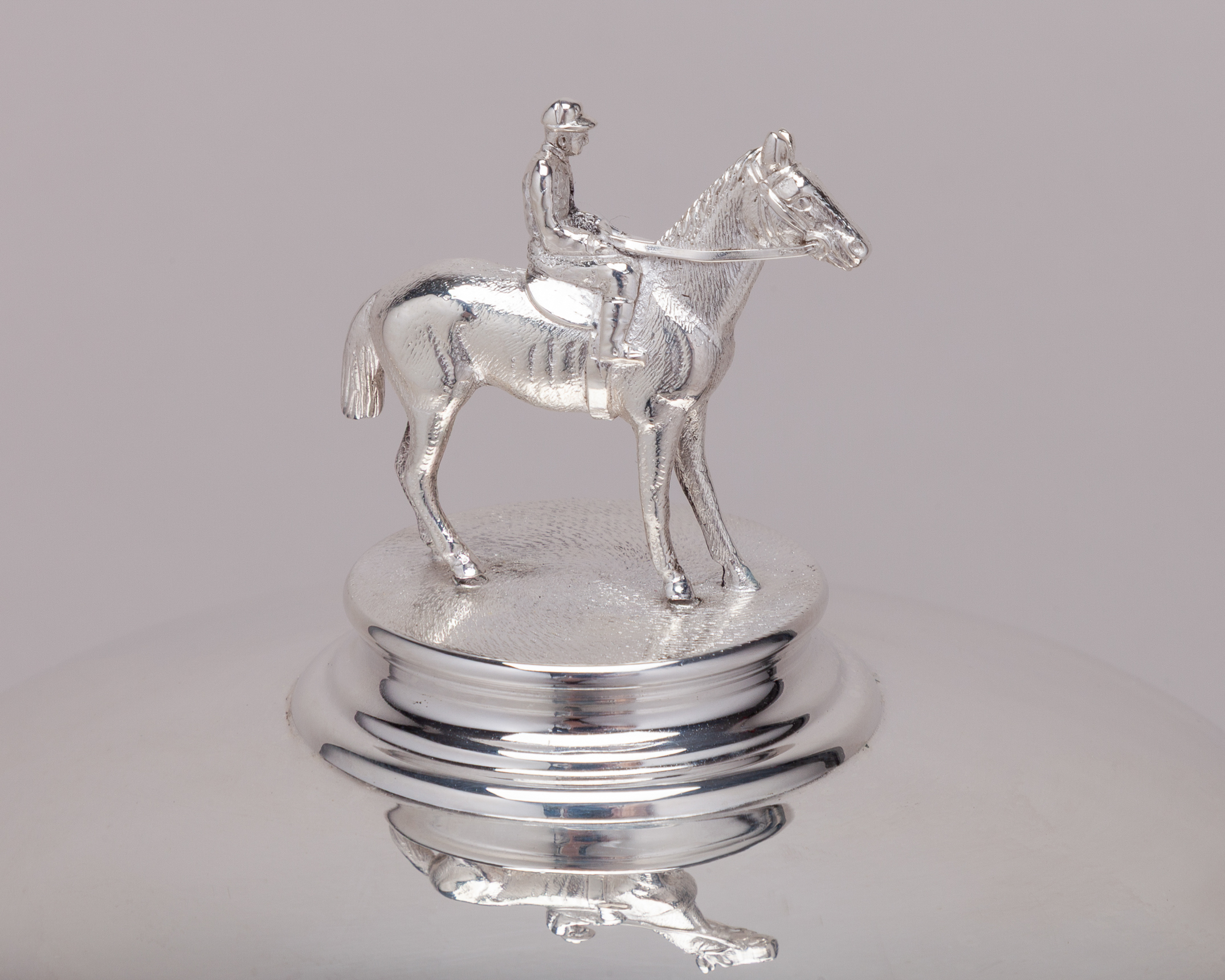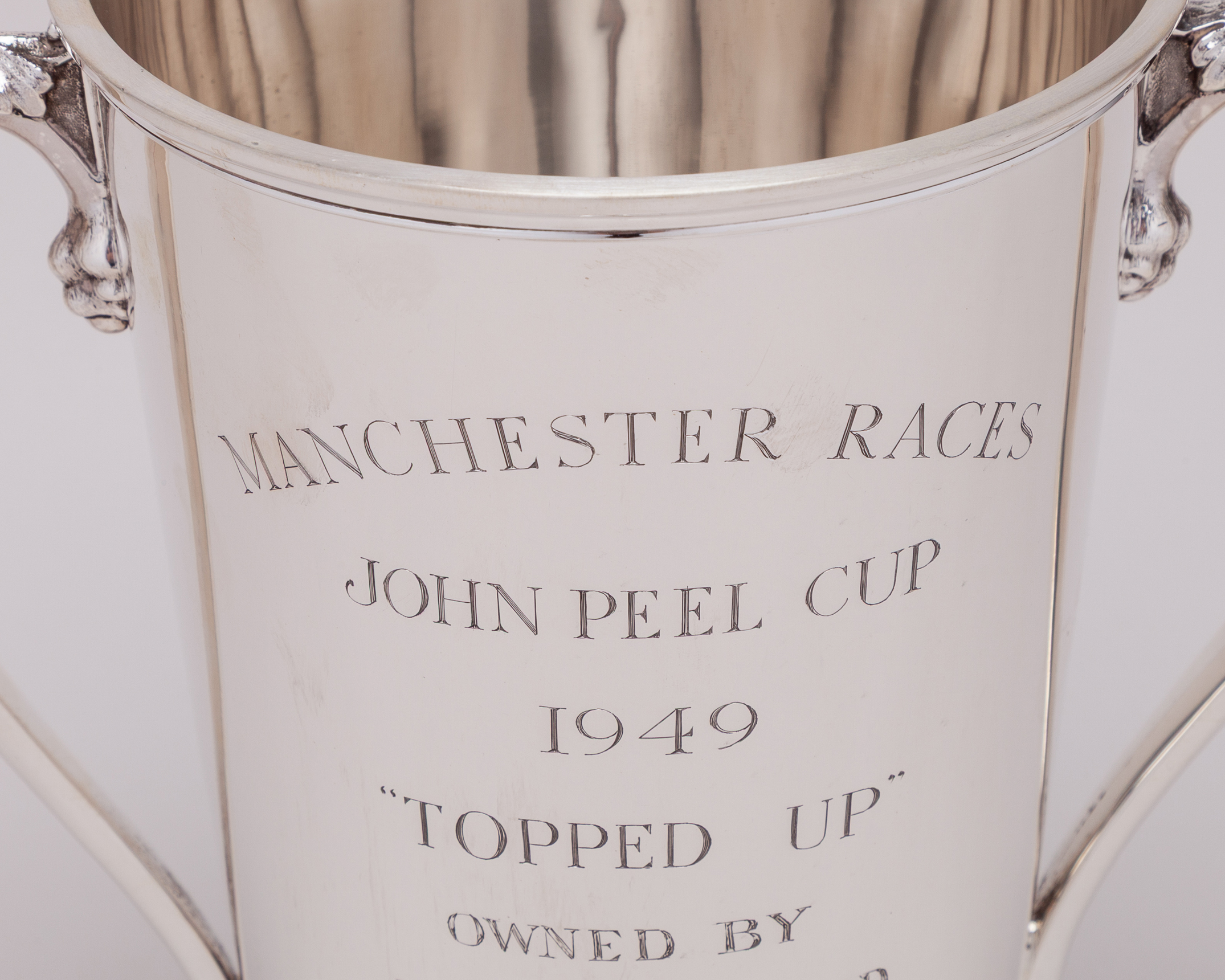in the form of a silver two-handled trophy cup & cover, hallmarked Ollivant & Botsford, London, 1948, the cover surmounted by a model of a racehorse and jockey, the body inscribed MANCHESTER RACES, JOHN PEEL CUP, 1949, “TOPPED UP”, OWNED BY LT. COL. E.B. STUDD, RIDDEN BY Mr. J.J. STRAKER, later presented to Cheltenham Racecourse, the reverse side of the body inscribed PRESENTED TO THE CHELTENHAM STEEPLECHASE COMPANY IN 1972, FOR THE STUDD CHALLENGE CUP HANDICAP CHASE, BY Mrs. E.B. STUDD, IN MEMORY OF HER LATE HUSBAND LT. COL. E.B. STUDD, height 33cm., weight 1,295gr.