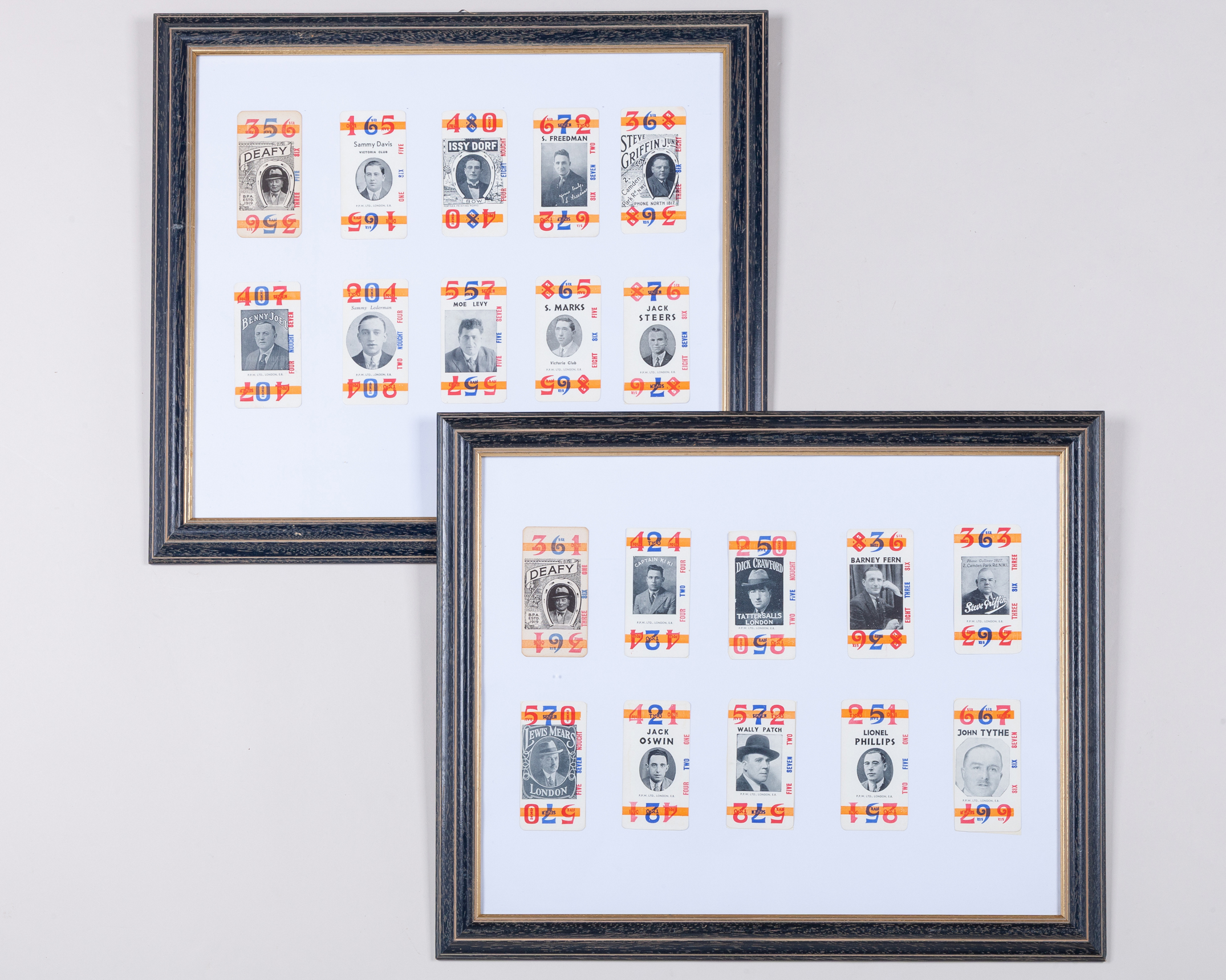 10 per frame, bookies comprising: Deafy (two), Captain Ki Ki, Dick Crawford, Barney Fern, Steve Griffin (two), Lewis Mears, Jack Oswin, Wally Patch, Lionel Phillips, John Tythe, Sammy Davis, Issy Dorf, S. Freedman, Benny Joel, Sammy Lederman, Moe Levy, S. Marks & Jack Steers, uniformly mounted, framed & glazed, overall 49 by 54cm.