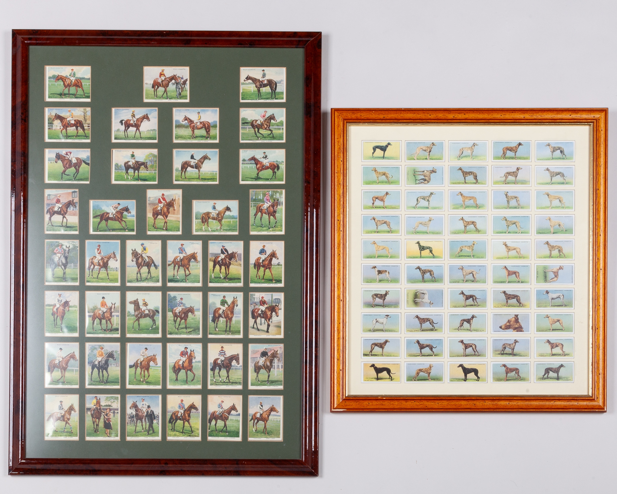 a 40/40 set of large-size issue Wills' Racehorses & Jockeys, 1938, double-glazed in a frame, 75 by 53cm.; sold together with a facsimile set of 50/50 racing greyhounds after the Churchman's original issue of 1934, in a smaller frame