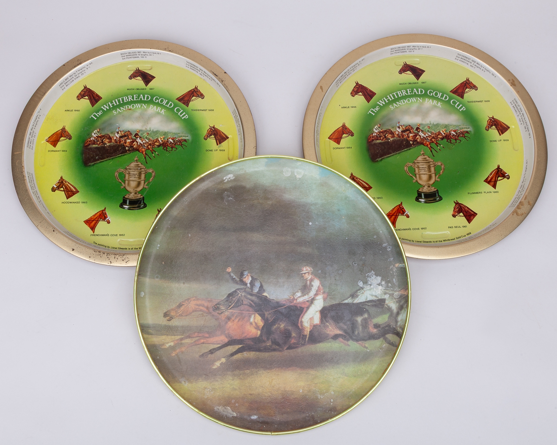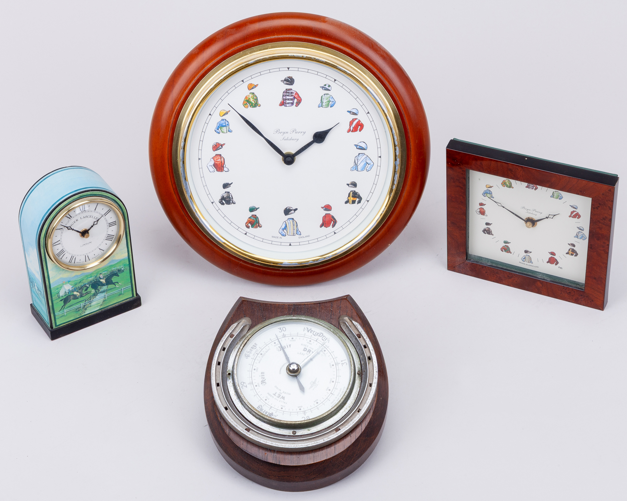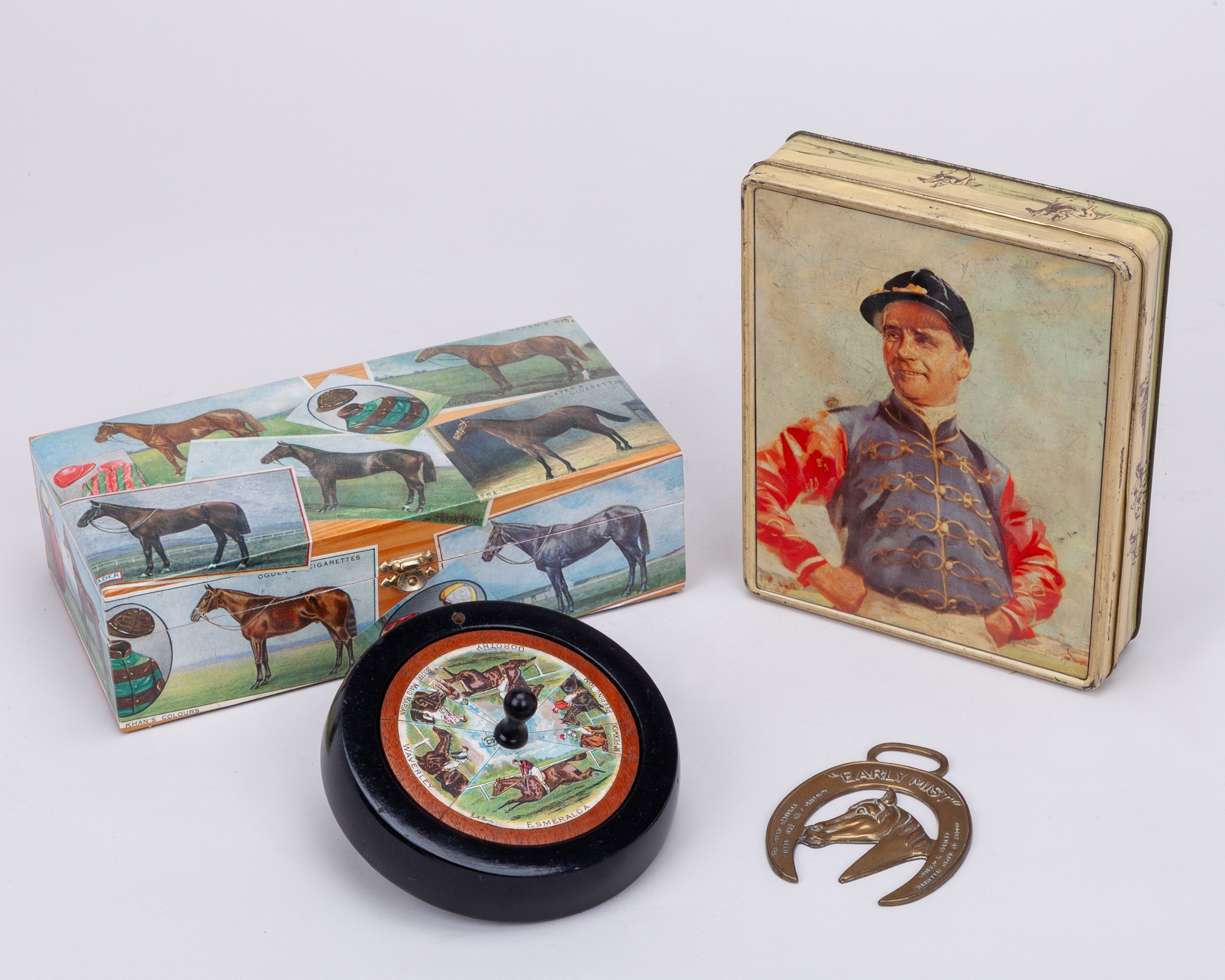 comprising: a vintage spinning wheel racing game; biscuit tin with portrait of Gordon Richards; metal print of Phar Lap; cigar box with decoration reproduced from cigarette cards; a wall clock and a bedside clock both by Bryn Parry of Salisbury with jockey colours; small mantel clock by Roger Lascelles of London with steeplechase scene; a barometer framed by a horse shoe; Victorian brass letter holder with racehorse & jockey; a horse brass of the Grand National winner Early Mist; two metal drinks trays featuring Whitbread Gold Cup winners; and a glass encased photograph of Tracy Piggott winning the Ladies Race at Leopardstown 28th August 1988