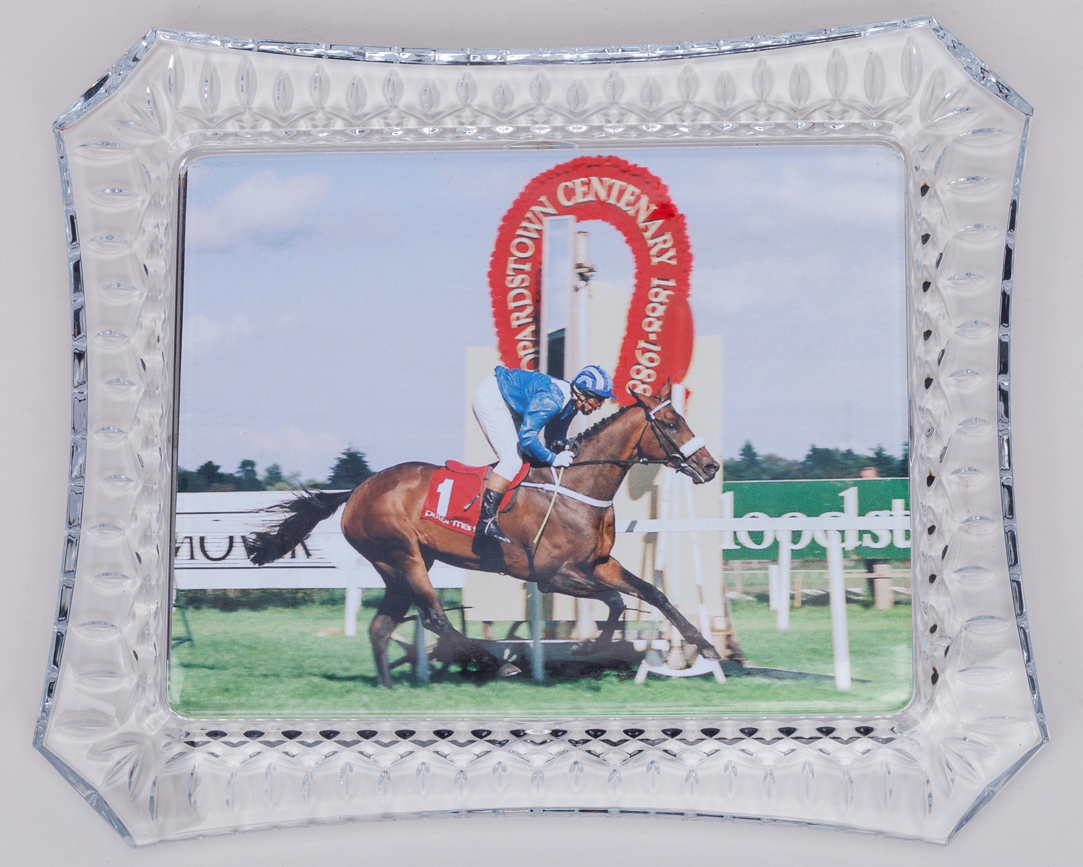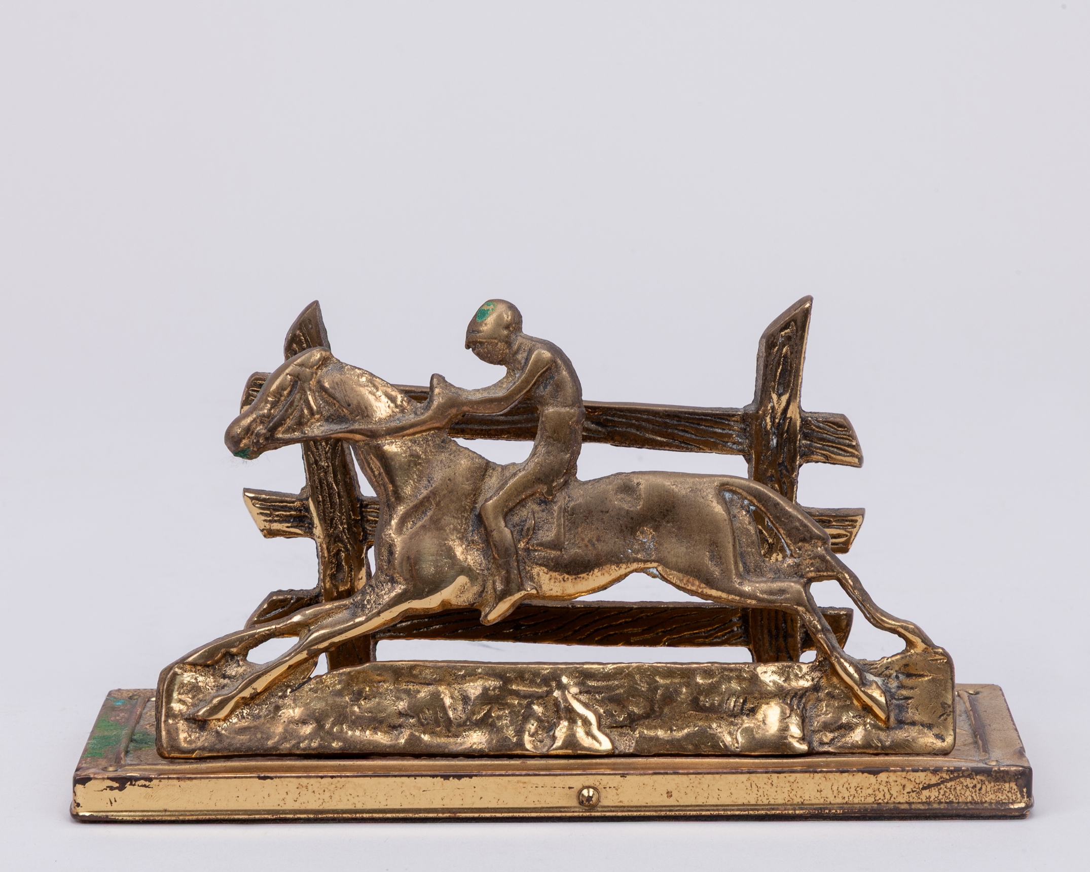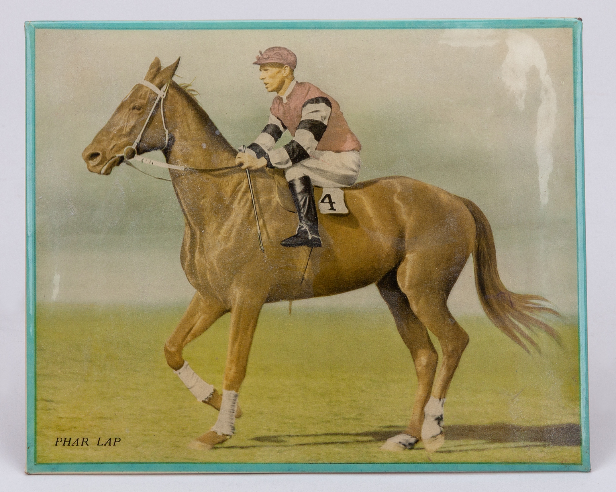 comprising: a vintage spinning wheel racing game; biscuit tin with portrait of Gordon Richards; metal print of Phar Lap; cigar box with decoration reproduced from cigarette cards; a wall clock and a bedside clock both by Bryn Parry of Salisbury with jockey colours; small mantel clock by Roger Lascelles of London with steeplechase scene; a barometer framed by a horse shoe; Victorian brass letter holder with racehorse & jockey; a horse brass of the Grand National winner Early Mist; two metal drinks trays featuring Whitbread Gold Cup winners; and a glass encased photograph of Tracy Piggott winning the Ladies Race at Leopardstown 28th August 1988