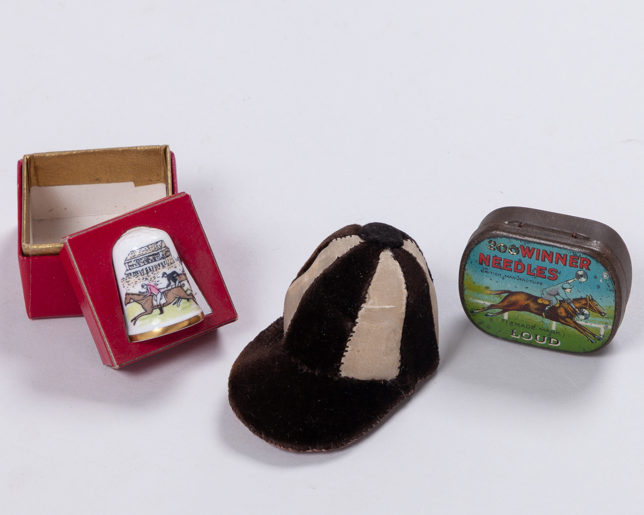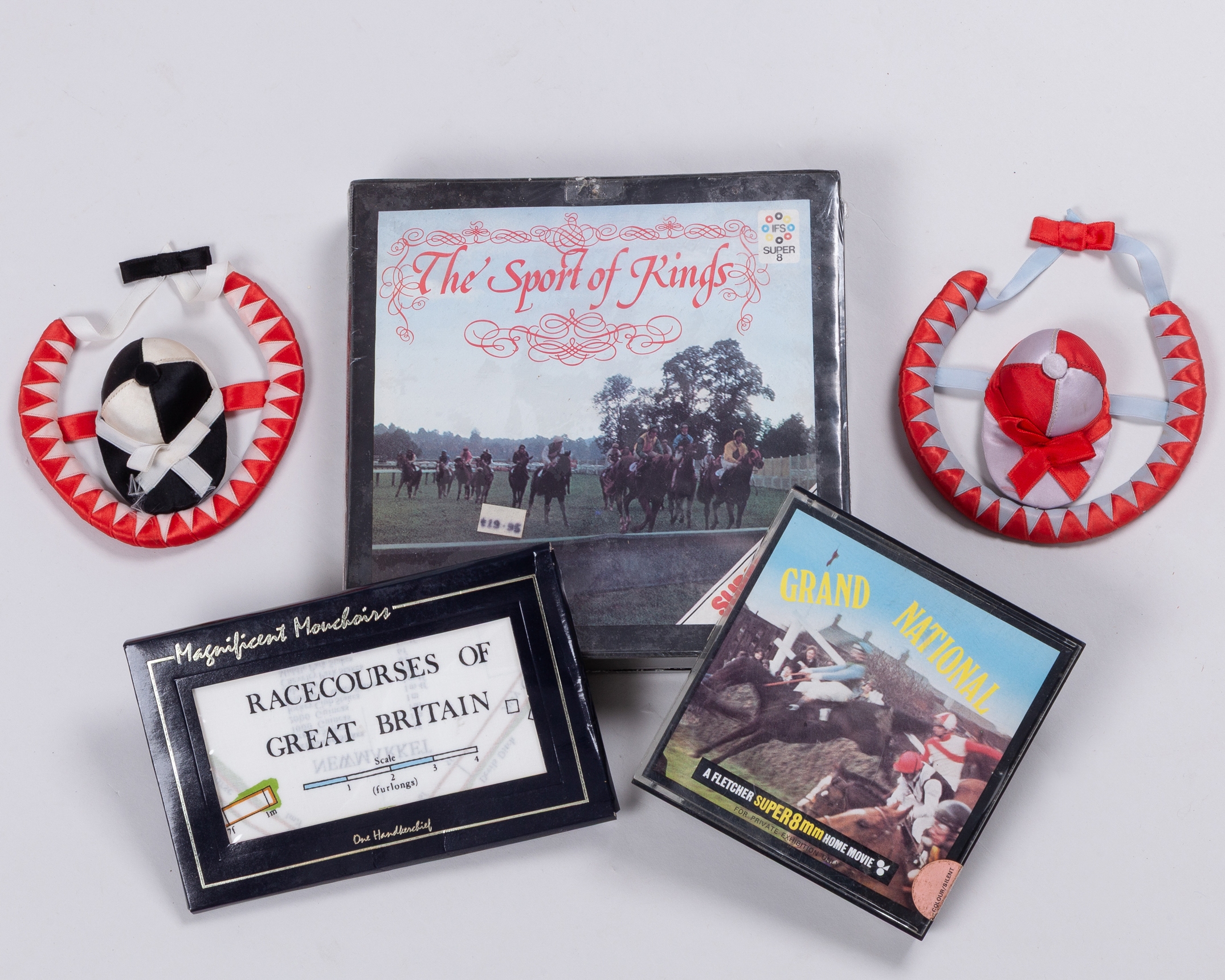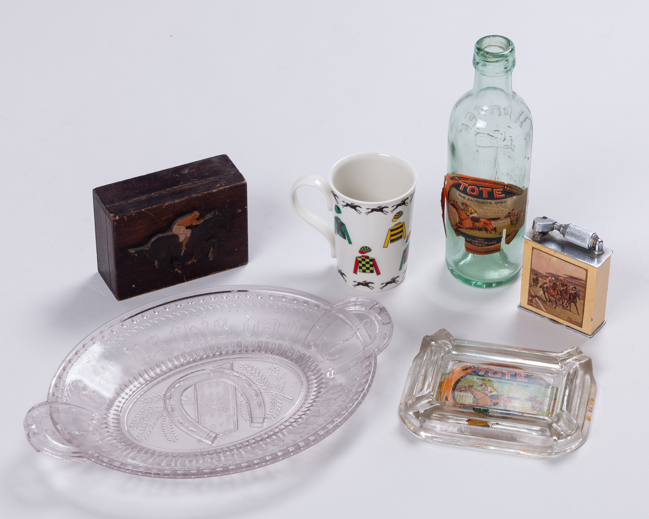 two cold painted bronze racehorse & jockey table cigarette lighters, one damaged, both with paint loss; small brass racehorse & jockey; small spelter racehorse & jockey; a horse brass; a hip flask; a McMurdo table cigarette lighter with Ascot decoration; wooden box with the lid applied with a wooden cut-out racehorse & jockey; small needles tin “Winners Needles”; jockey cap pin cushion; “Tote” Sportsman's Tonic bottle and an ashtray; pressed glass dish with horseshoe motif; two silk dressed horseshoes; a gent's handkerchief; a tea towel racecouses map; Super 8mm Grand National film (year unknown) and another film titled “Sport of Kings”; a china thimble; and a National Horseracing Museum souvenir shop mug