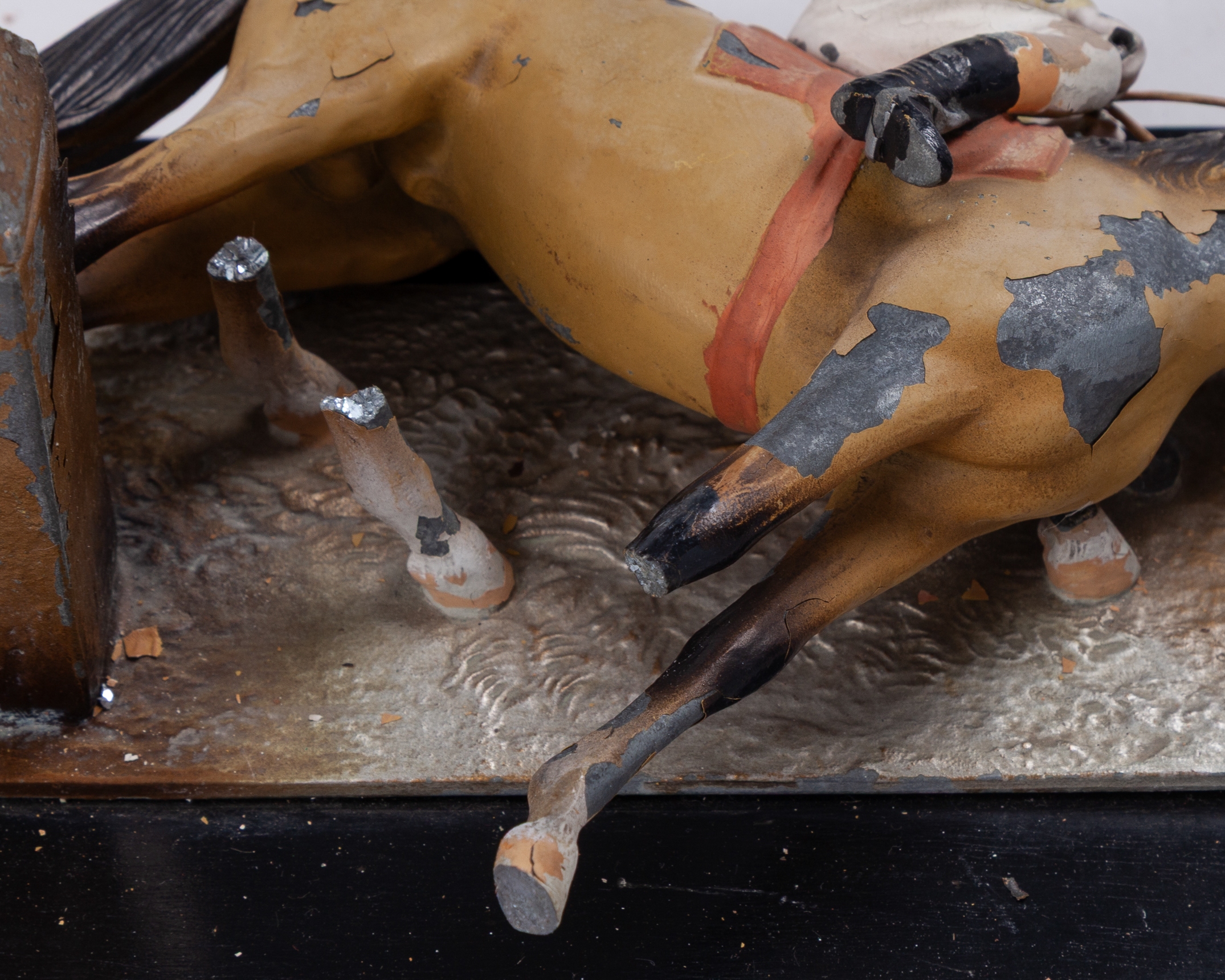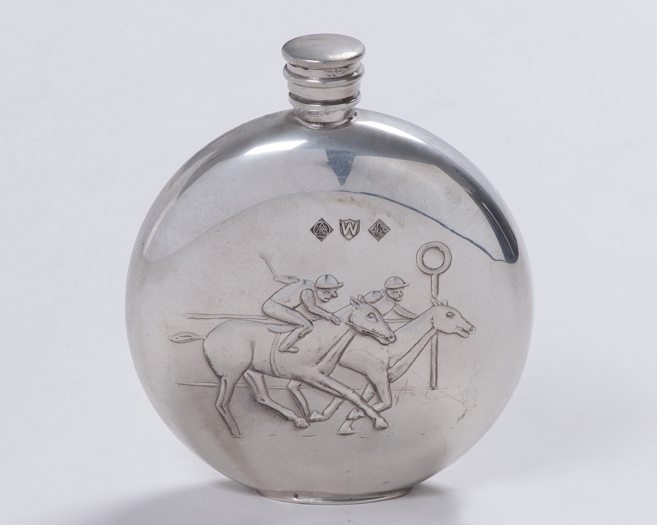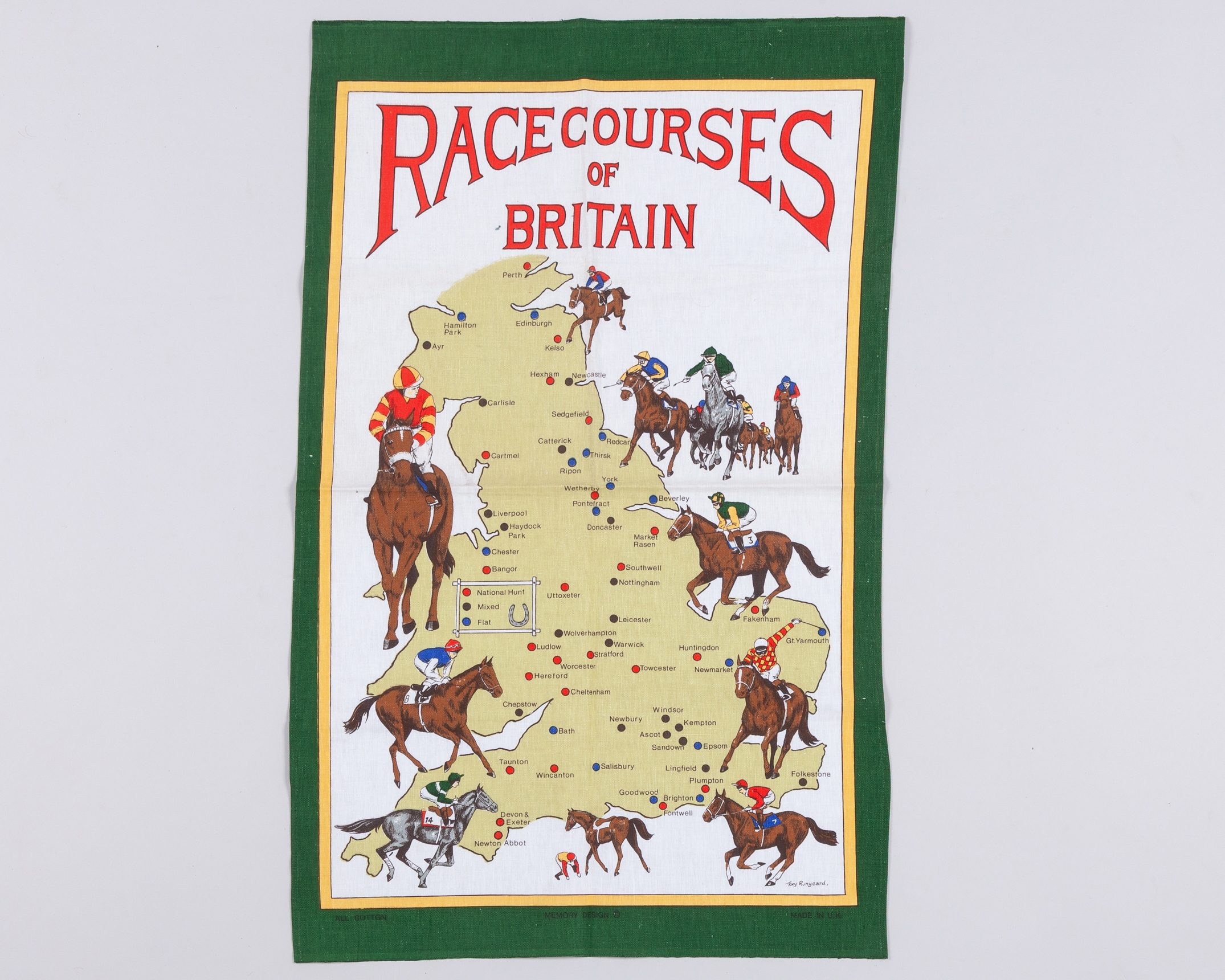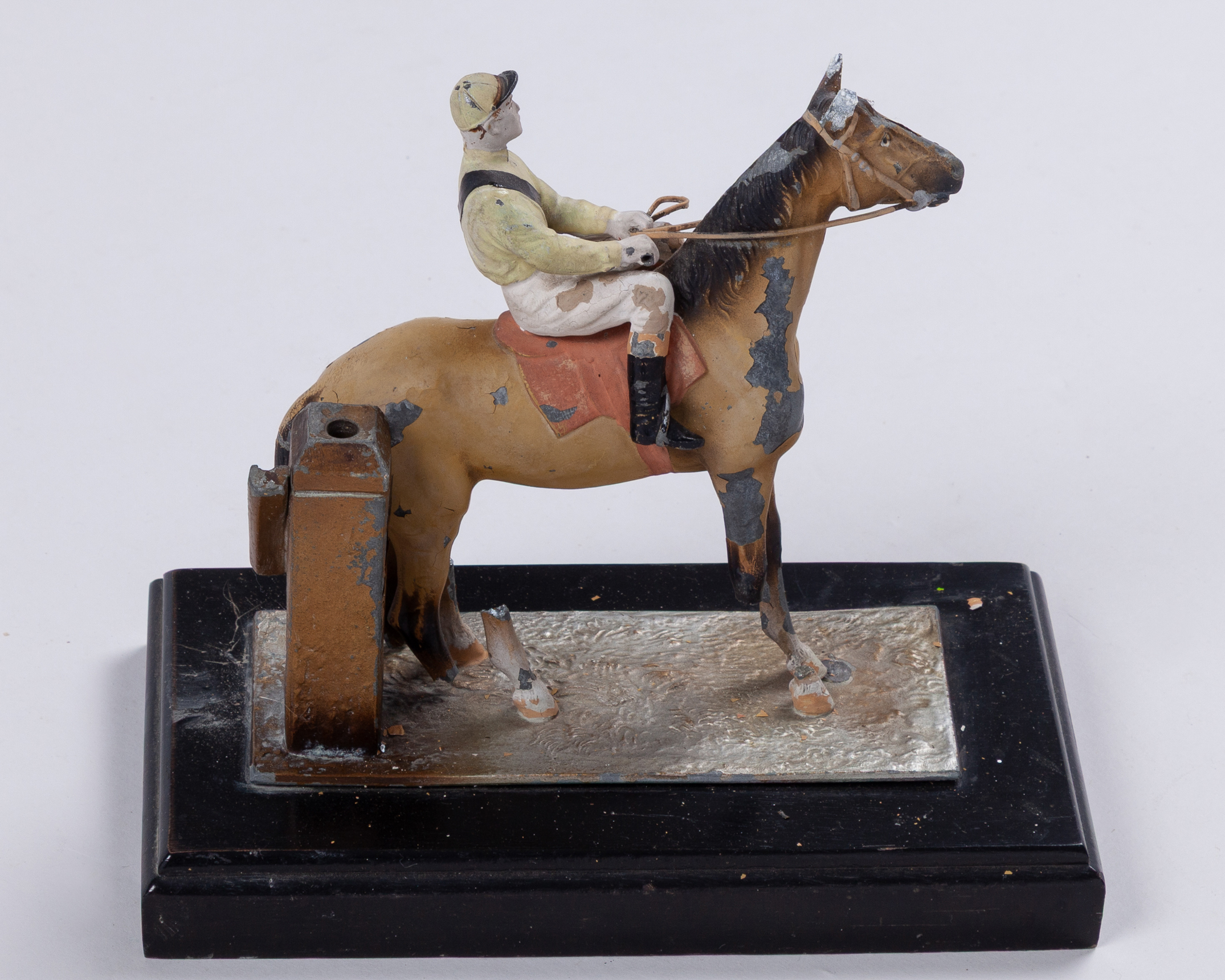 two cold painted bronze racehorse & jockey table cigarette lighters, one damaged, both with paint loss; small brass racehorse & jockey; small spelter racehorse & jockey; a horse brass; a hip flask; a McMurdo table cigarette lighter with Ascot decoration; wooden box with the lid applied with a wooden cut-out racehorse & jockey; small needles tin “Winners Needles”; jockey cap pin cushion; “Tote” Sportsman's Tonic bottle and an ashtray; pressed glass dish with horseshoe motif; two silk dressed horseshoes; a gent's handkerchief; a tea towel racecouses map; Super 8mm Grand National film (year unknown) and another film titled “Sport of Kings”; a china thimble; and a National Horseracing Museum souvenir shop mug