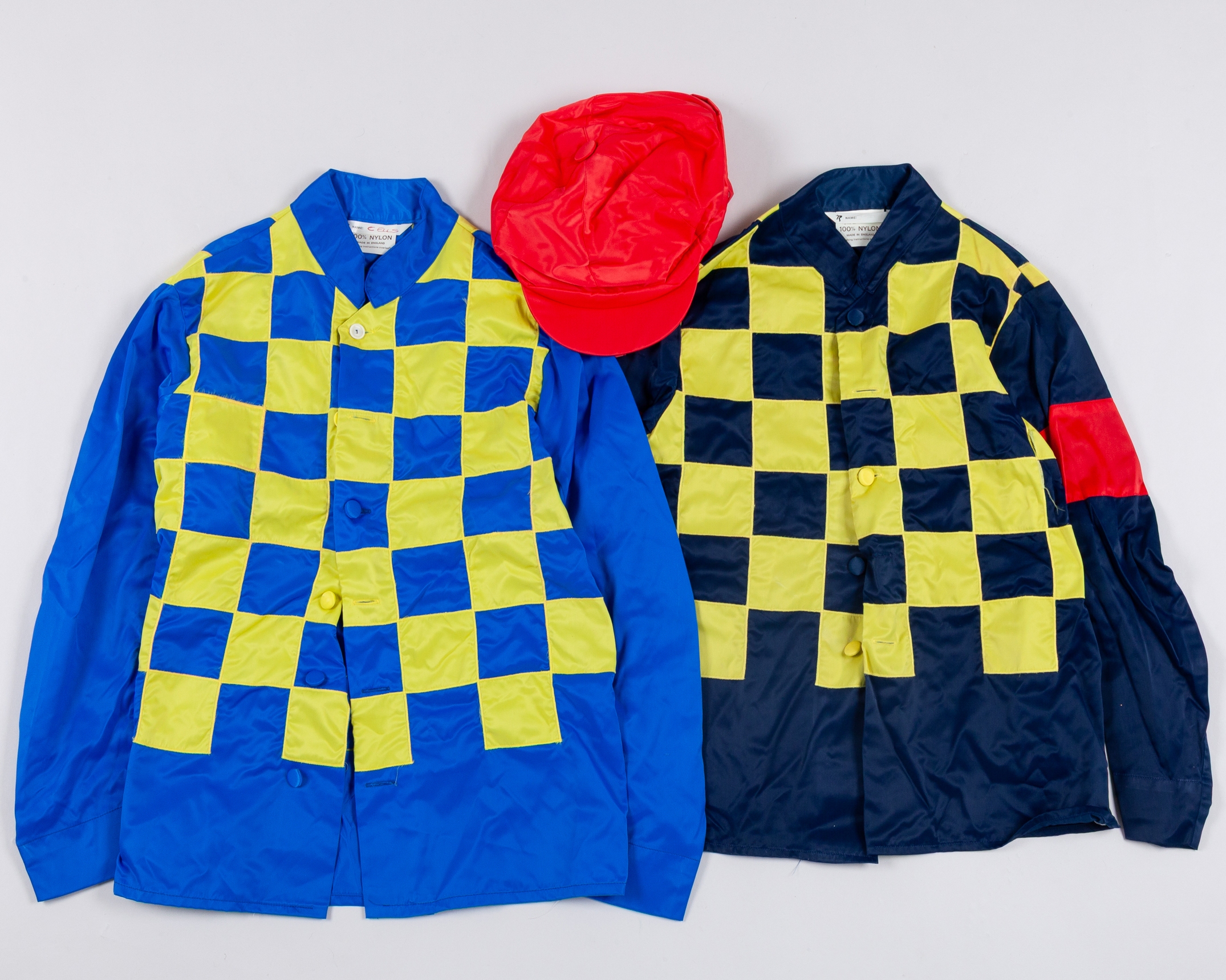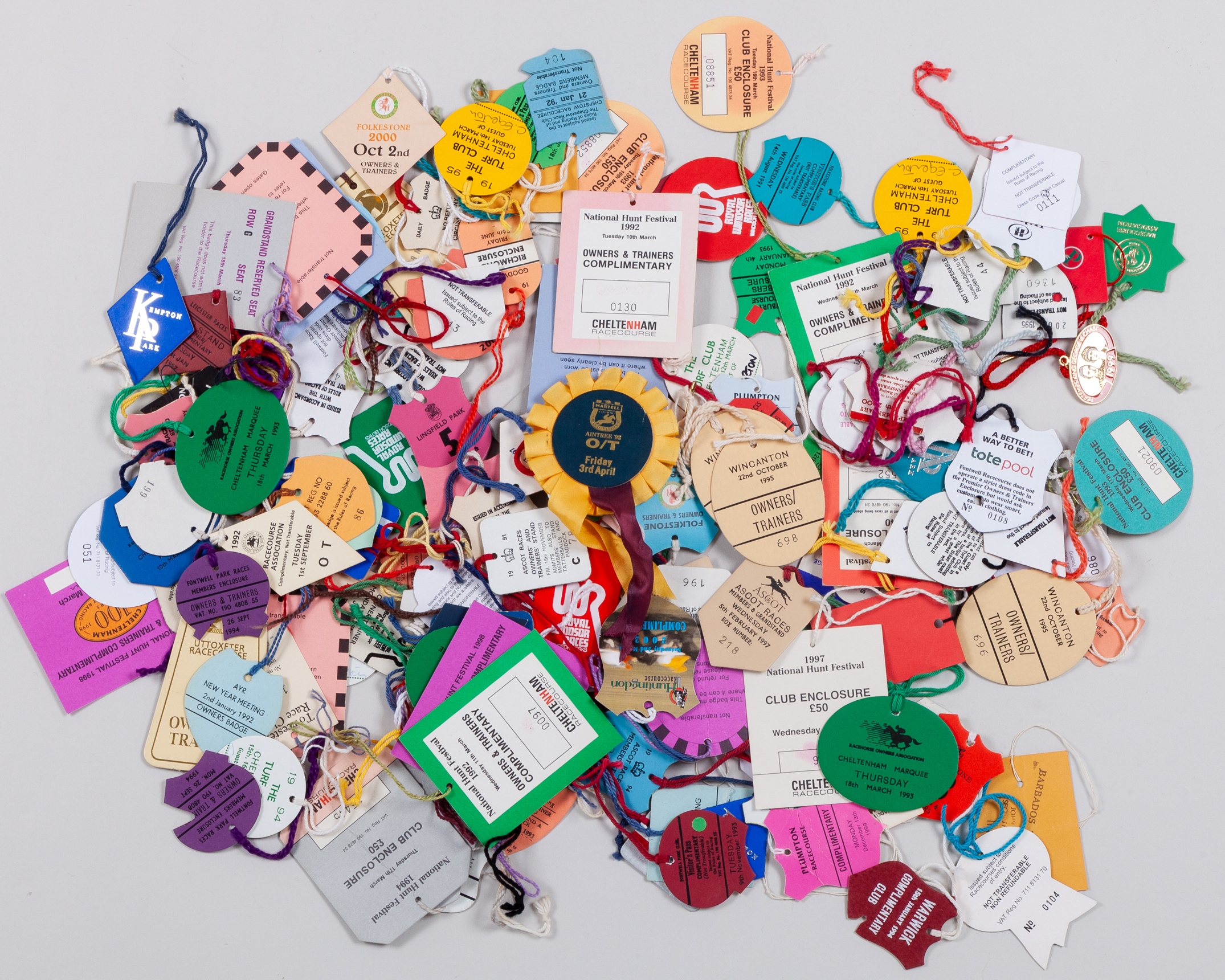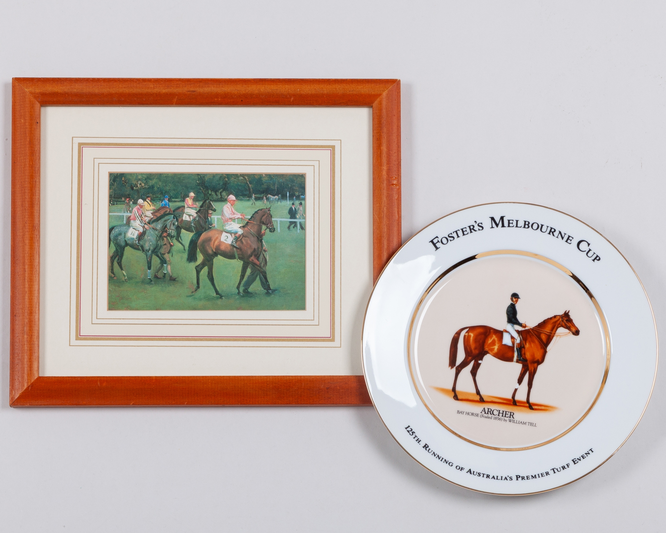 three sets of jockey silks (one lacking cap), one by Allerton; a collection of 167 cardboard racecourse day badges dating between 1991 and 2011 and issued by 31 British racecourses (two now defunct Folkestone & Towcester) plus Barbados; a china plate commemorating the 125th running of the Melbourne Cup, featuring a portrait of the first winner Archer in 1861, 26cm. diameter; and a small framed print after Munnings