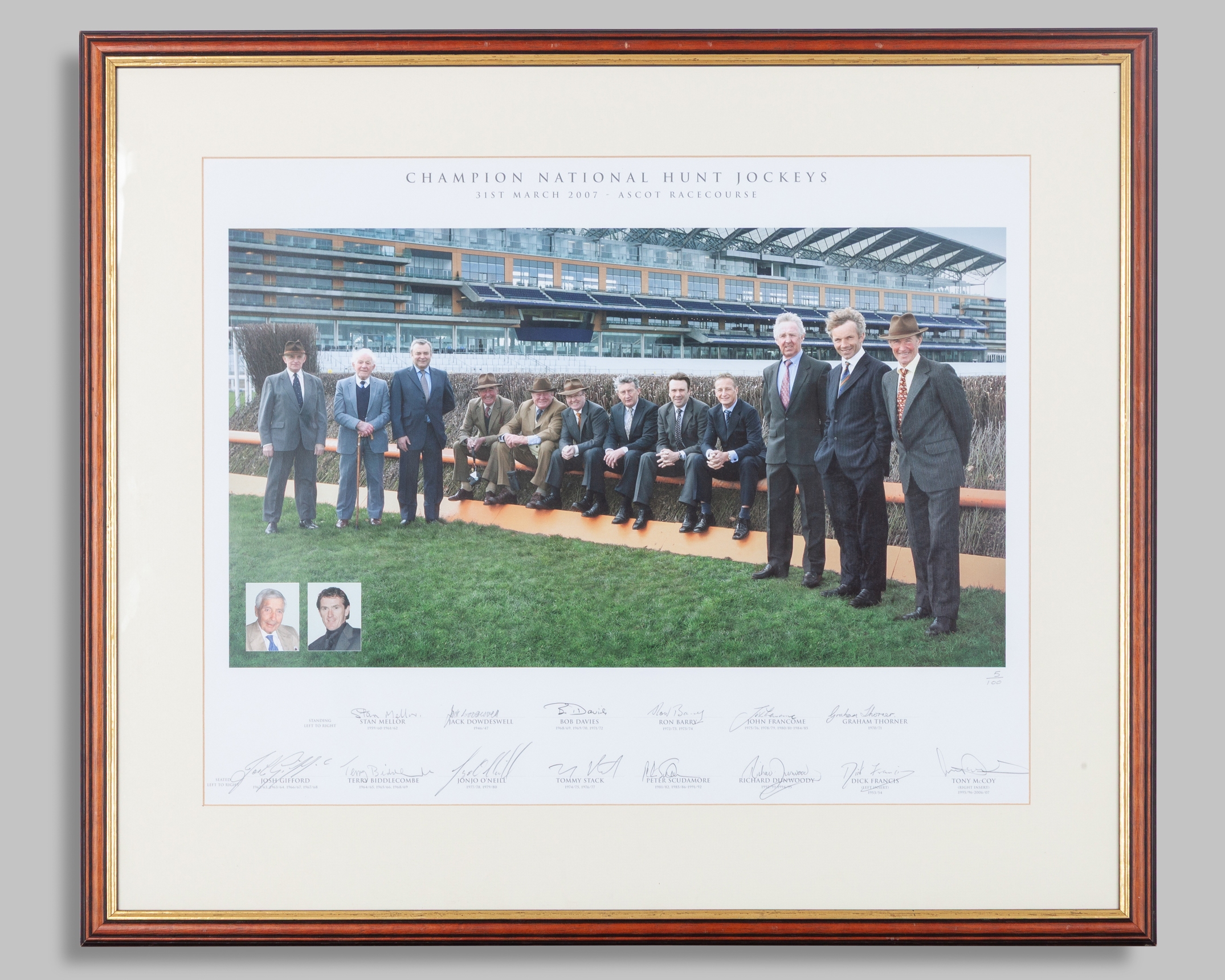 Champion National Hunt Jockeys signed framed print, with central colour photograph from 2007 of the jockeys Stan Mellor, Jack Dowdeswell, Bob Davies, Ron Barry, John Francome, Graham Thorner, Josh Gifford, Terry Biddlecombe, Jonjo O'Neill, Tommy Stack, Peter Scudamore and Richard Dunwoody, with inset portraits of Dick Francis and Tony McCoy, signed in pencil by all 14 jockeys, limited edition, numbered 5 of 100, mounted, framed & glazed, overall 67 by 79cm., good condition