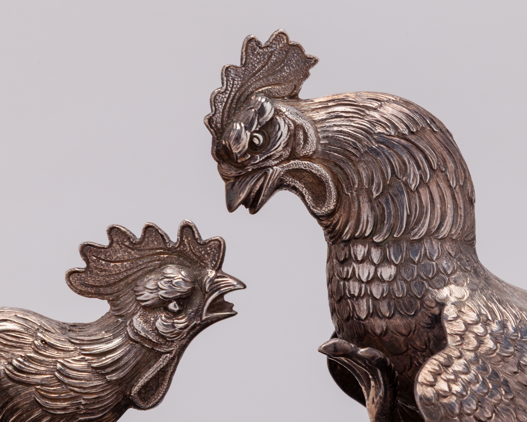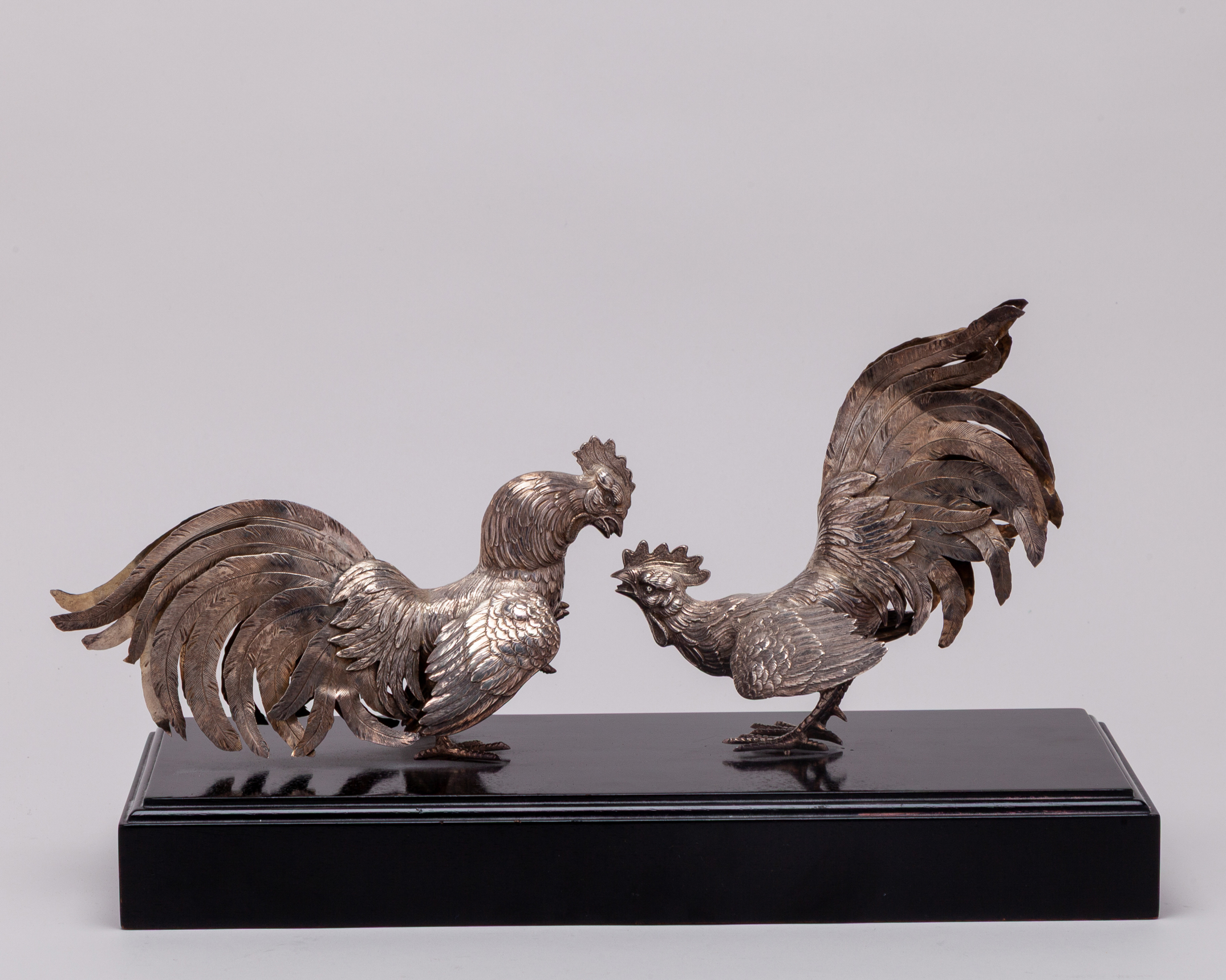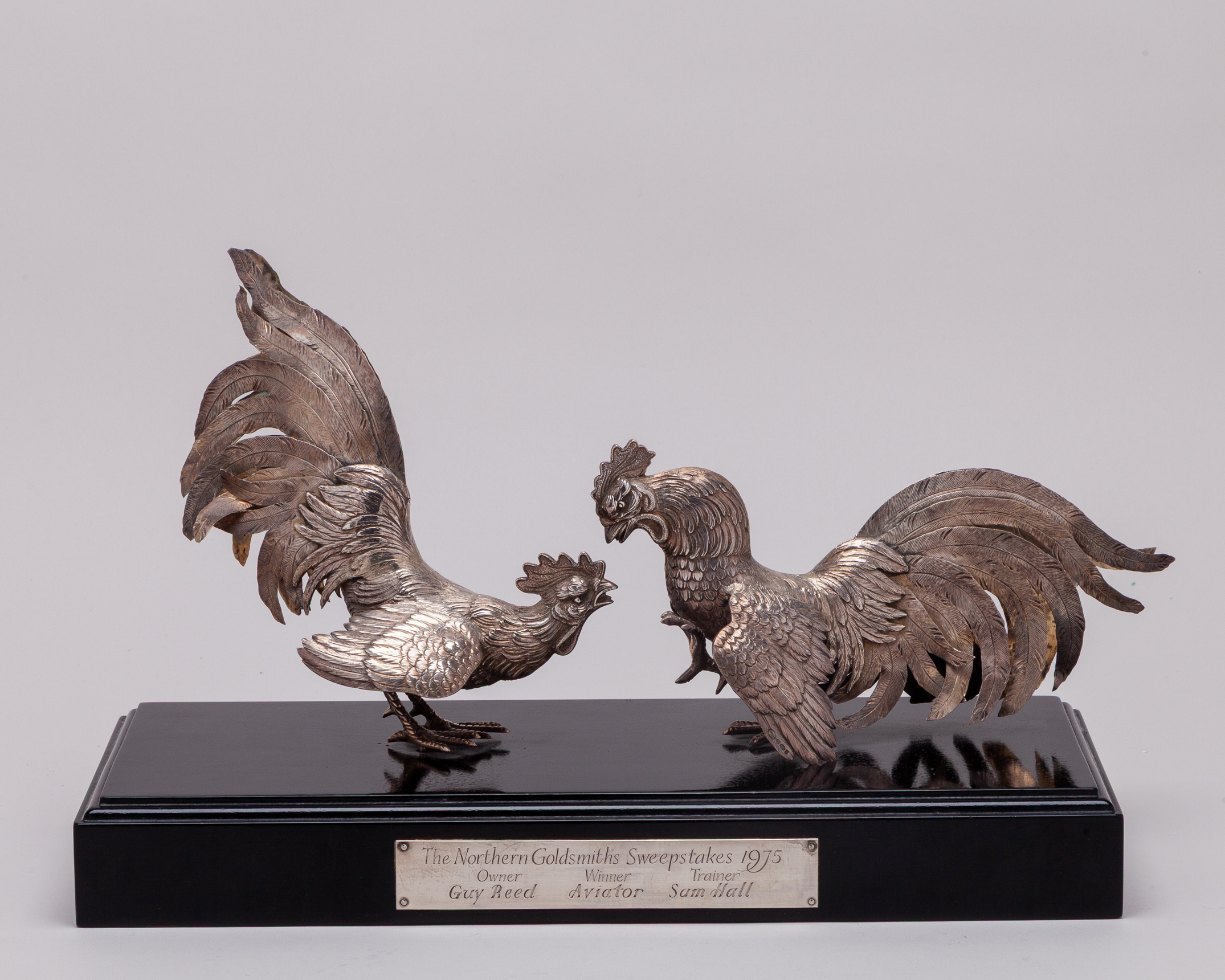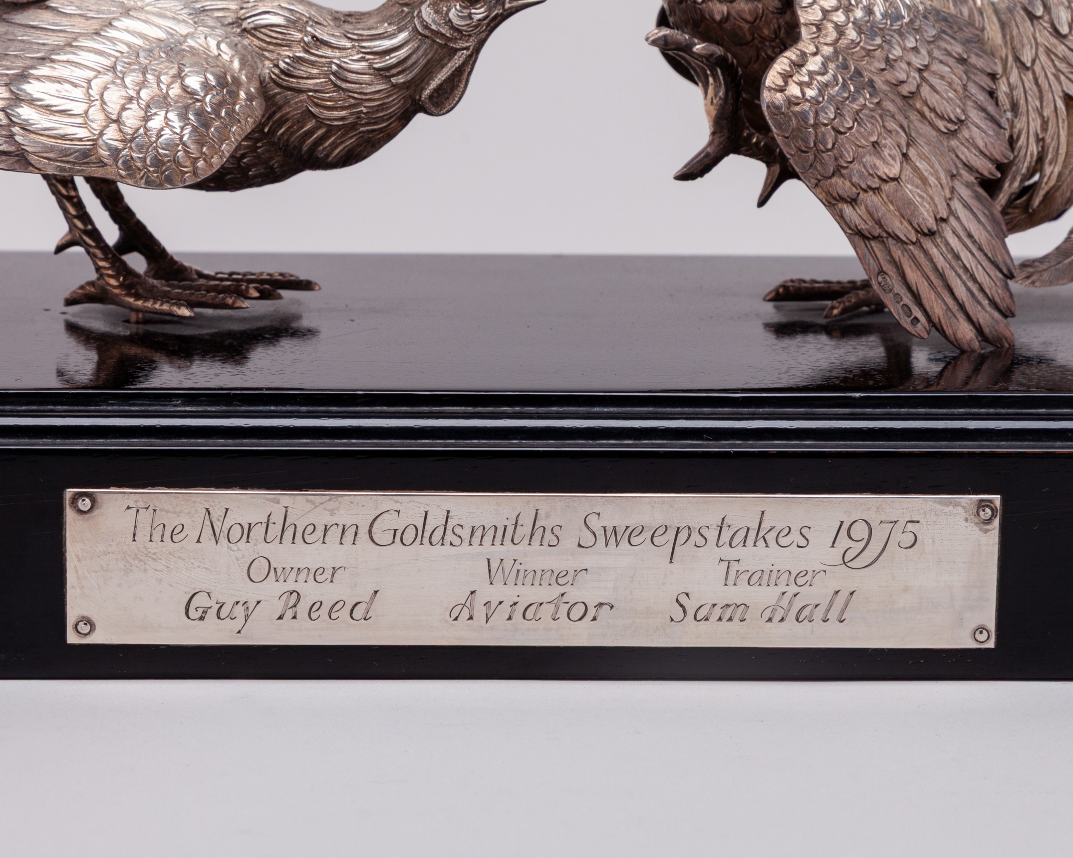 in the form of two sterling silver fighting cocks, stamped .925, Import Date Letter “S”, mounted on an ebonised plinth set with plaque reading: THE NORTHERN GOLDSMITHS SWEEPSTAKES 1975, OWNER - GUY READ, WINNER - AVIATOR, TRAINER SAM HALL, weight (silver) 557gr., 25 by 38 by 15cm.