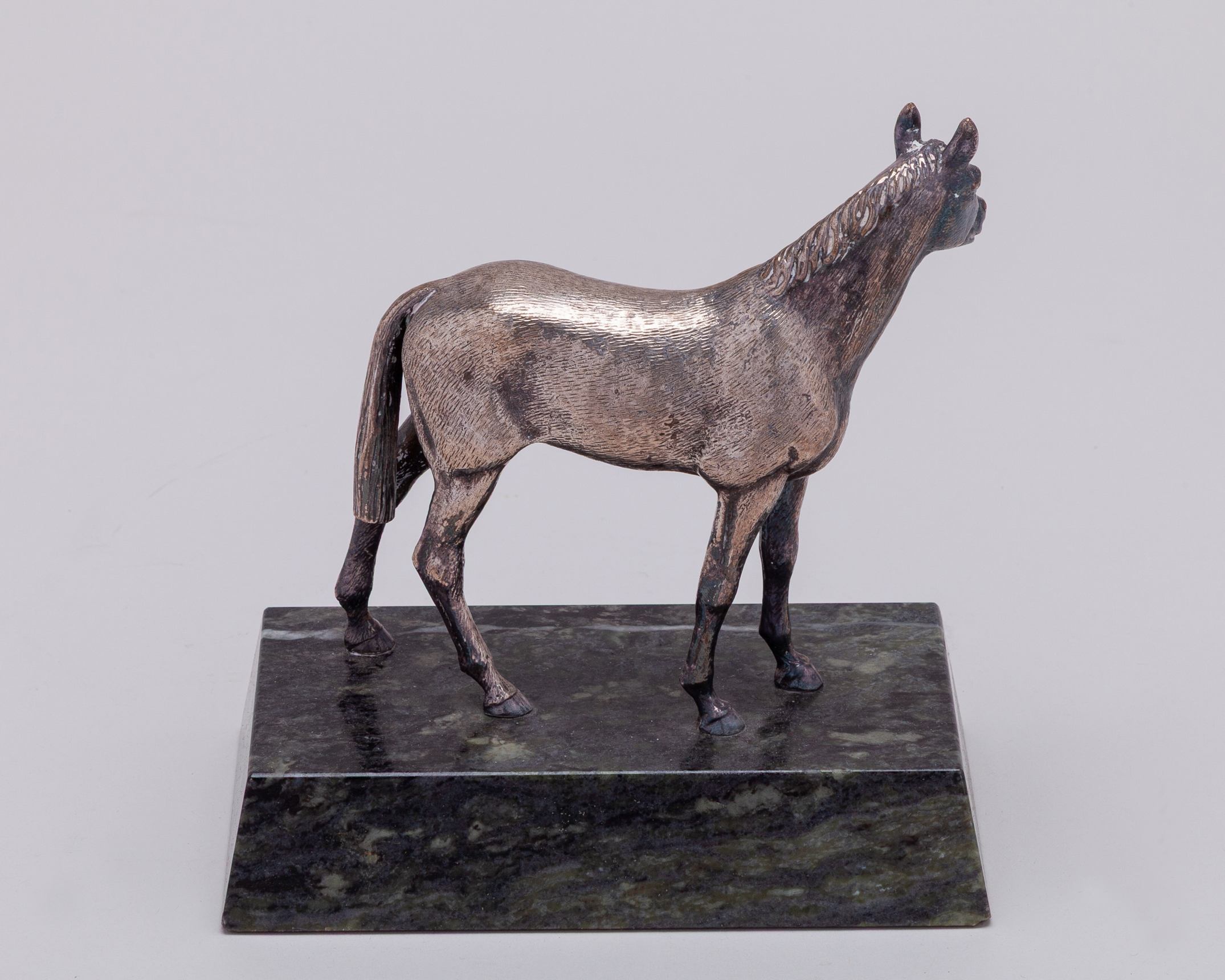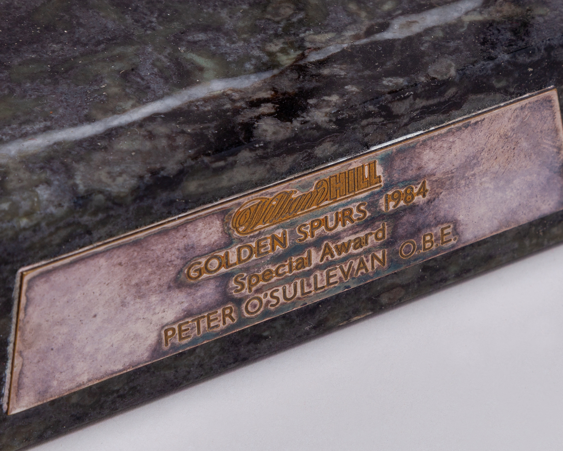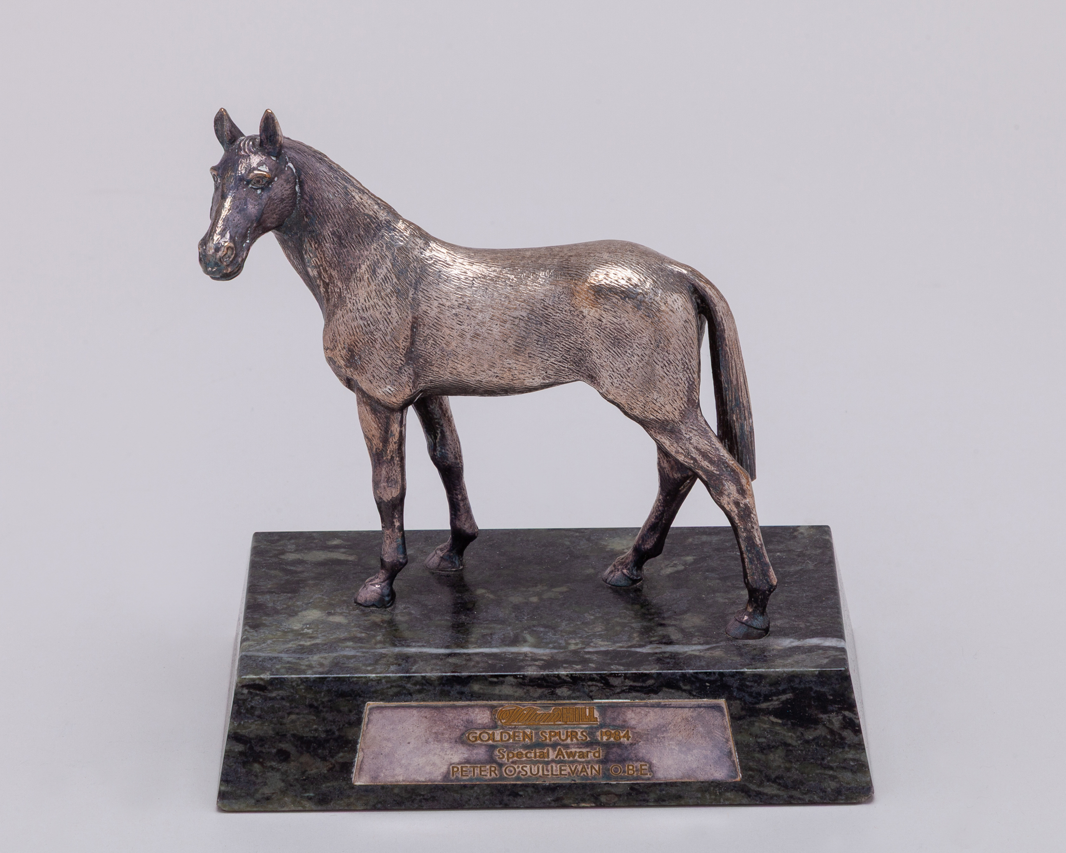 in the form of a textured silver-plate model of a standing thoroughbred, set on a marble plinth with plaque inscribed WILLIAM HILL, GOLDEN SPURS 1984, SPECIAL AWARD, PETER O'SULLEVAN O.B.E., 16 by 15cm.