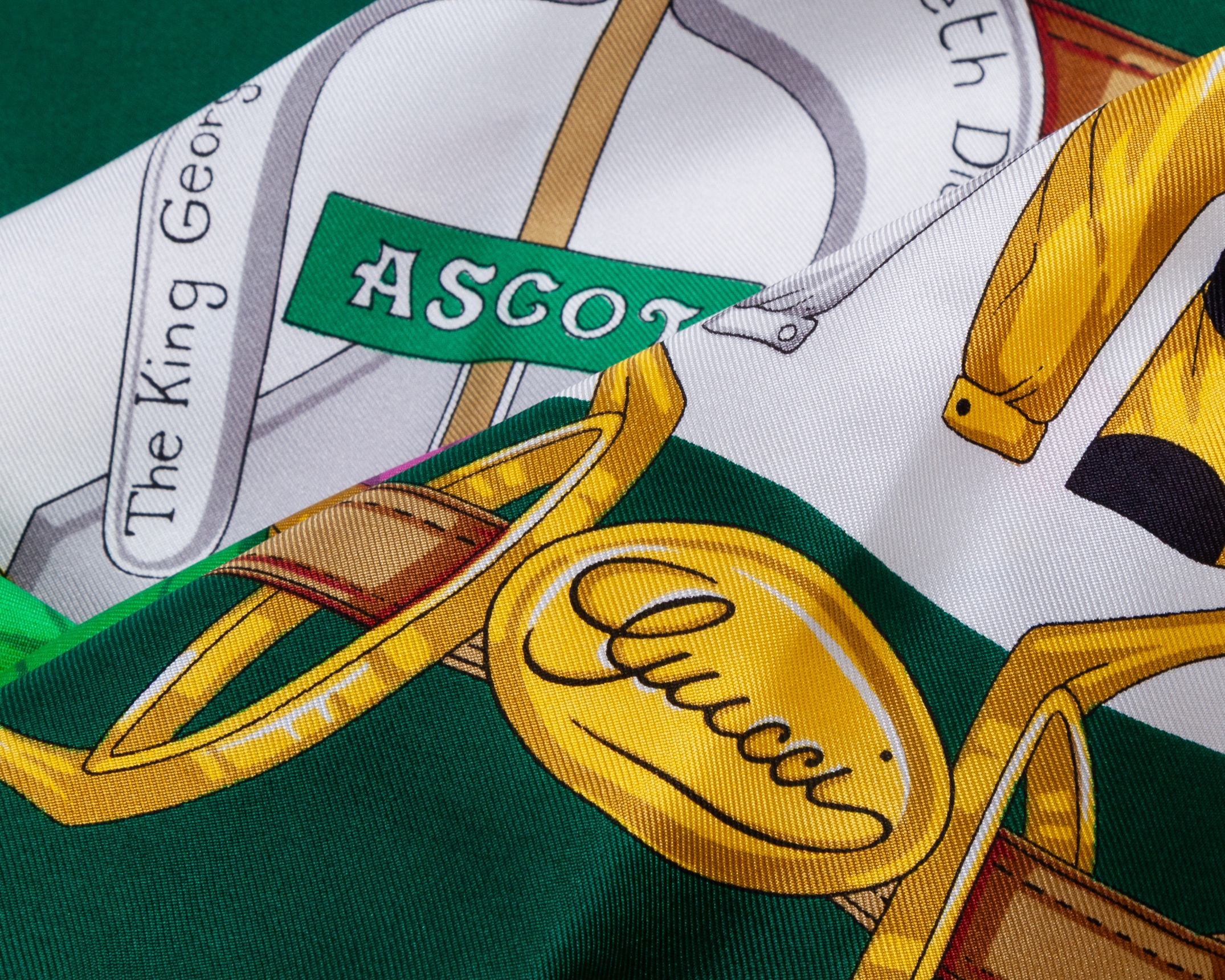 A Gucci ladies Italian silk scarf designed with the winning owners’ colours for Ascot's King George VI and Queen Elizabeth Diamond Stakes between 1951 and 1988,