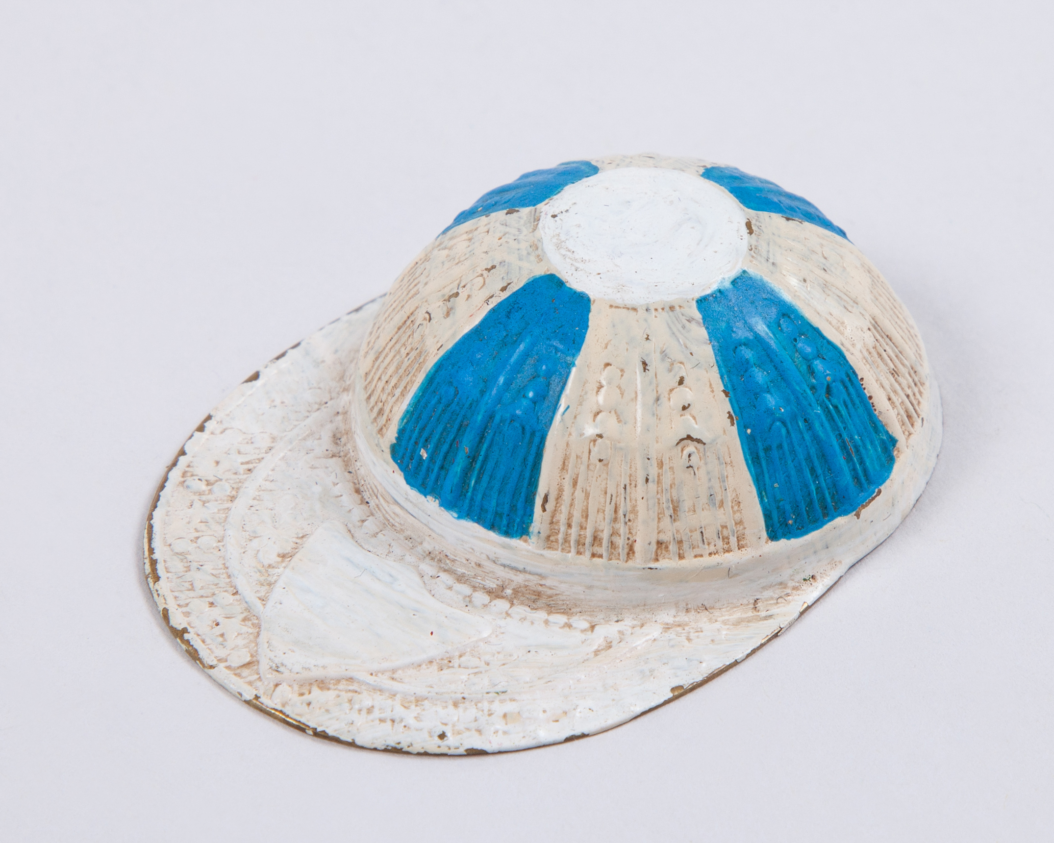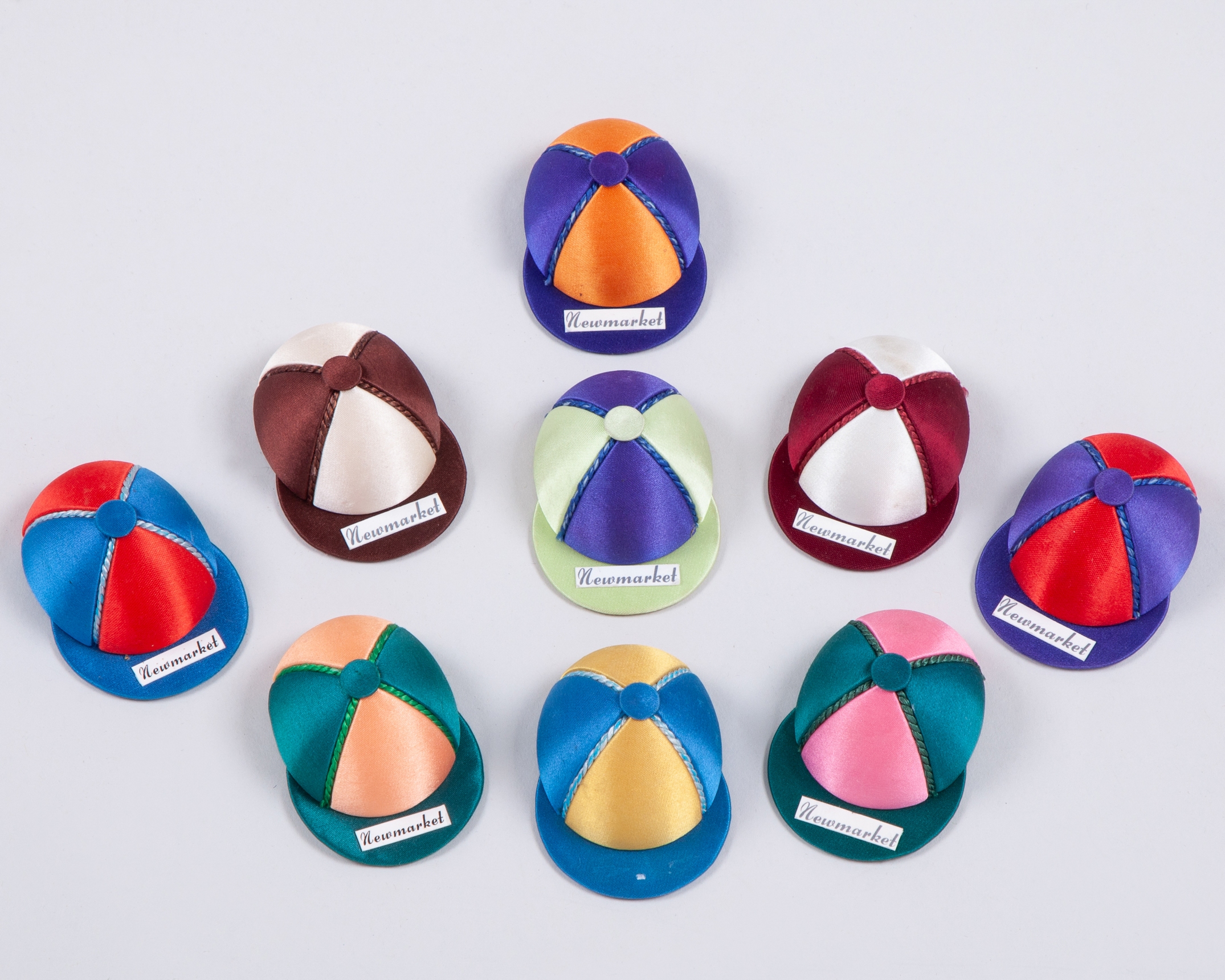 including six in silk dressed horse shoes representing famous racehorse owners including The Aga Khan and Sir Victor Sassoon; nine other being souvenirs of Newmarket by Alan Luker; and a painted brass cap