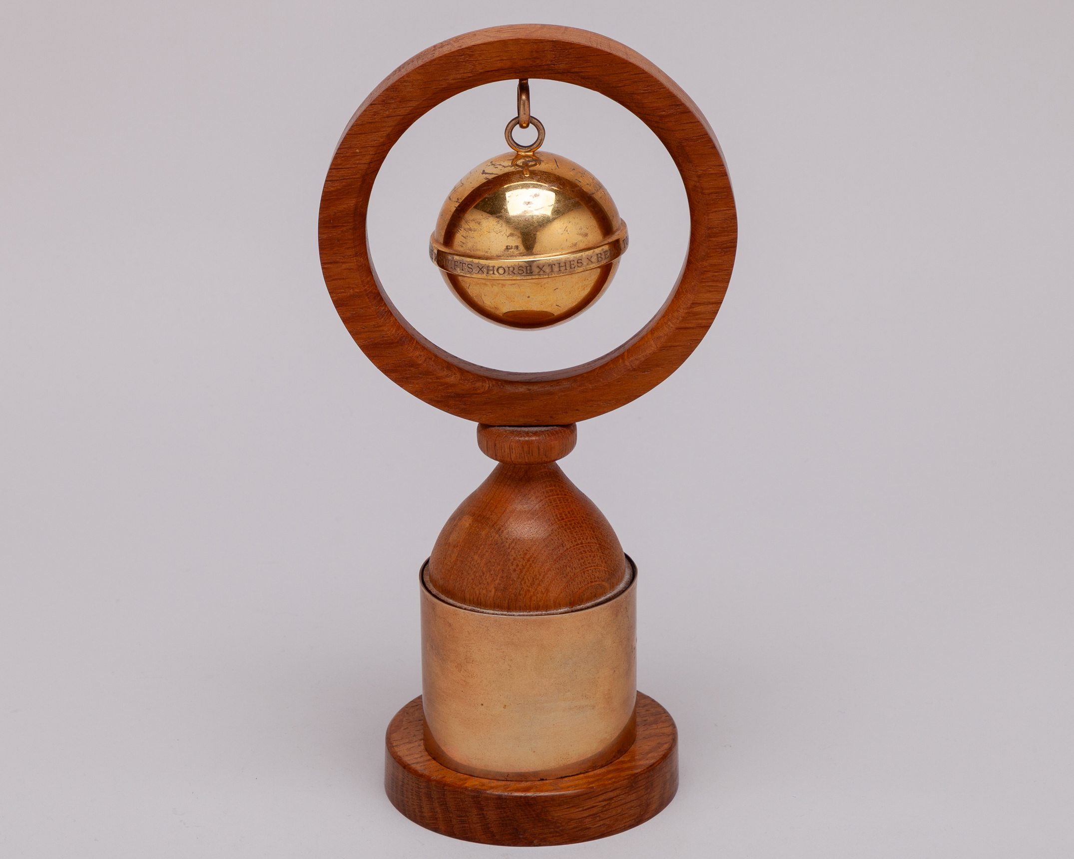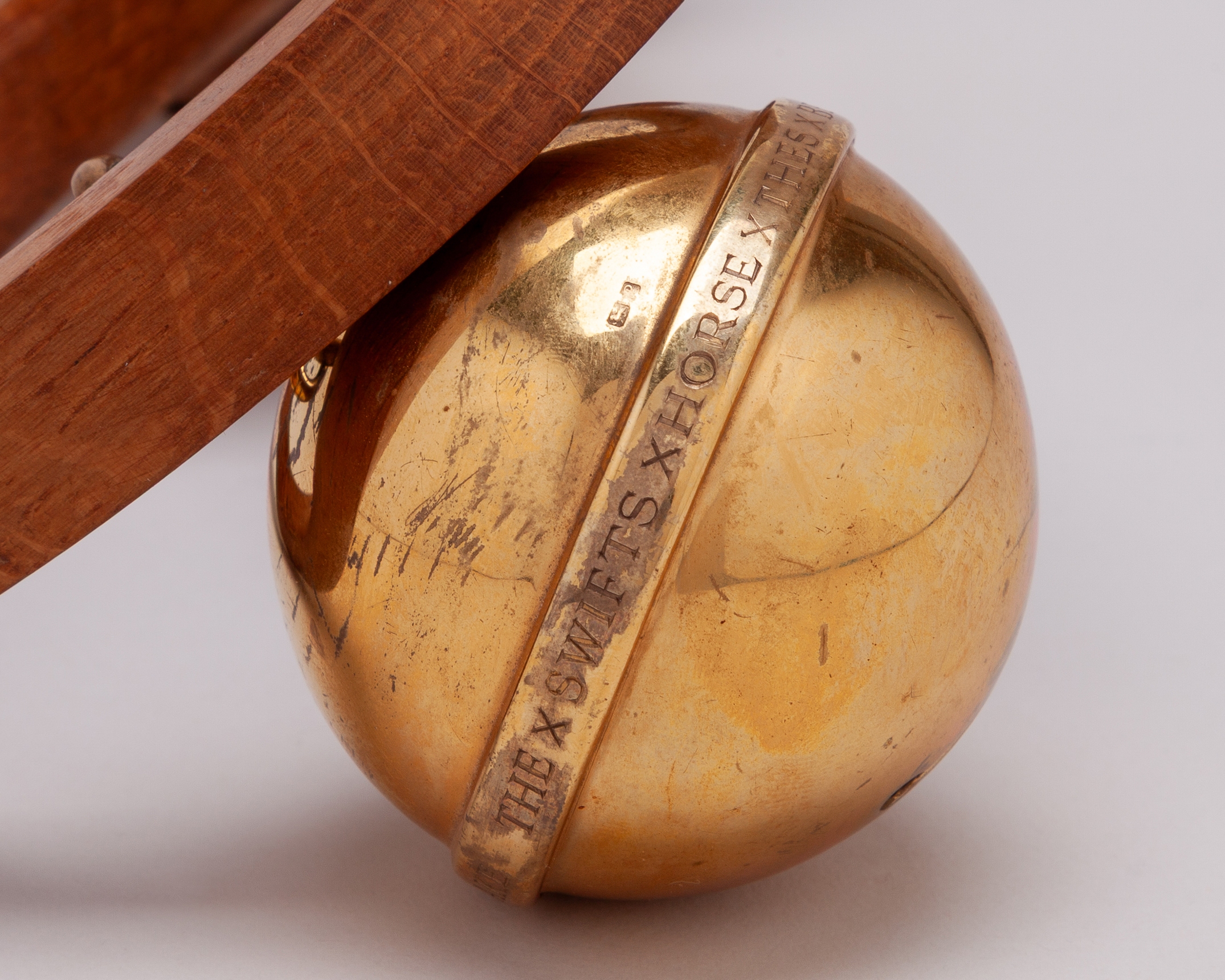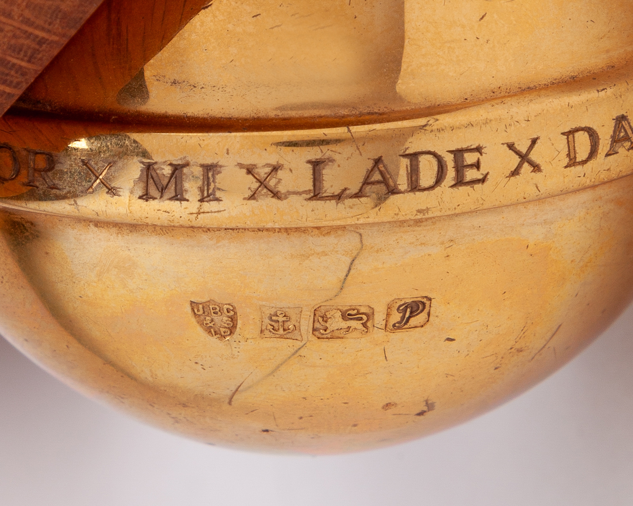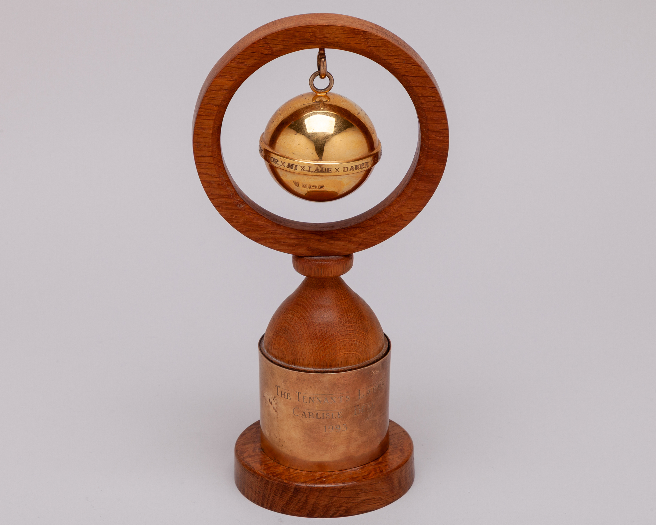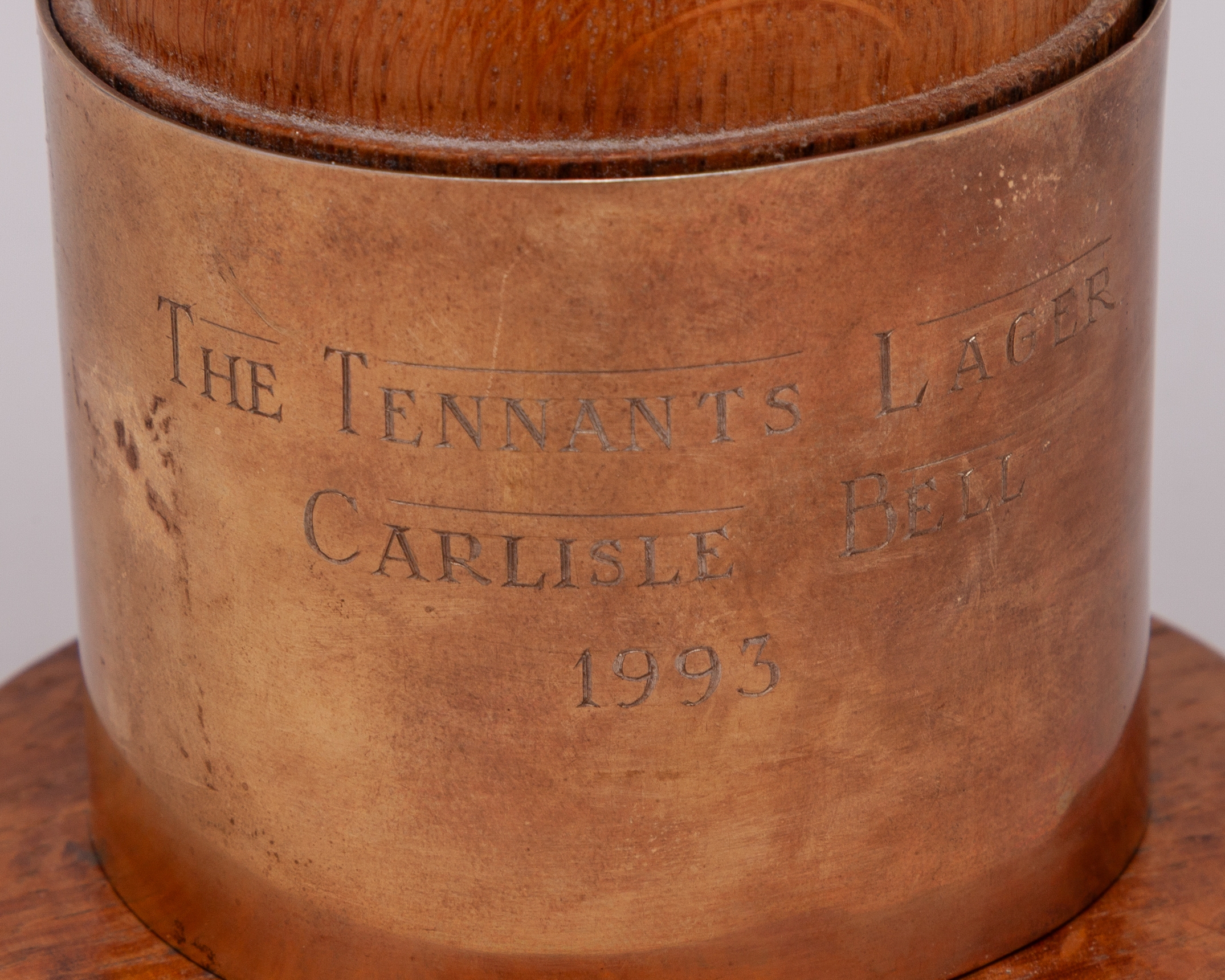 in the form of a replica of the famous horse racing trophy dated 1559 including the bell's inscription THE SWIFTS HORSE THES BEL TO TAK FOR MI LADE DAKER SAKE, the bell in silver gilt hallmarked J. B. Chatterley & Sons Ltd., Birmingham, 1989, the bell hung on a wooden stand, set with a brass band inscribed THE TENNANTS LAGER CARLISLE BELL 1993, height 27cm.