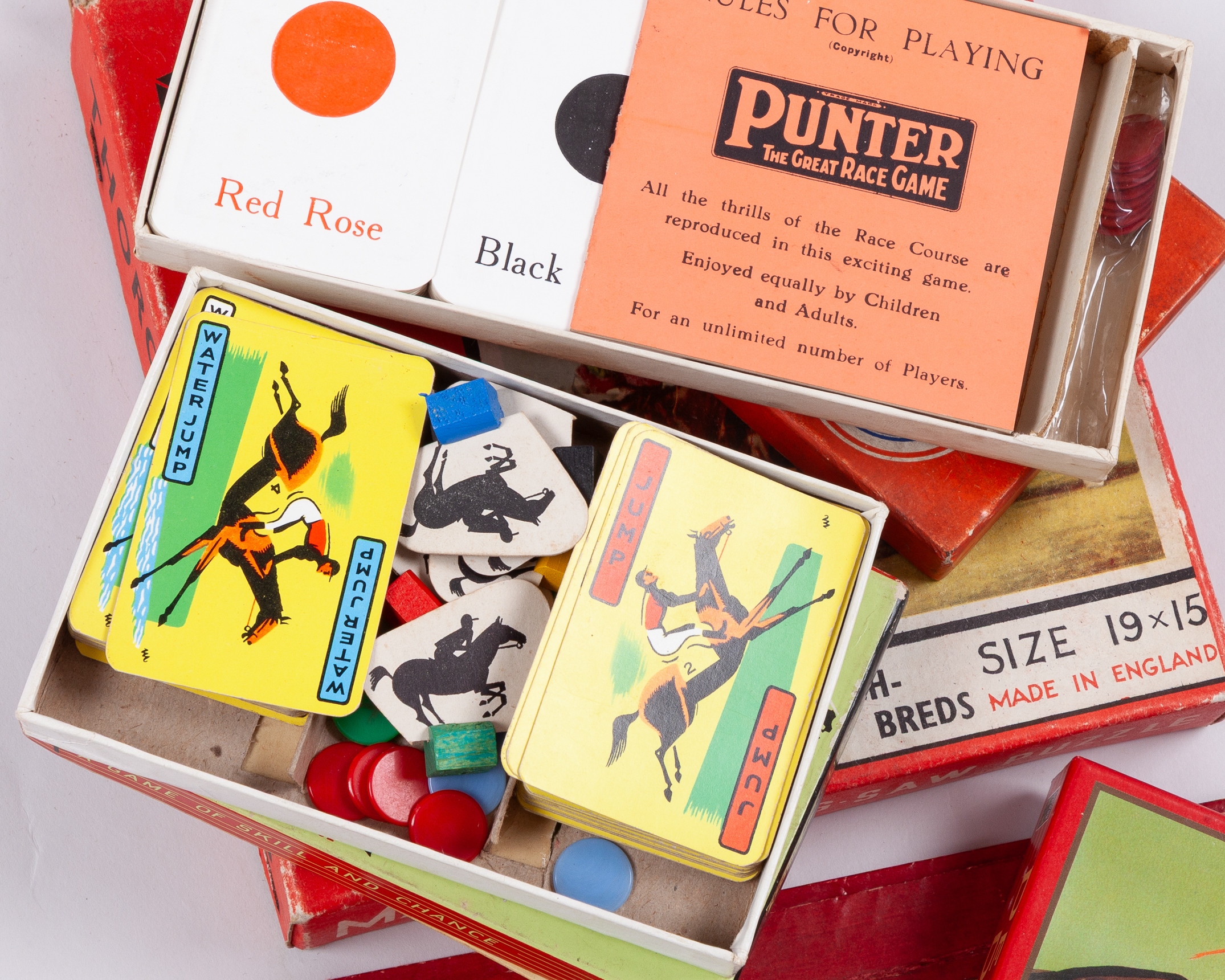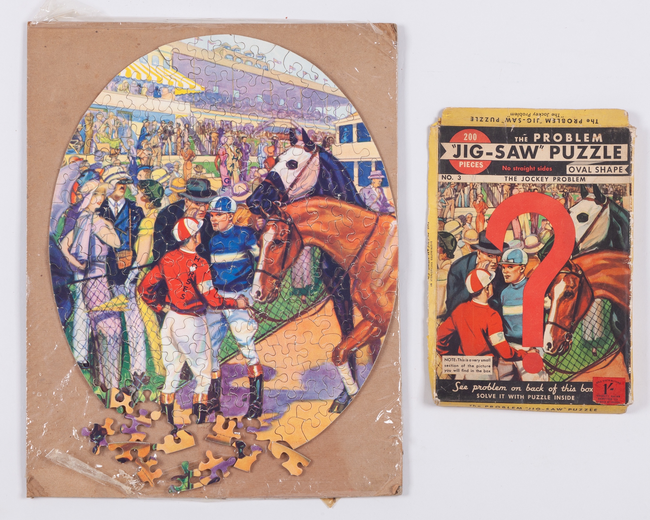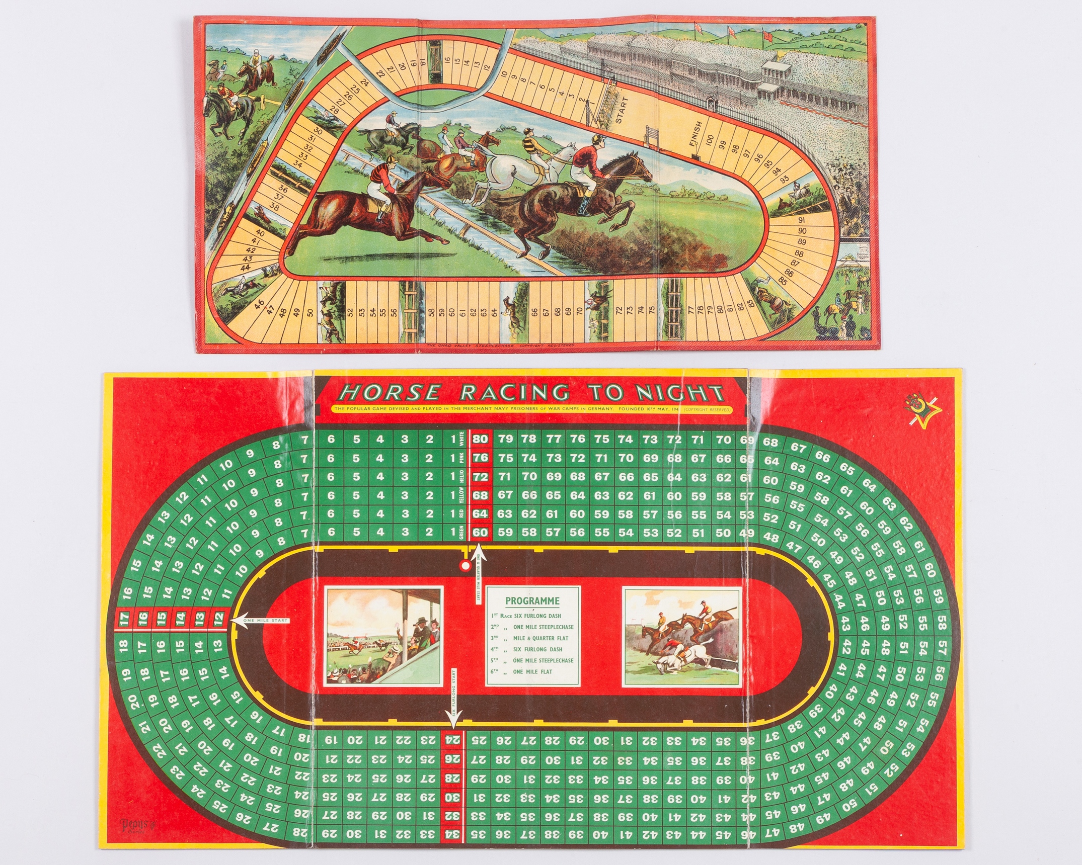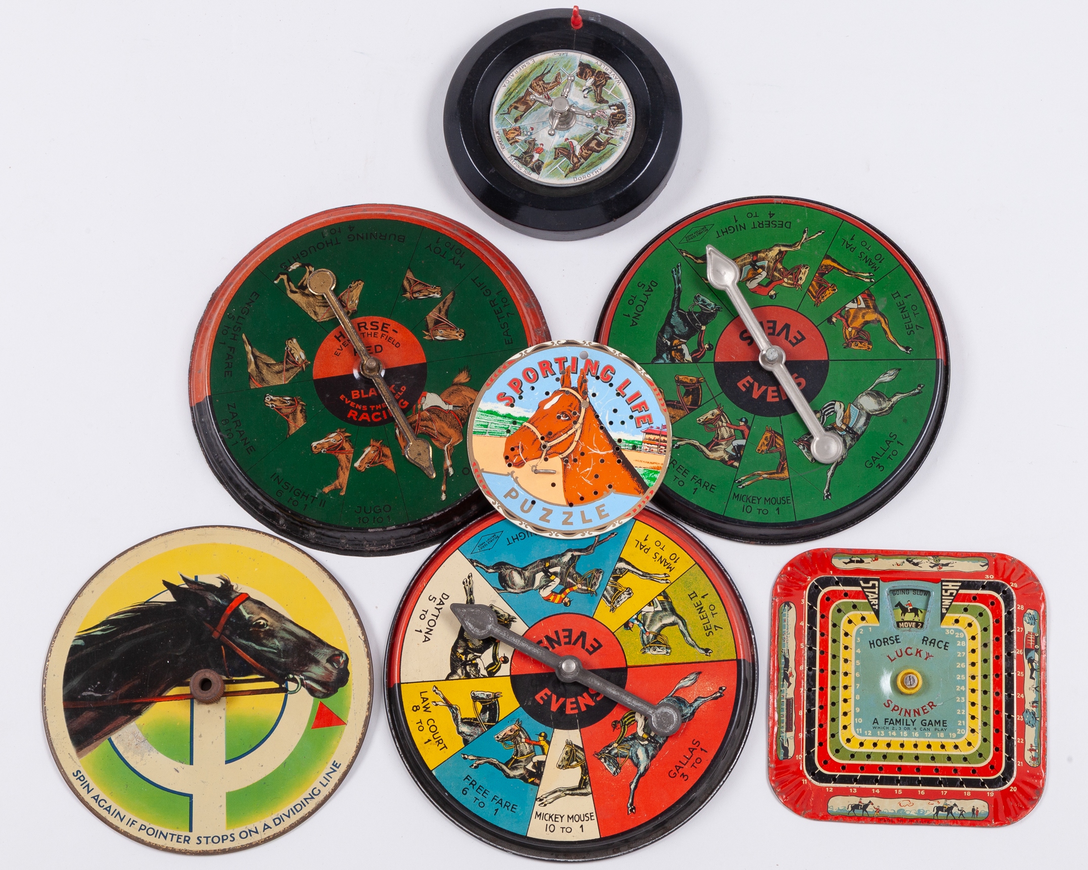 a qty. of painted lead racehorse & jockeys for use in a variety of horse racing games; plus five various playing boards for racing games; offered with six tinplate spinning games; six racing card games; four jig-saw puzzles; and a ring & holes puzzle