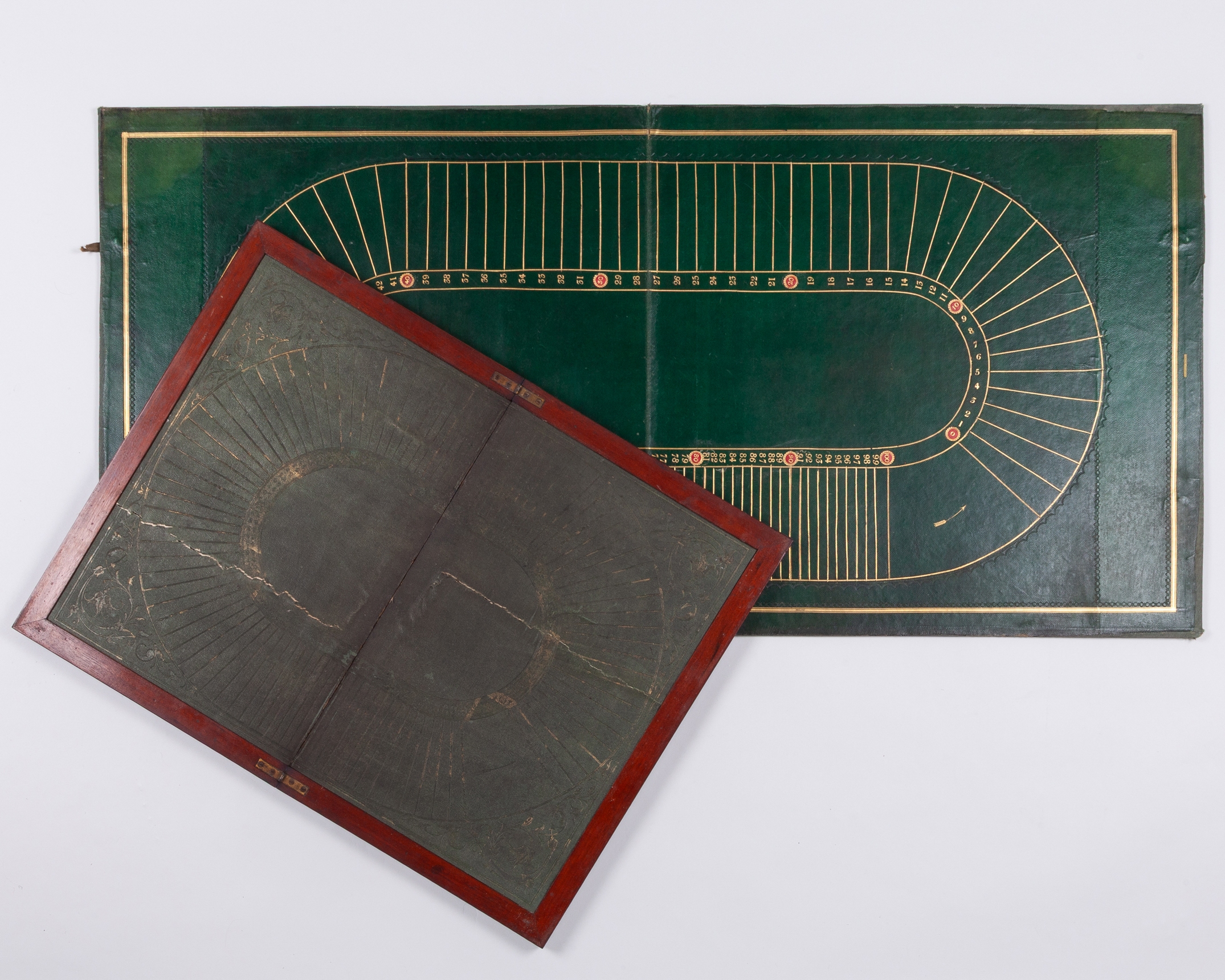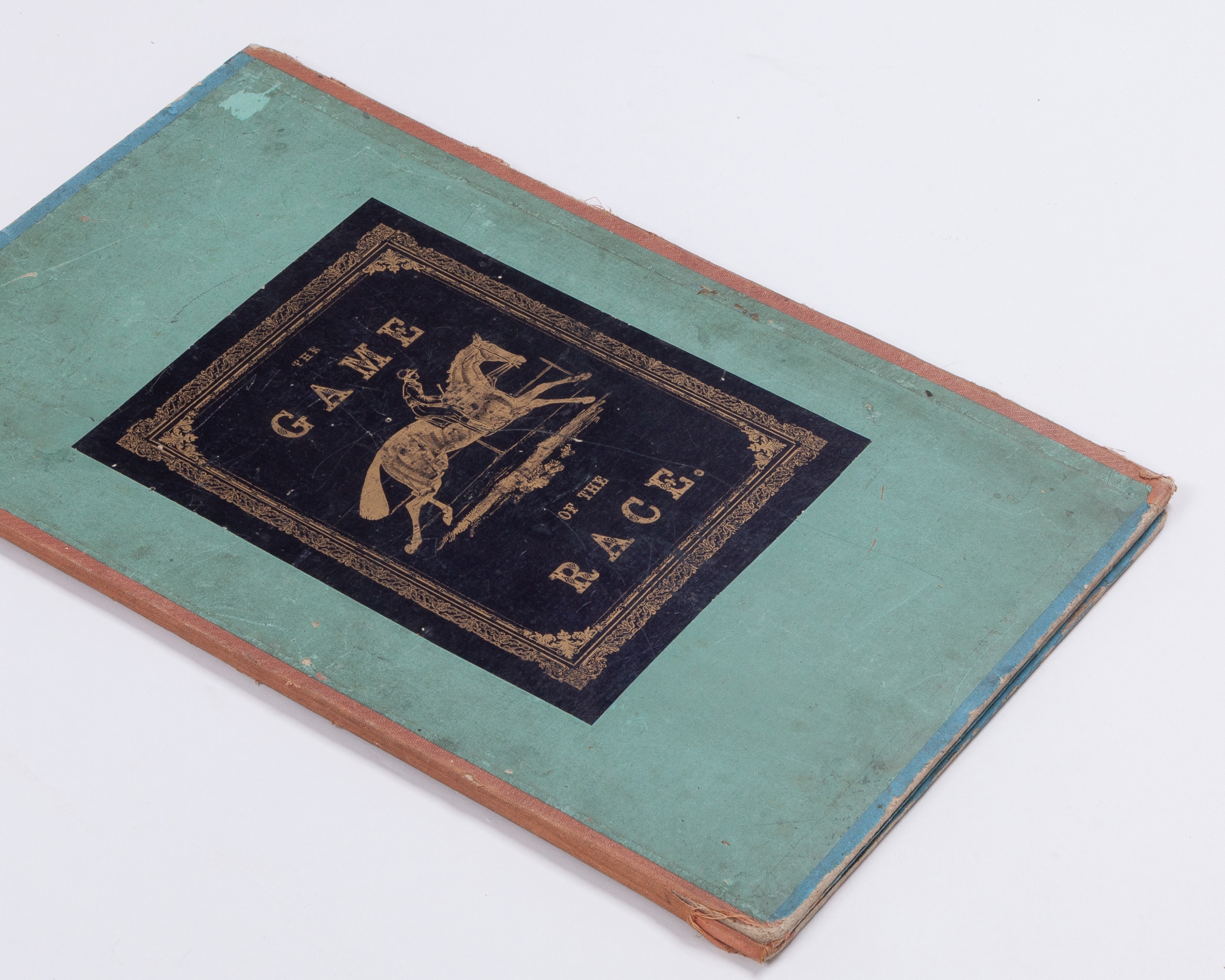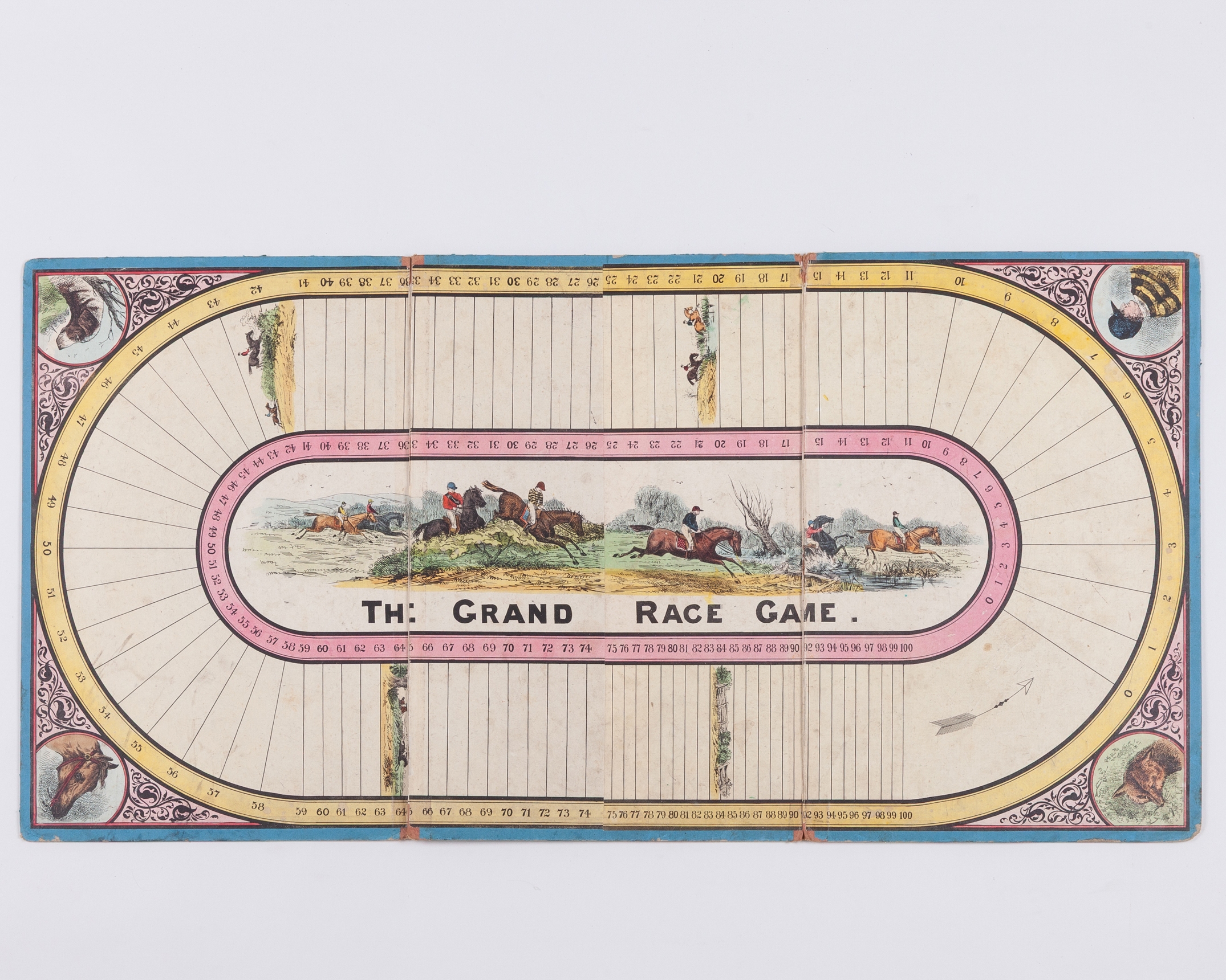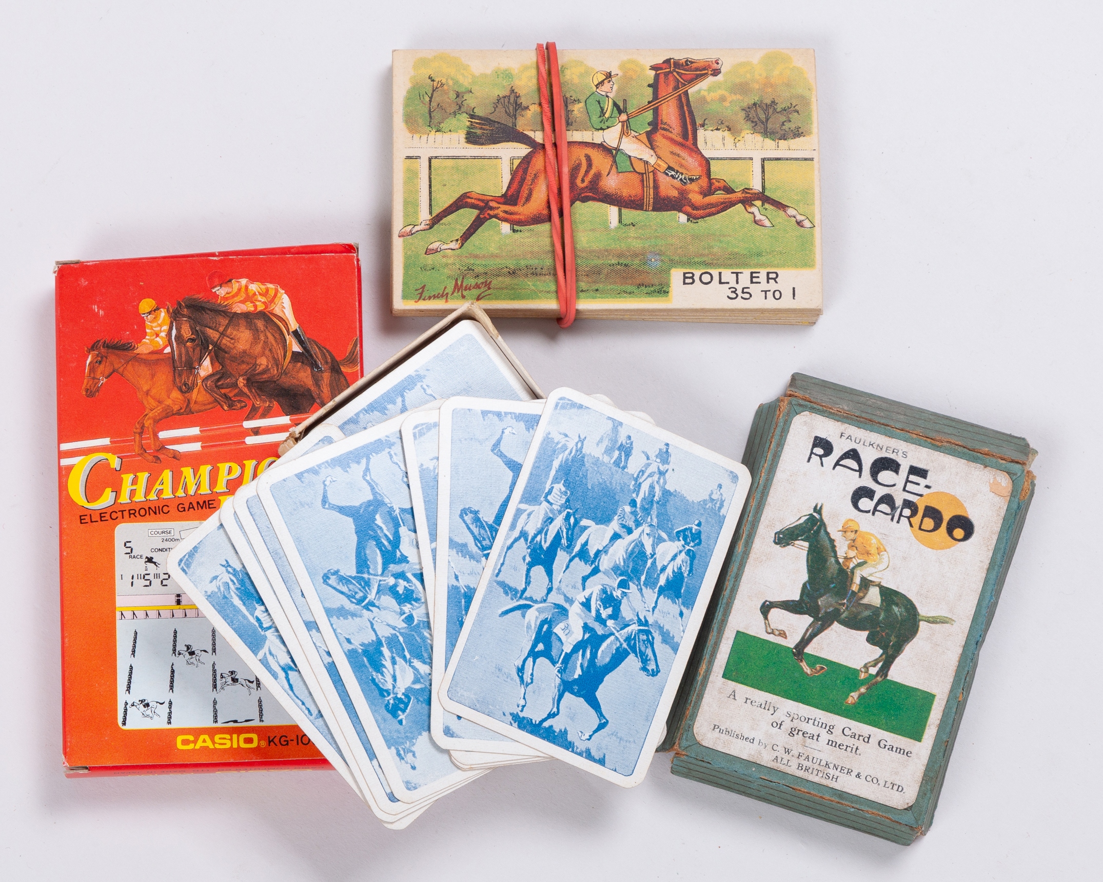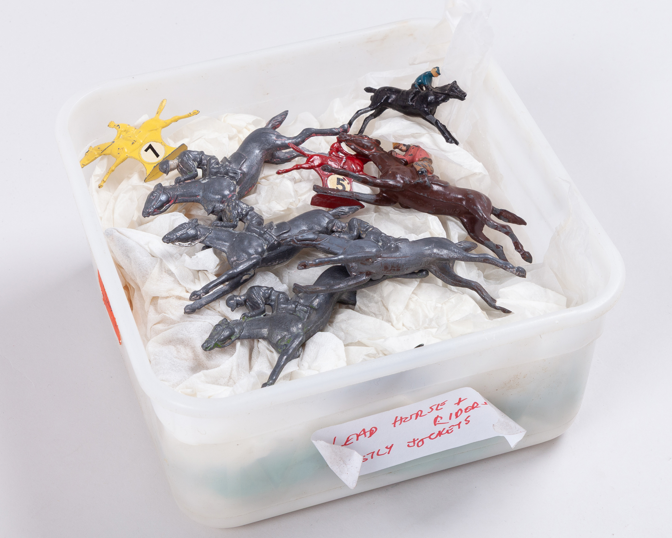 a qty. of painted lead racehorse & jockeys for use in a variety of horse racing games; plus five various playing boards for racing games; offered with six tinplate spinning games; six racing card games; four jig-saw puzzles; and a ring & holes puzzle