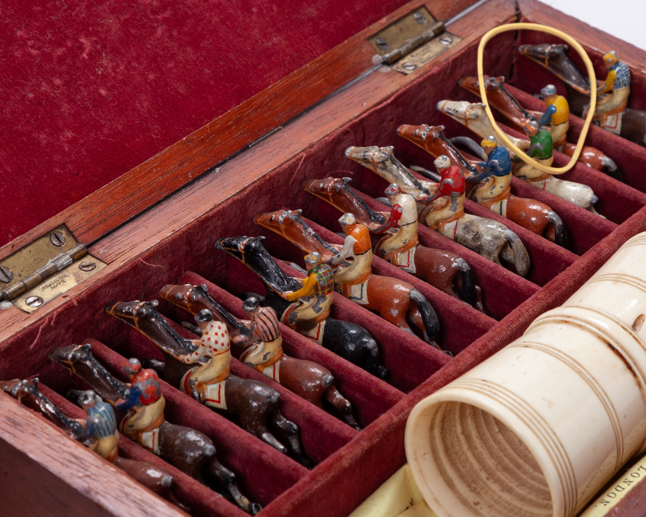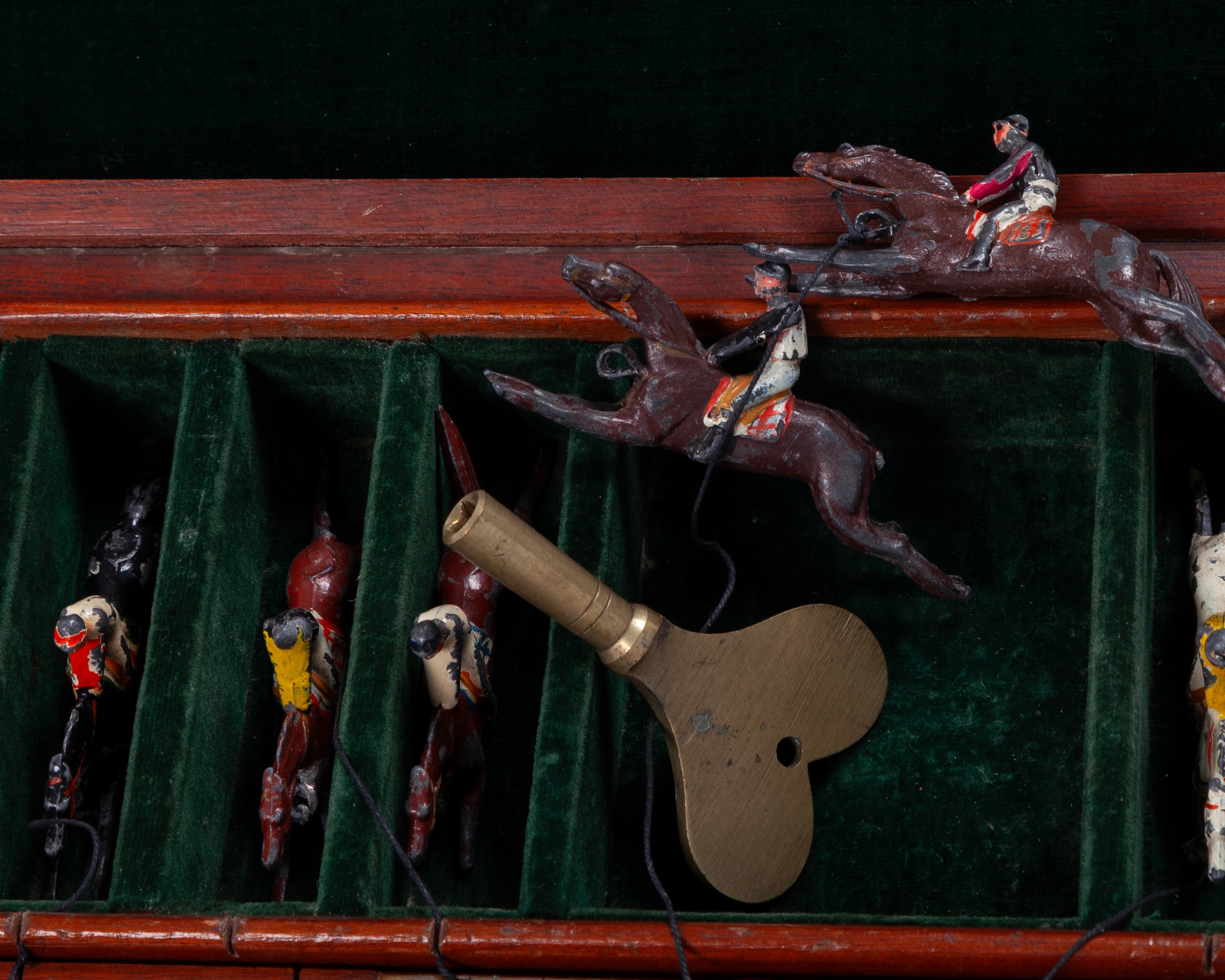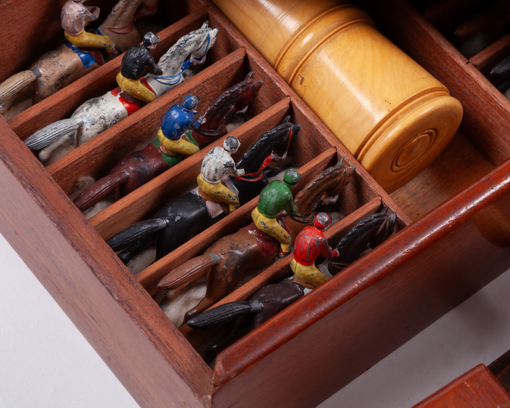 two ‘Ascot The New Racing Game’ by J Jacques & Son Ltd, one a manual wind-up version the other clockwork, painted lead horses & jockeys propelled along the track by thread; together with an empty box for the wind-up version; the lot also including Merry's “Game of Race”, containing 12 lead horses, dice & tumbler, and printed rules & literature; and a German version very similar the Merry's game, with rules in German language; sold together with a wooden cribbage board with racehorse decoration