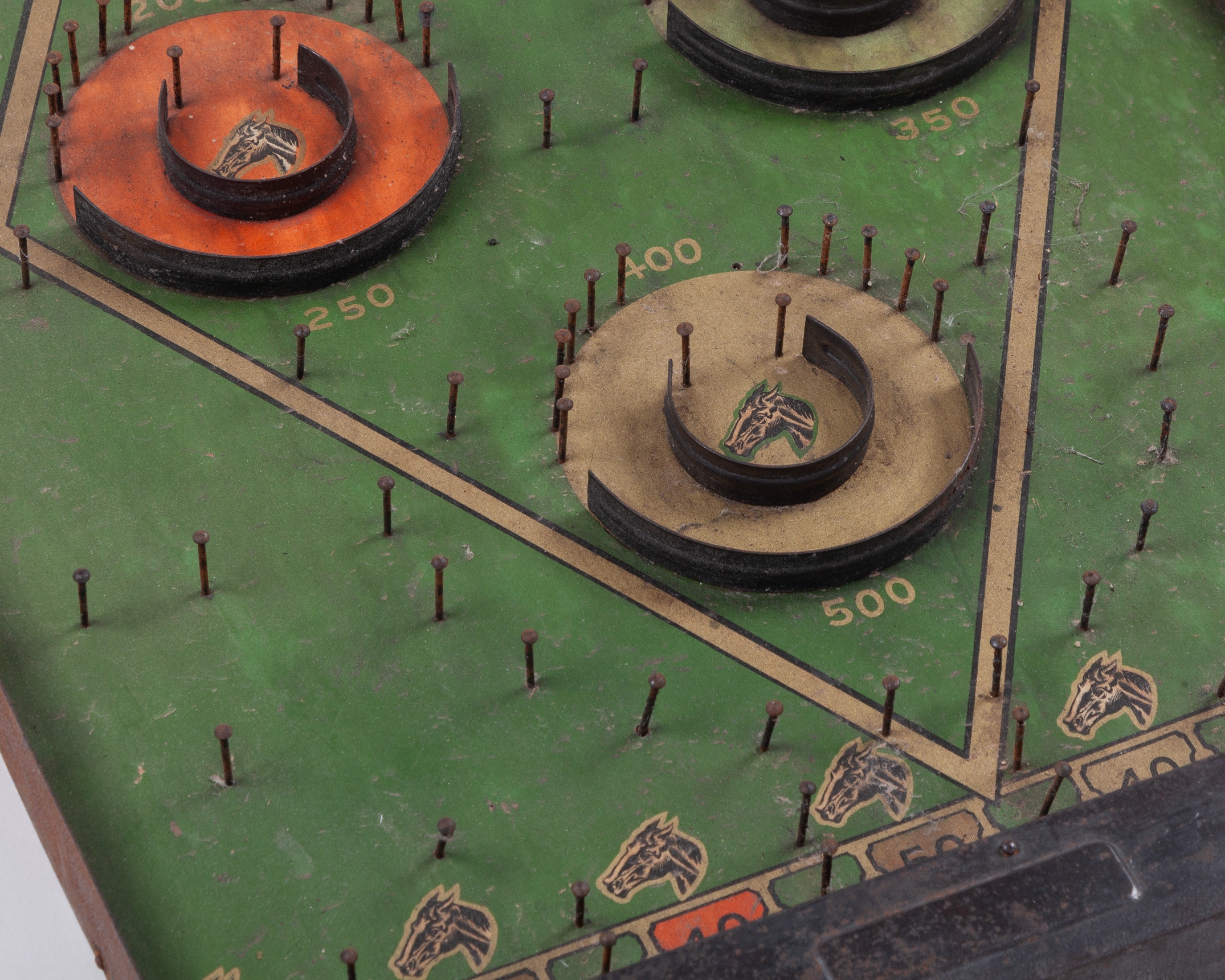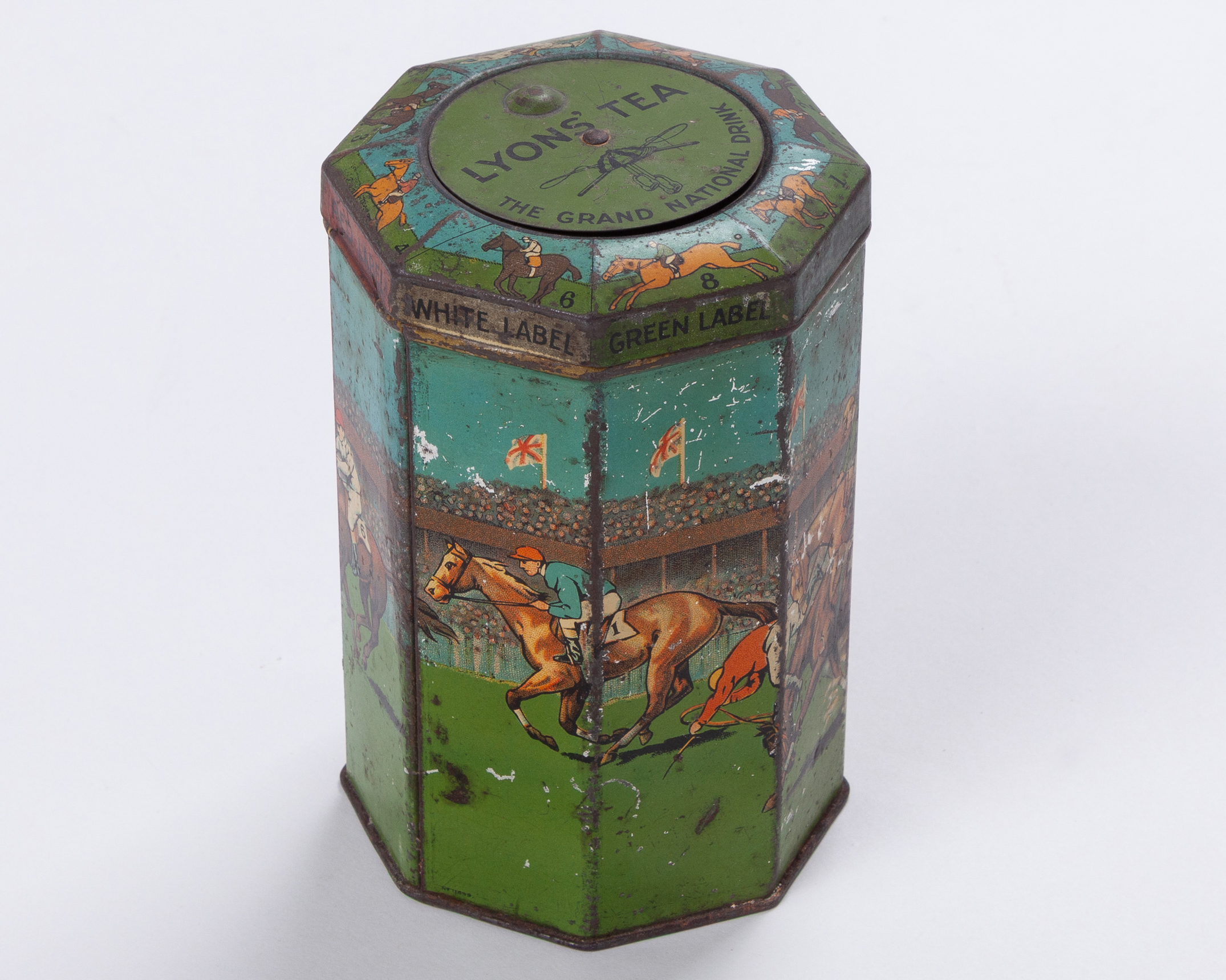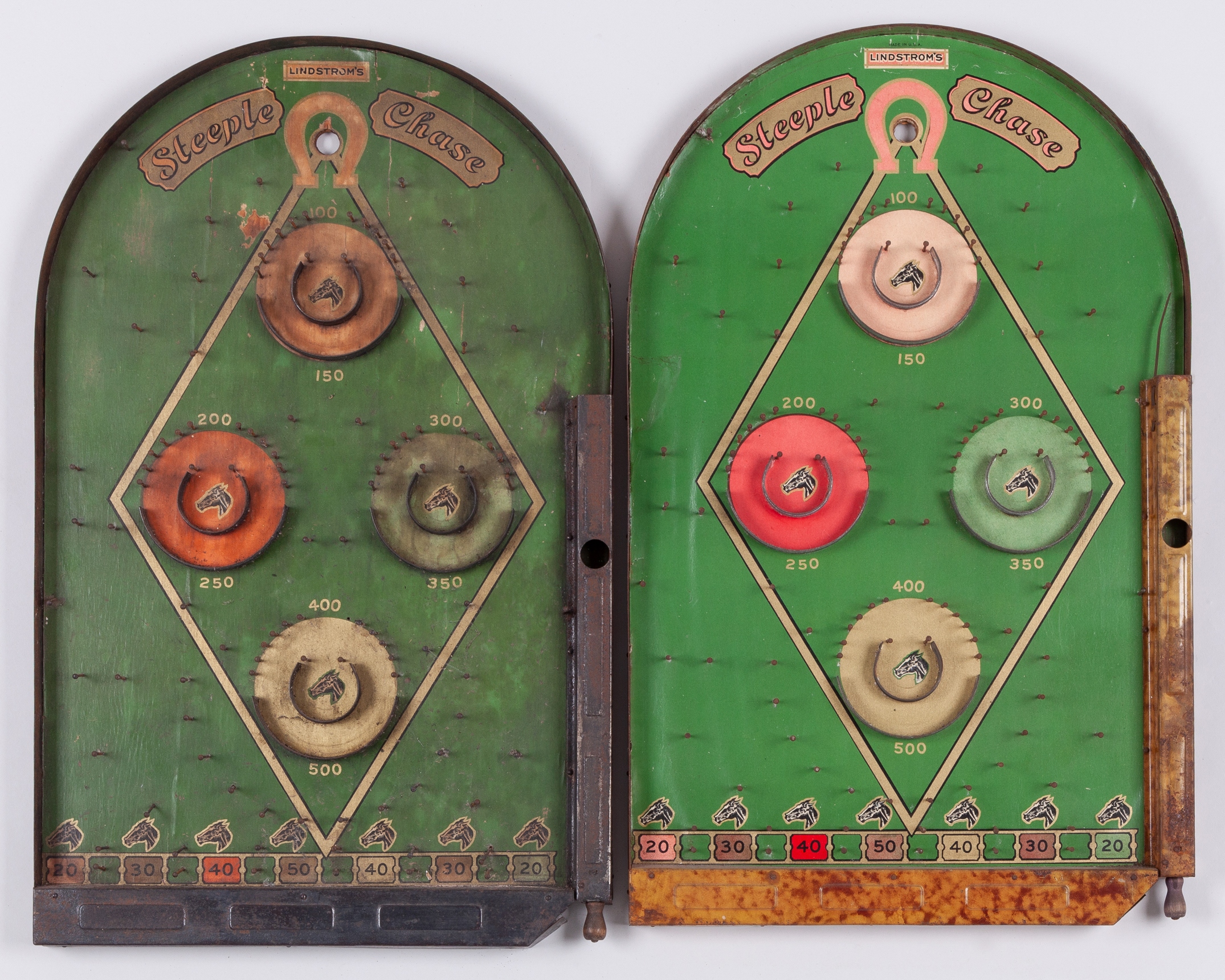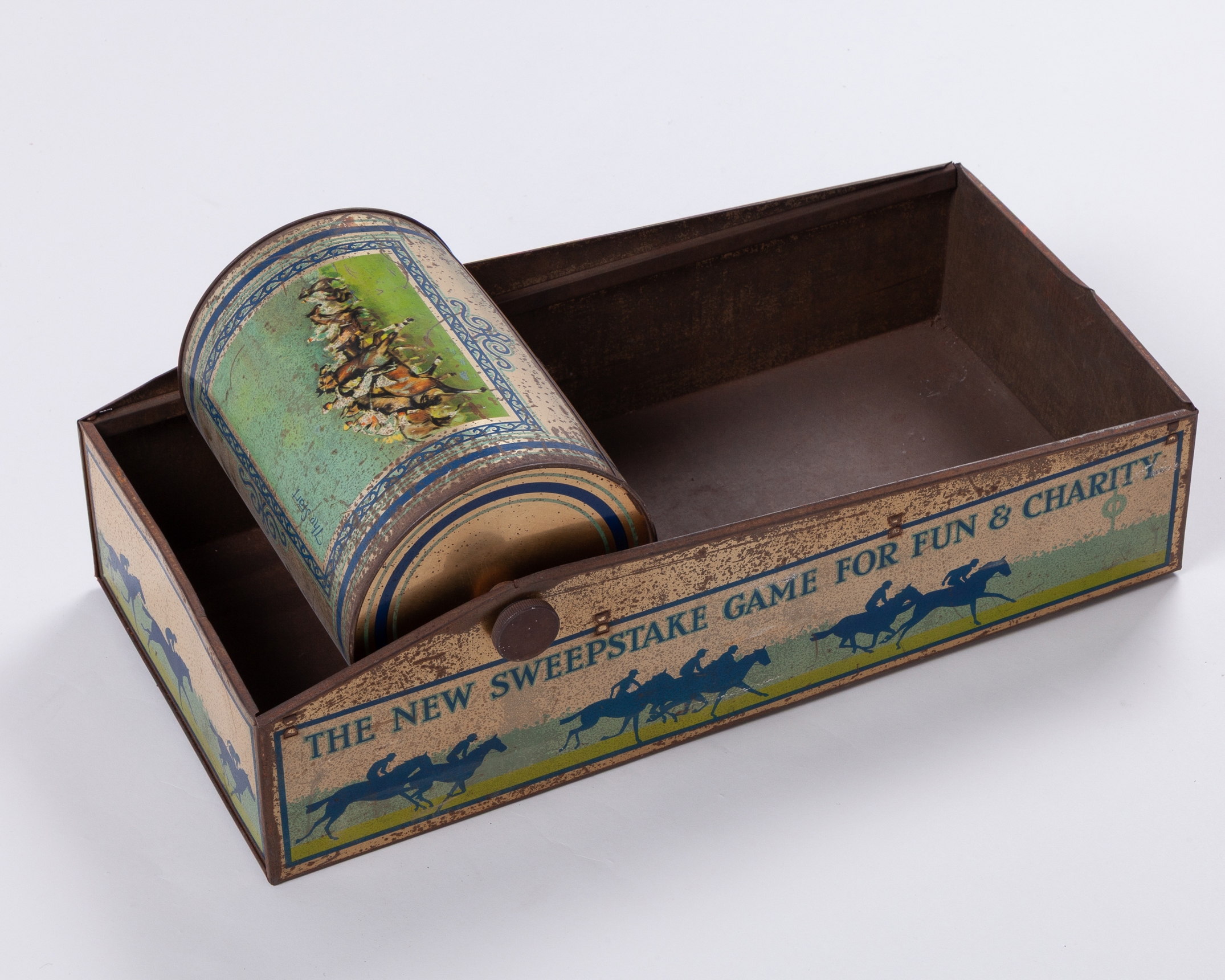 ‘The New Sweepstake Game for Fun and Charity", decorated with an image of the Prince of Wales’s 1900 Triple Crown winner ‘Diamond Jubilee’; offered with two racing-themed 1930s bagatelles Lindstrom’s 'Steeple Chase'; and a Lyons tea caddy with spinning game top