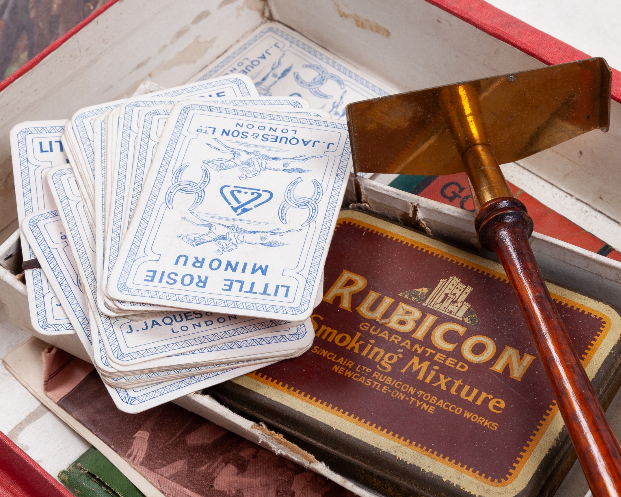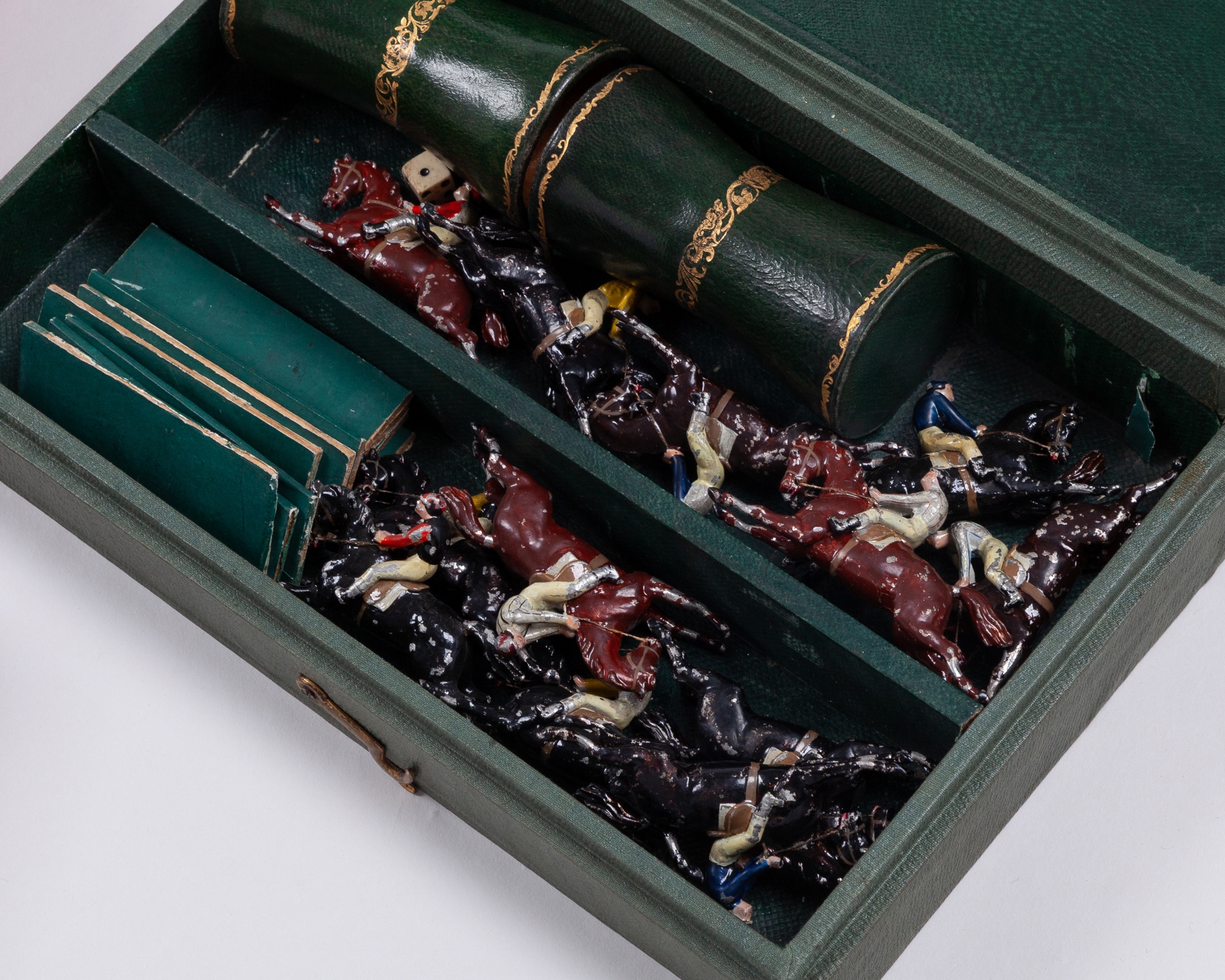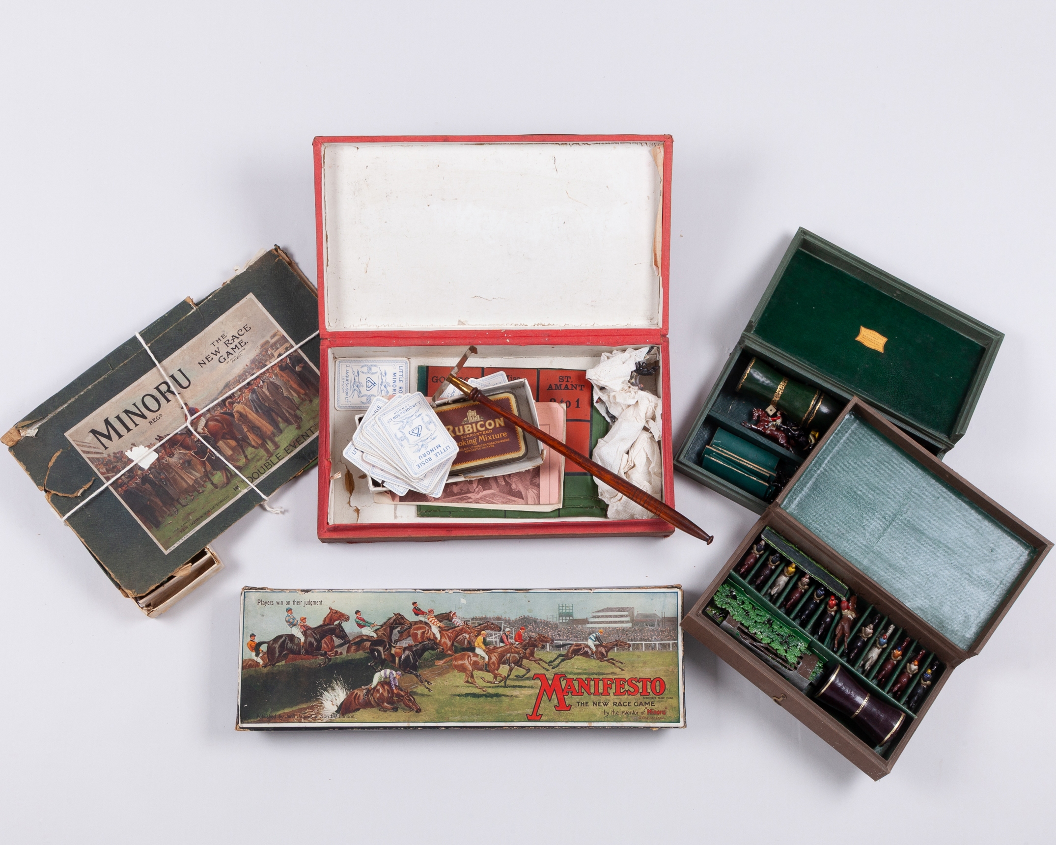 both containing painted lead racehorses & jockeys, the first with label for James Izzard's Junior Repository, the wooden divisions for separating the horses in the box are present but detached; the other unmarked but containing in tact wooden divisions and also lead course scenery; offered with a boxed ‘Manifesto’ horse racing games (box distressed); and two boxed ‘Minoru’ games, both titles by J. Jacques of London