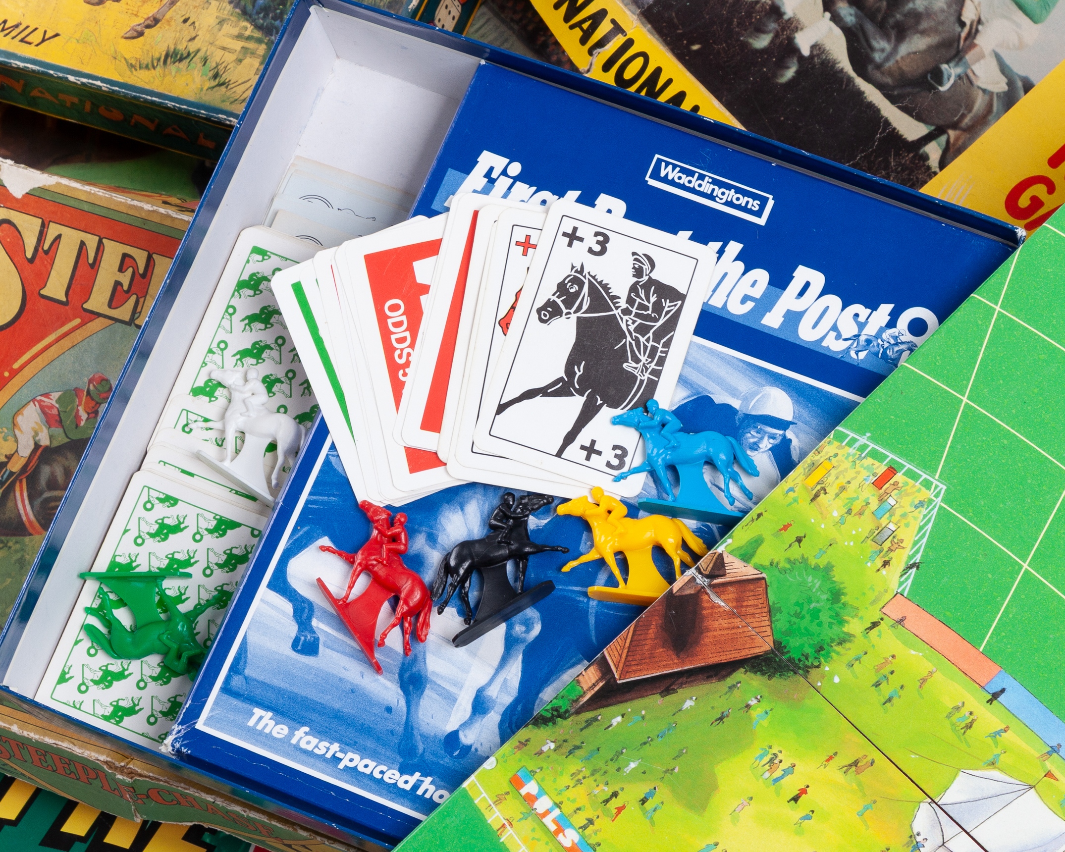 two Totopoly by Waddington; Grand National Steeplechase; Steeplechase by Chad Valley; Ji Giuoco delle Corse by Spear Italia; Steeplechase - Ilex Series; Waddington Steeplechase; Grand National by Philmar; Steeple-Chase by Harlseden Series; Flutterette, Flutter-Met Games; Horse Racing To-Night, Pepys Series; And They're Off - A Really Useful Game; and First Past the Post by Waddington