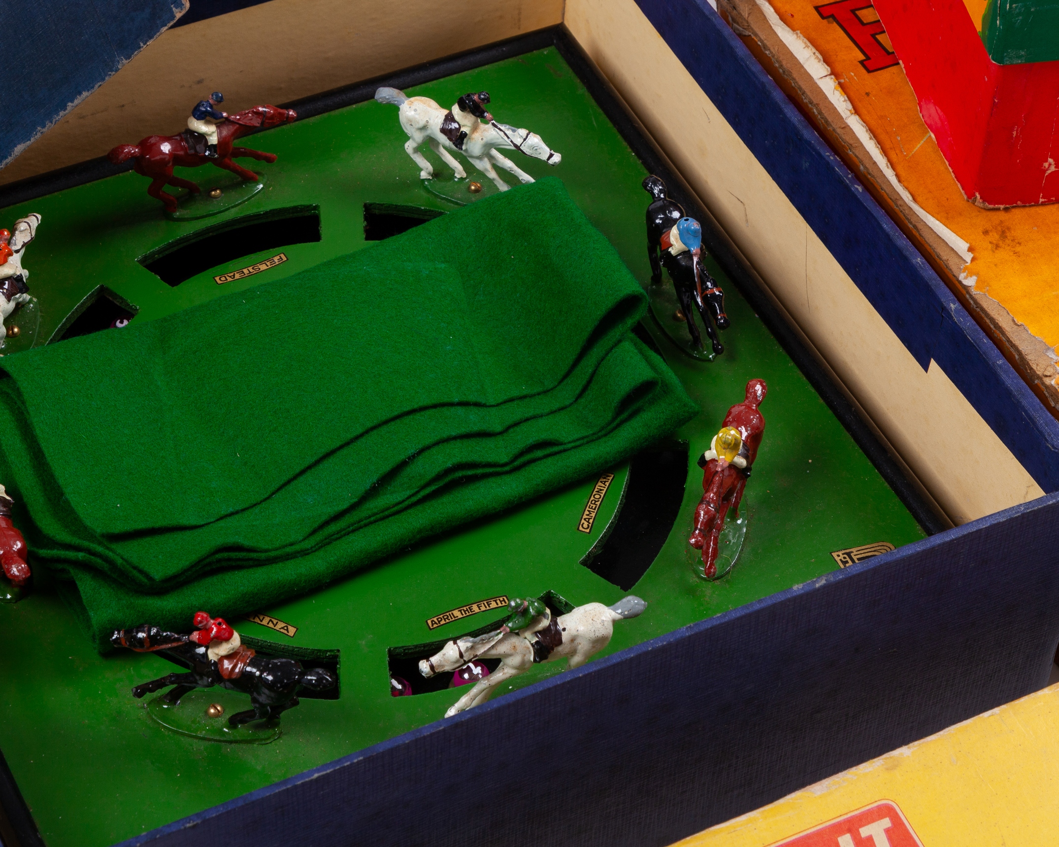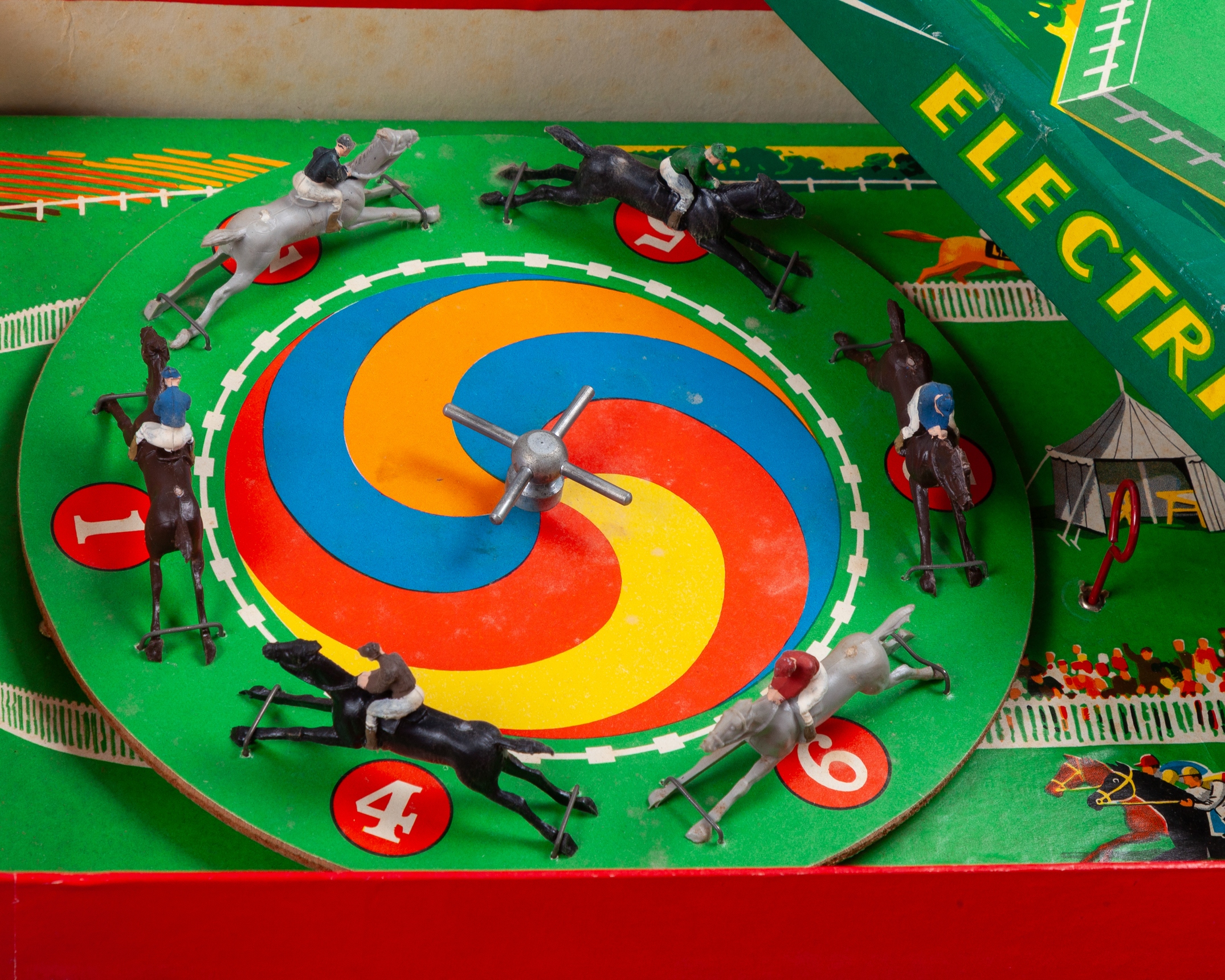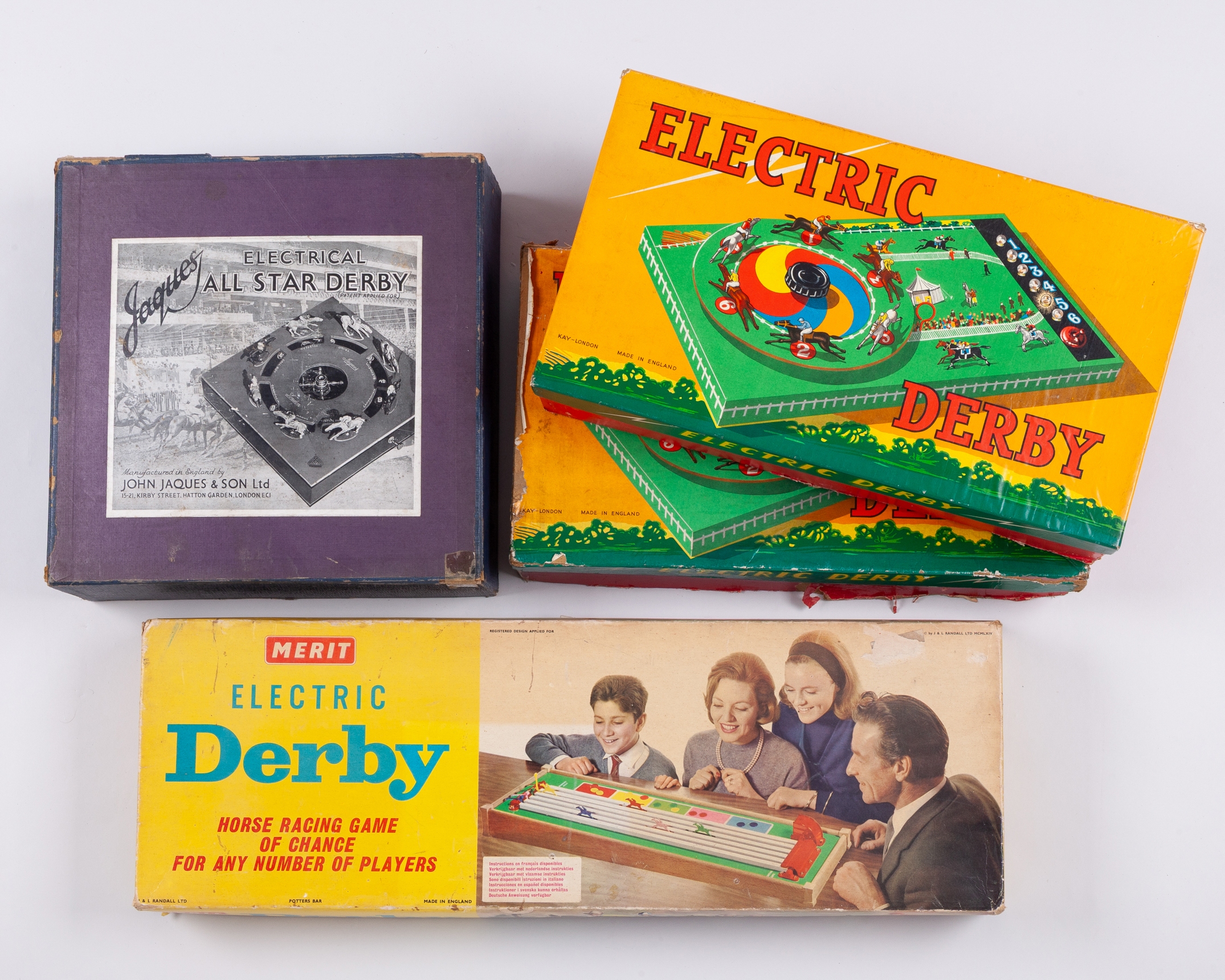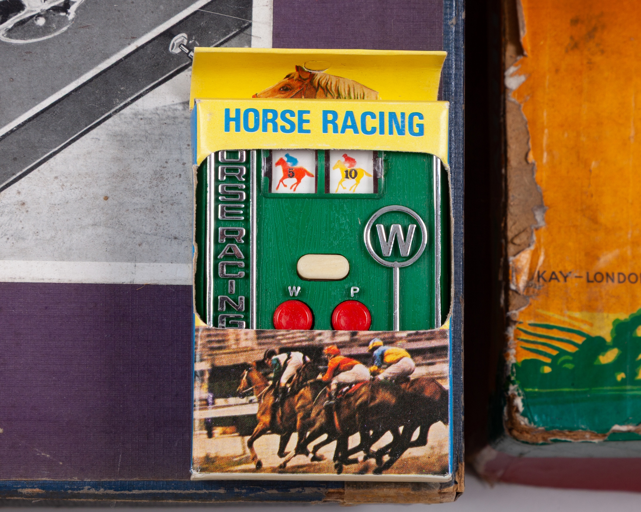 Merit Electric Derby; Kay Electric Derby (two); Jacques Electrical All Star Derby; a battery powered pocket size horse racing game; and the frontage for an arcade game “Foto Finish”